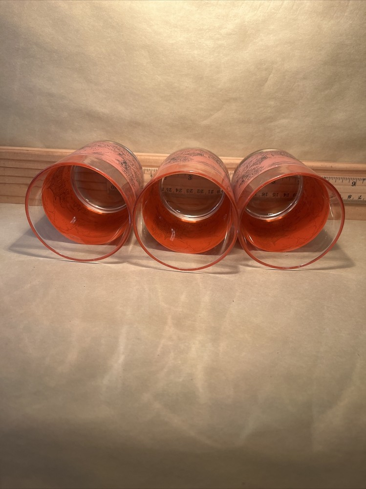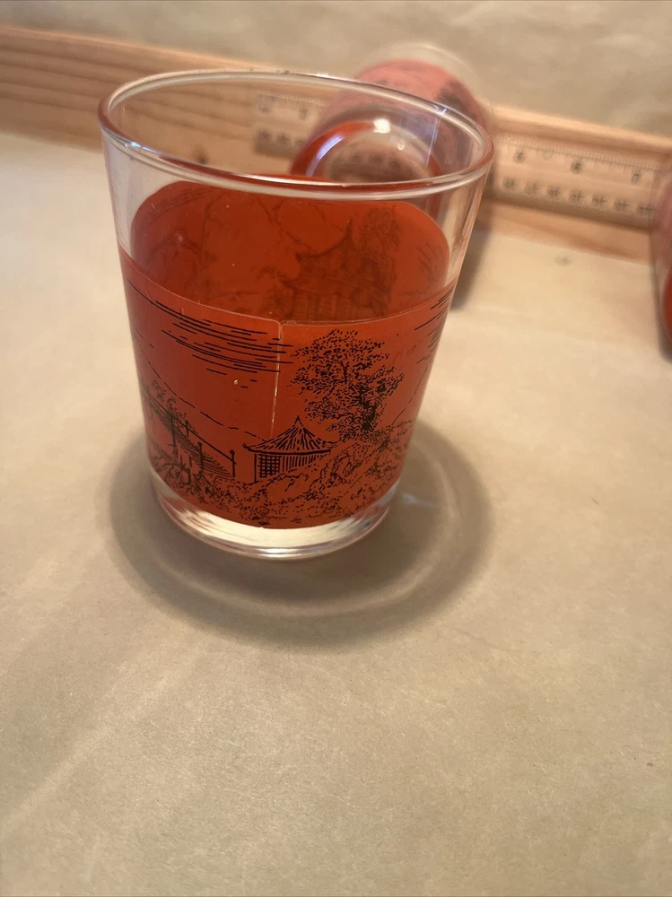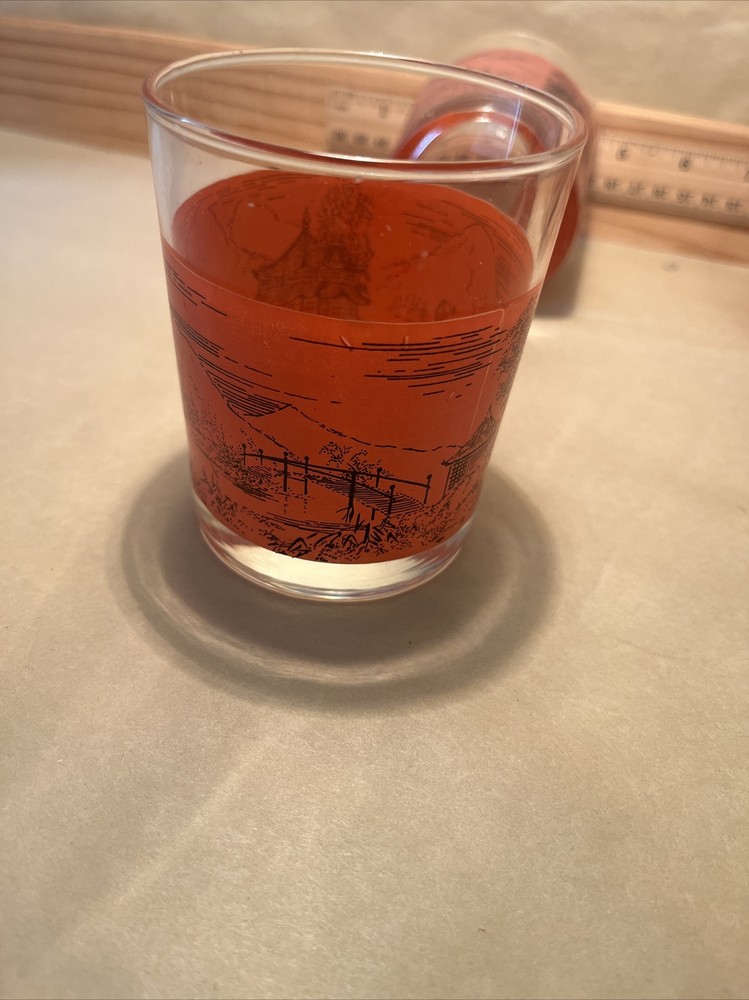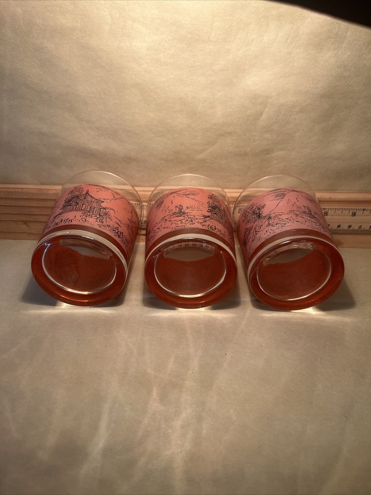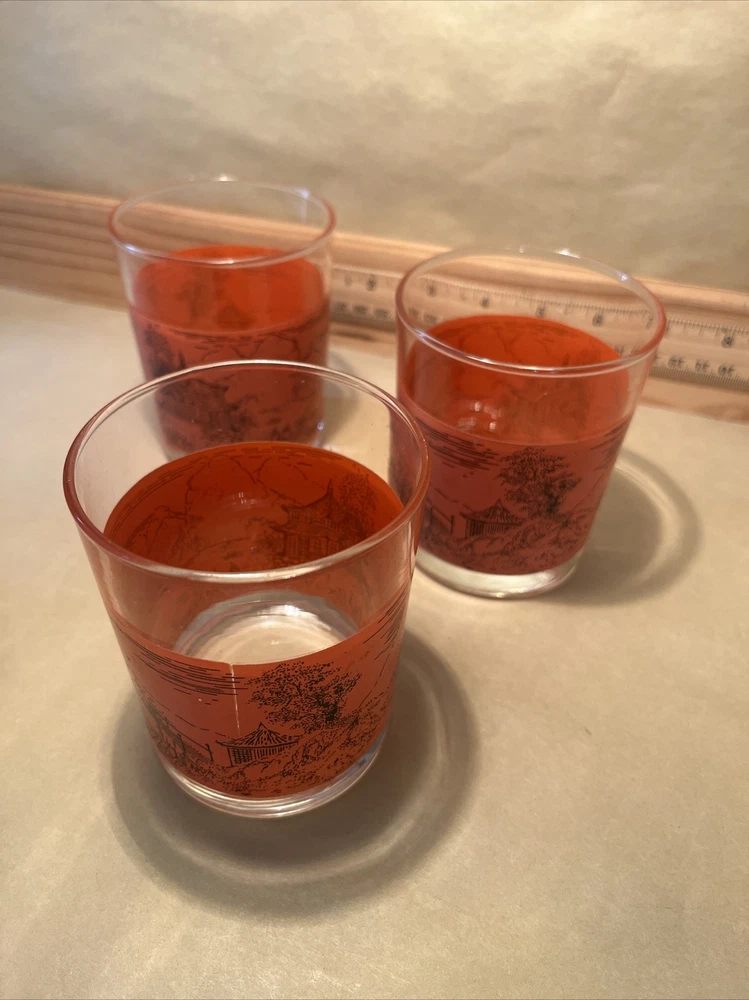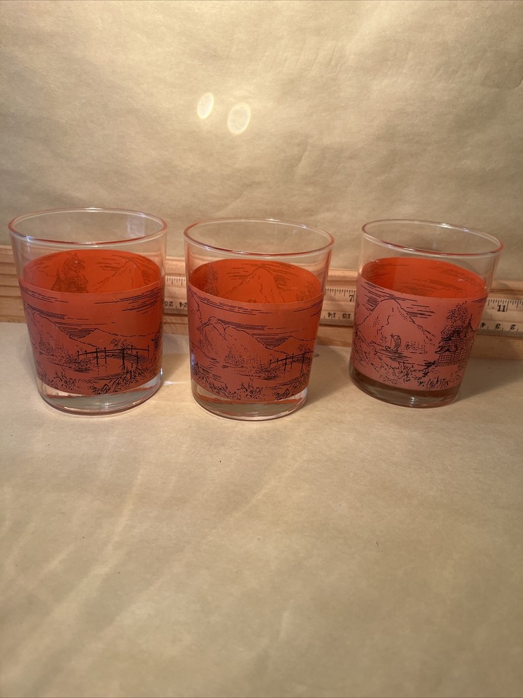 Enhance the elegance of your bar with these vintage mid century oriental landscape orange glasses. These pieces of art are crafted from glass and have an enchanting Japanese theme. The alluring color of orange adds a bold beauty to the glassware making it perfect for serving cold beverages. These glasses are an original, licensed reproduction from the 1950s and can hold an unknown amount of your favorite cocktail. A must-have for any collector or glassware enthusiast. 3 piece set, some possible scuffing no chips