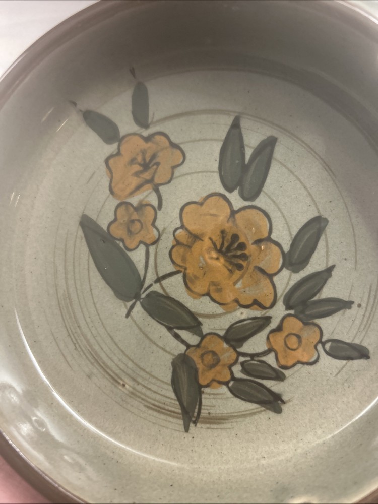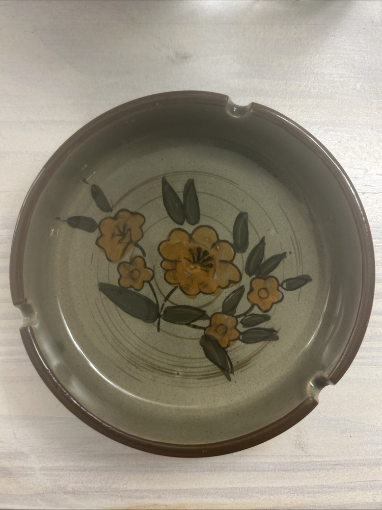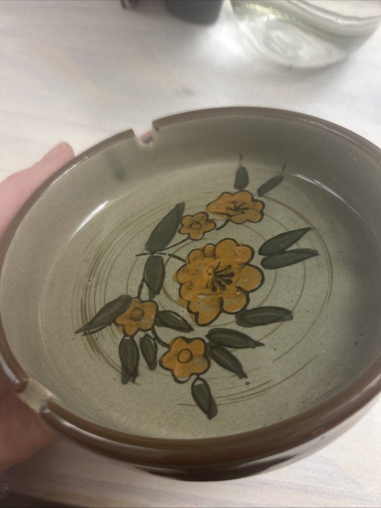 This vintage mid-century porcelain ashtray measures 5 inches in diameter and features a hand-painted orange floral design. It is categorized as a table ashtray. The intricate floral pattern adds a touch of retro charm to this collectible piece.