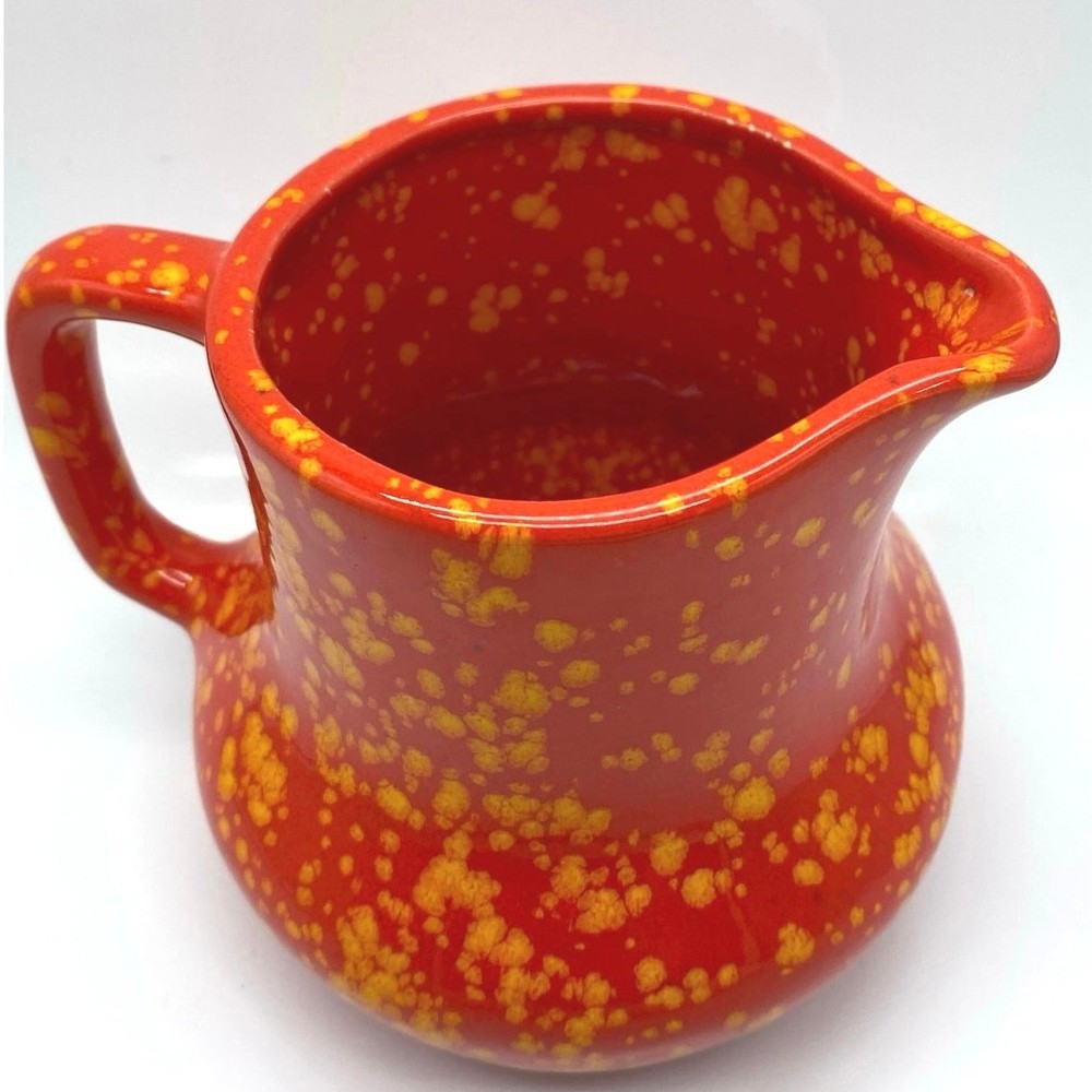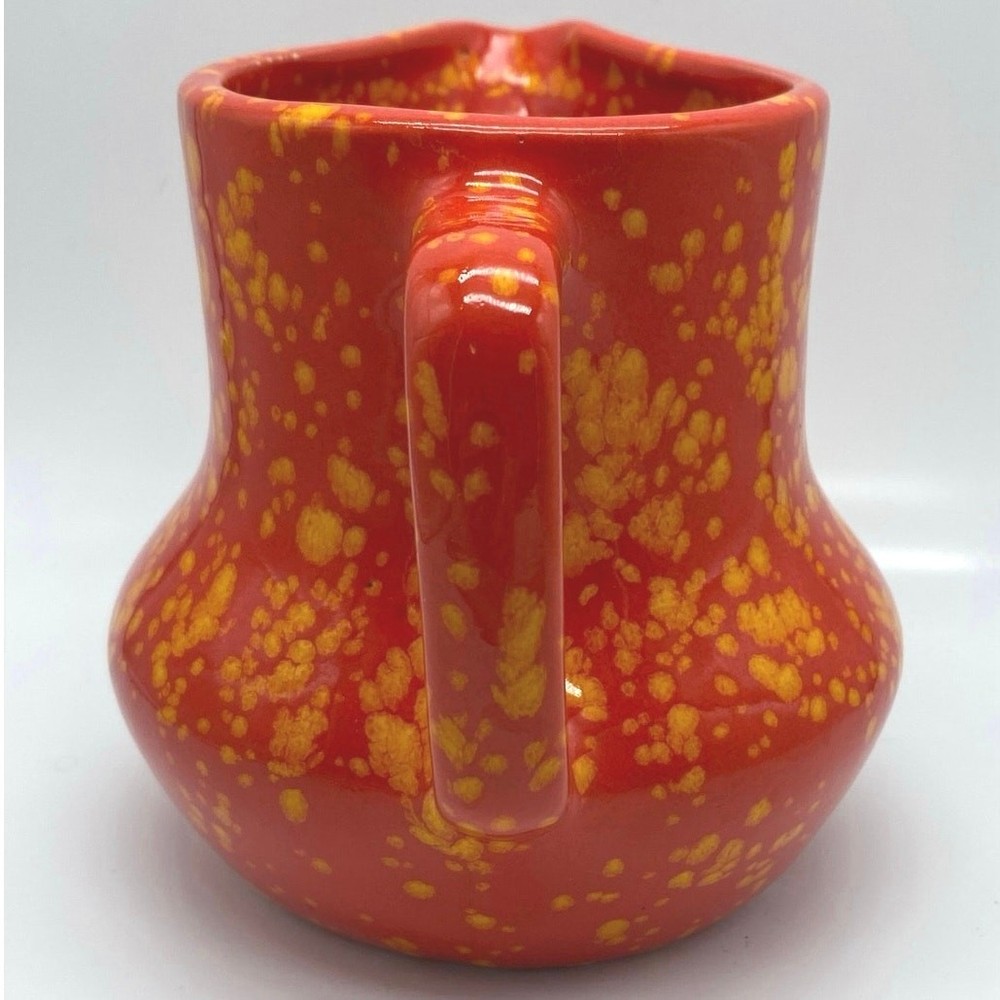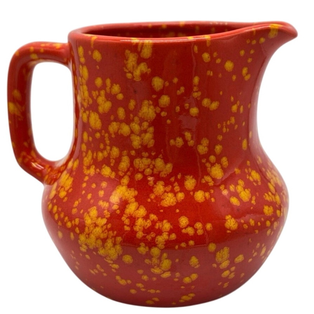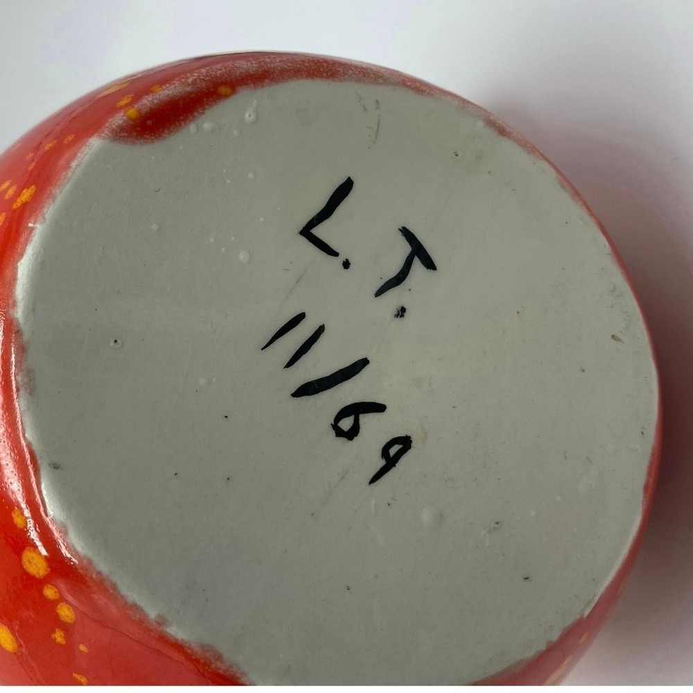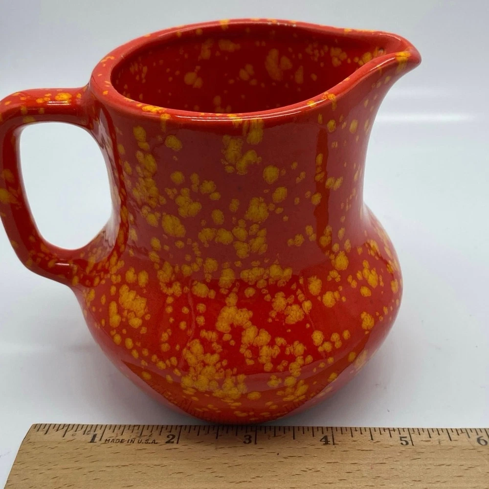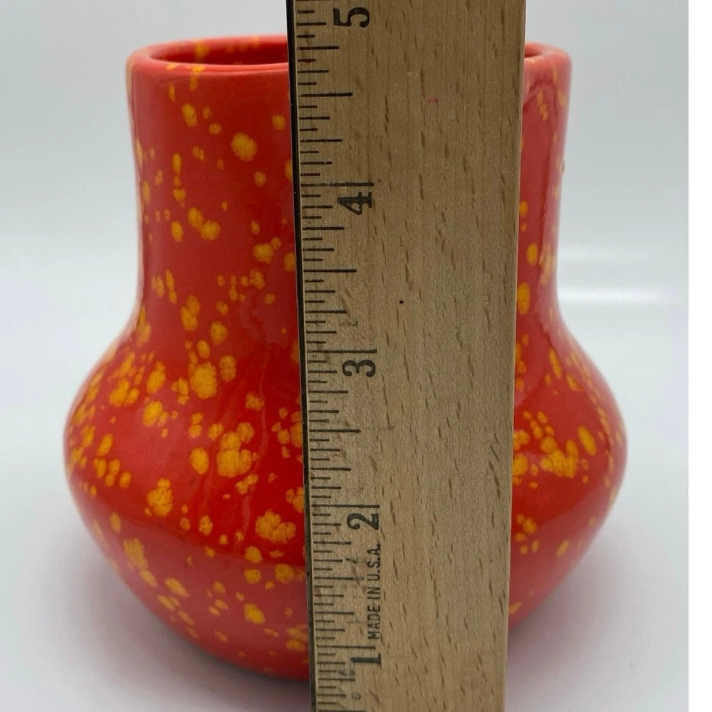 Absolutely love this vintage pitcher! The bold red-orange speckle glaze gives it such a fun, retro vibe, and seeing the artist’s signature and date from 1969 makes it feel special. Perfect size at 5”—great for a small flower arrangement or just as a charming decor piece. The mid-century craftsmanship is amazing, and the splatter pattern adds tons of character. Adds a pop of color to any shelf!