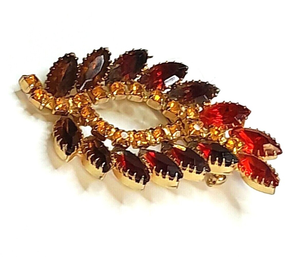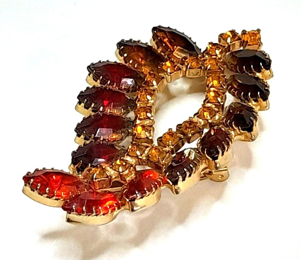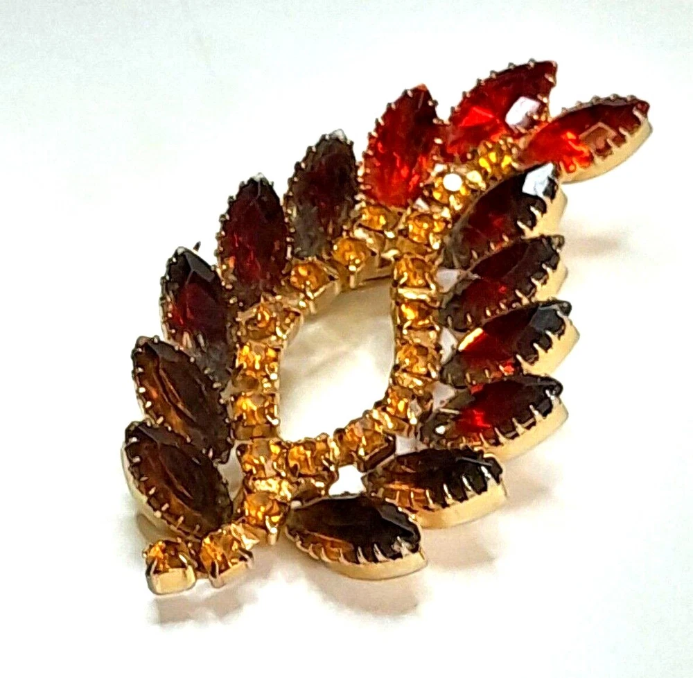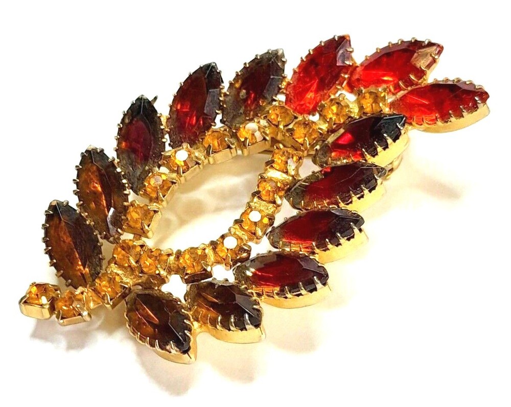 Mid-Century orange rhinestone leaf brooch. Unsigned. Measures approx. 2 3/4inches wide and 1 1/8 inches high 14 dark topaz, varigated and bright orange navettes are set in multi-prong cups Inner rows of light topaz colored chatons provide contrast Open center Closed back construction Subtlties in shading make this vintage piece a stand-out for fall!