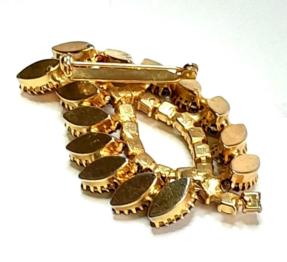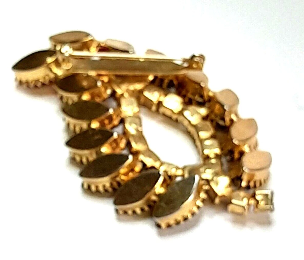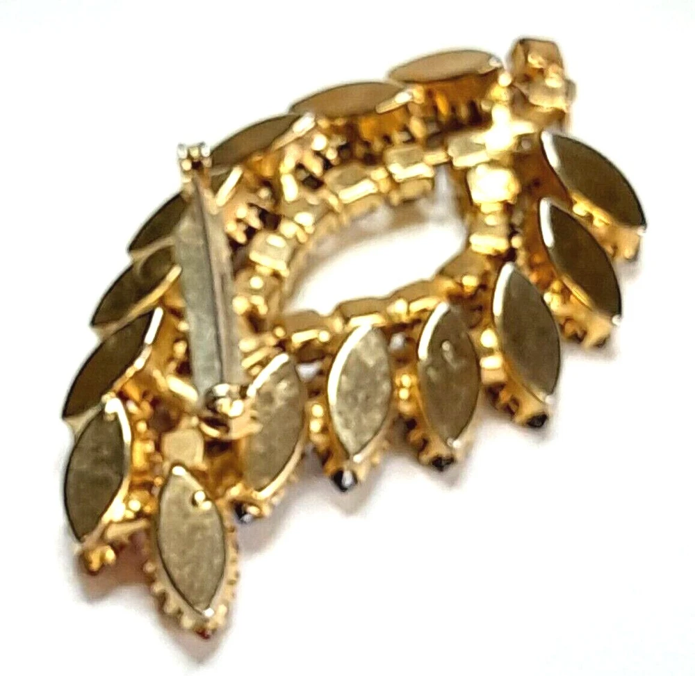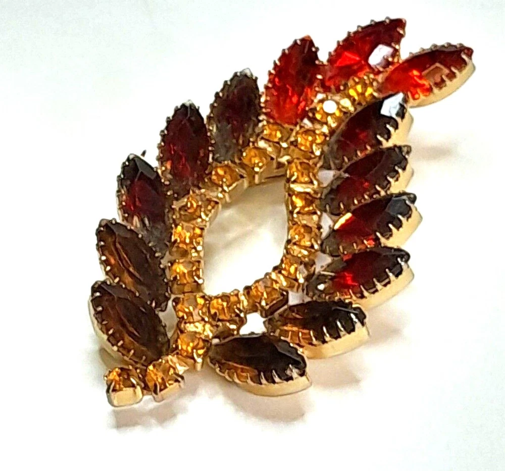 Mid-Century orange rhinestone leaf brooch. Unsigned. Measures approx. 2 3/4inches wide and 1 1/8 inches high 14 dark topaz, varigated and bright orange navettes are set in multi-prong cups Inner rows of light topaz colored chatons provide contrast Open center Closed back construction Subtlties in shading make this vintage piece a stand-out for fall!
