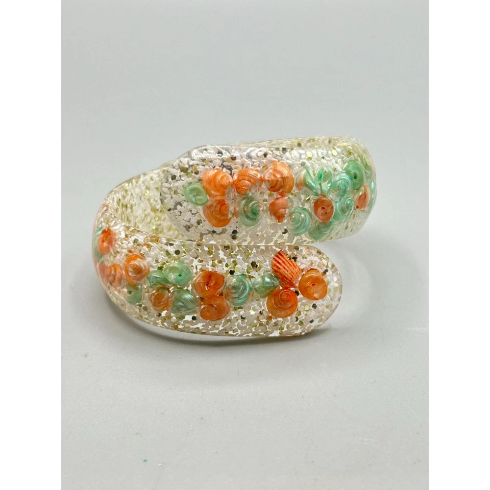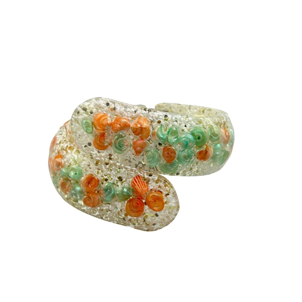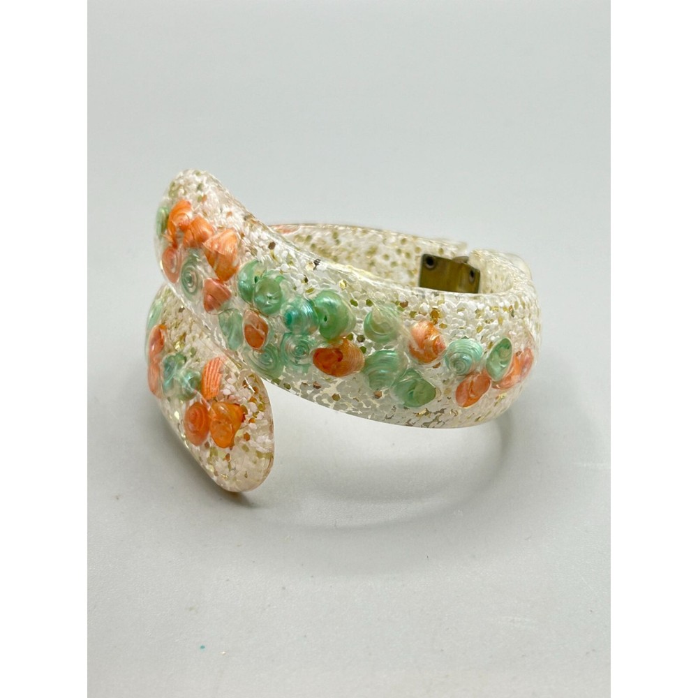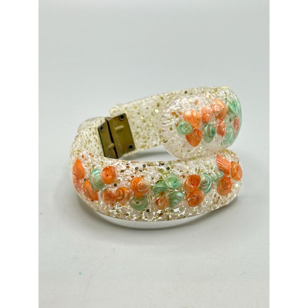Vintage Mid Century Seashell Lucite Clamper Bangle Bracelet Clear Orange Blue This listing is for seashell lucite clamper bangle signatures/markings: unmarked condition: very good measurement: 2.25" at the inner widest Please be aware that pictures are an important part of my description, please look at all photos and zoom in if needed. All my items are previously owned, I inspect everything carefully and try my best not to list items with major flaws or damage. Vintage and antique items often have wear, it is normal if they do. Features: • bracelet Size: Womens 2.25" at the inner widest Condition: Pre-Owned Good
