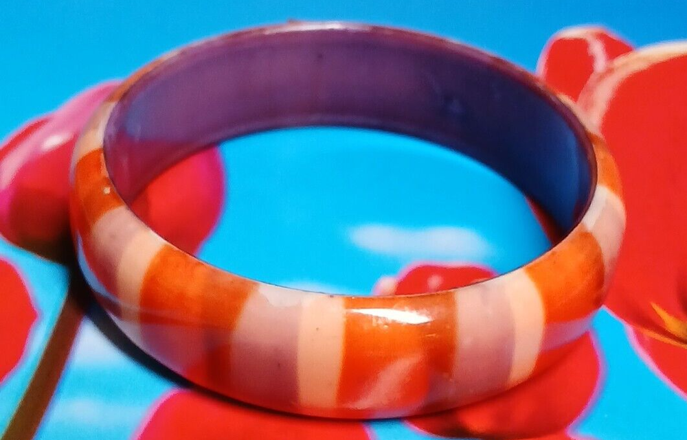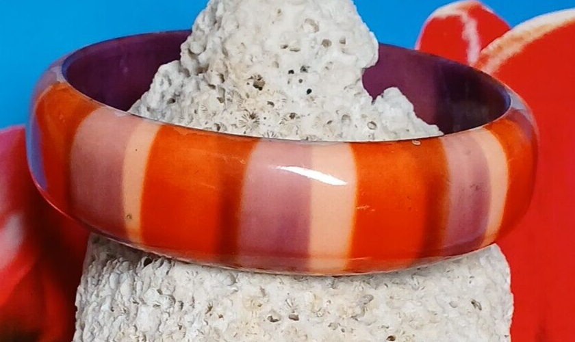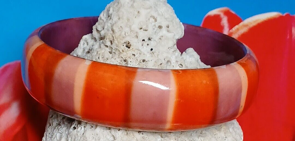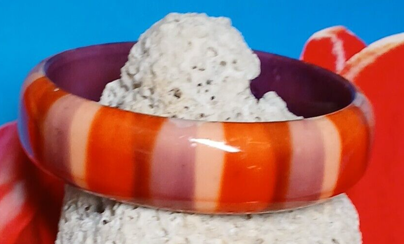 Vintage Mid Century striped orange, lavender and yellow lucite bangle bracelet. In nice pre-owned condition. Bracelet circumference is 2 5/8" X 5/8" wide. We are in no way experts and only try to describe each item to the best of our ability. We acquire these items from estate finds and antique shops. They come to us as used items and that is how we pass them on. Please look at the photos to fully appreciate and make your decision. All sales are final. We do not offer returns or refunds. (#490)