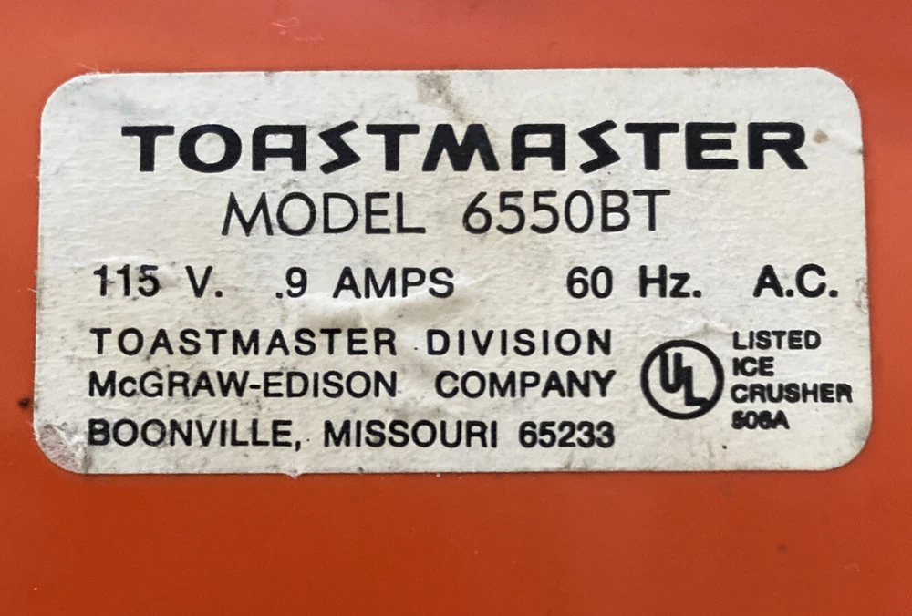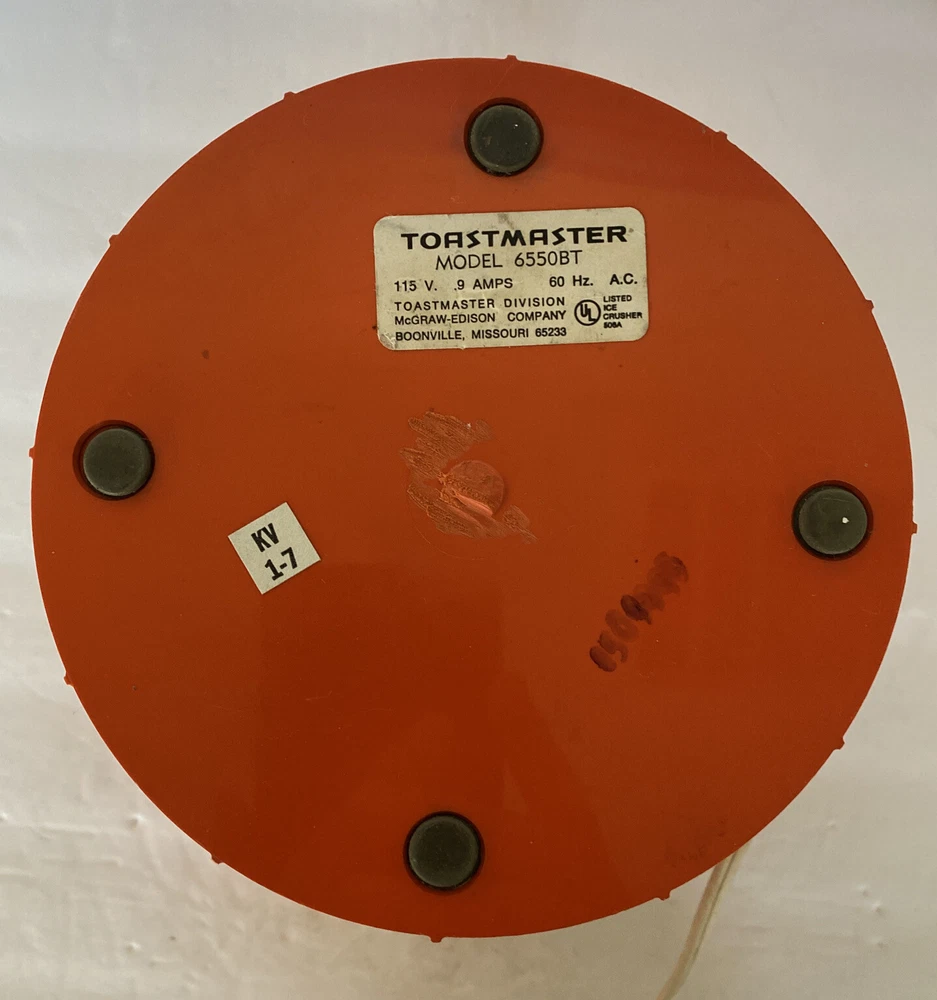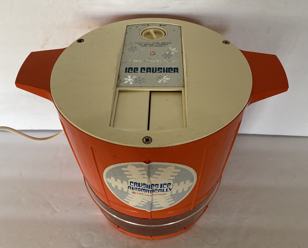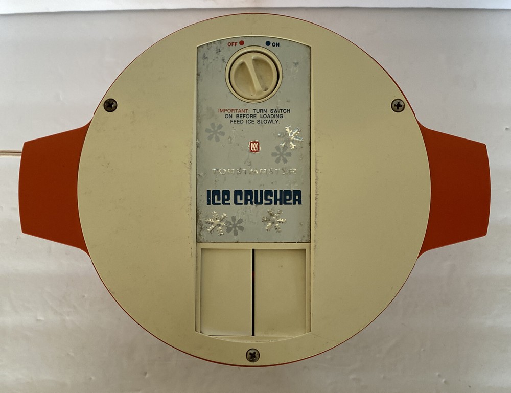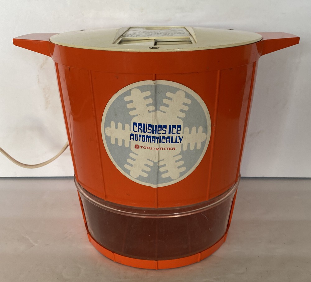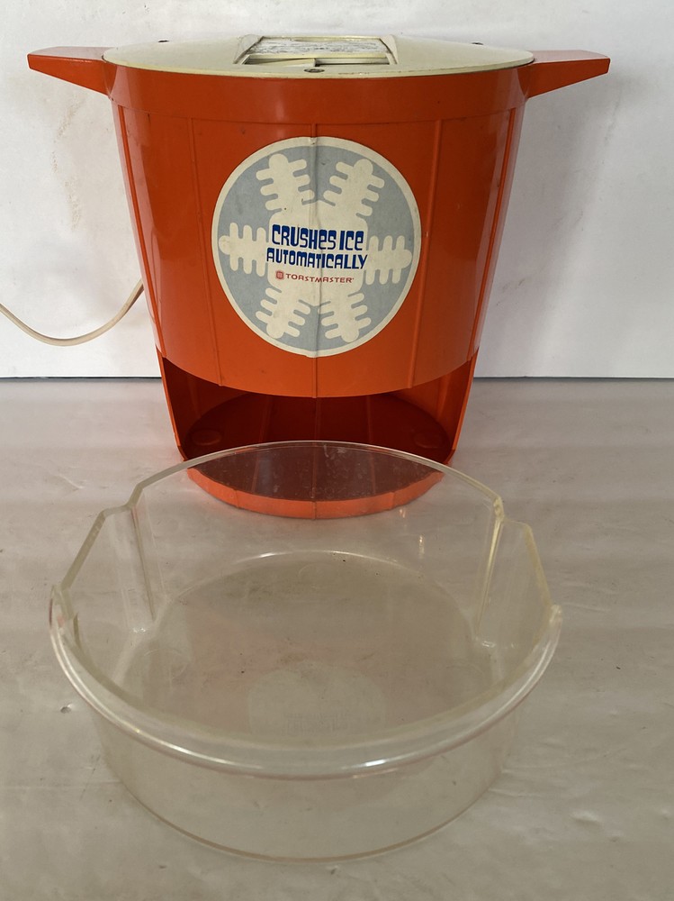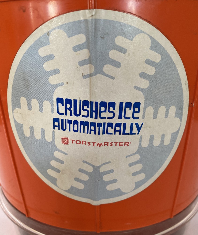 Vintage Mid Century Toastmaster Model 6550BT Orange Space Age Ice Crusher. Tested and works. Please see pictures of this pre owned used condition item. Thanks for visiting !!