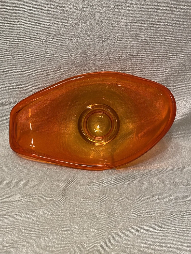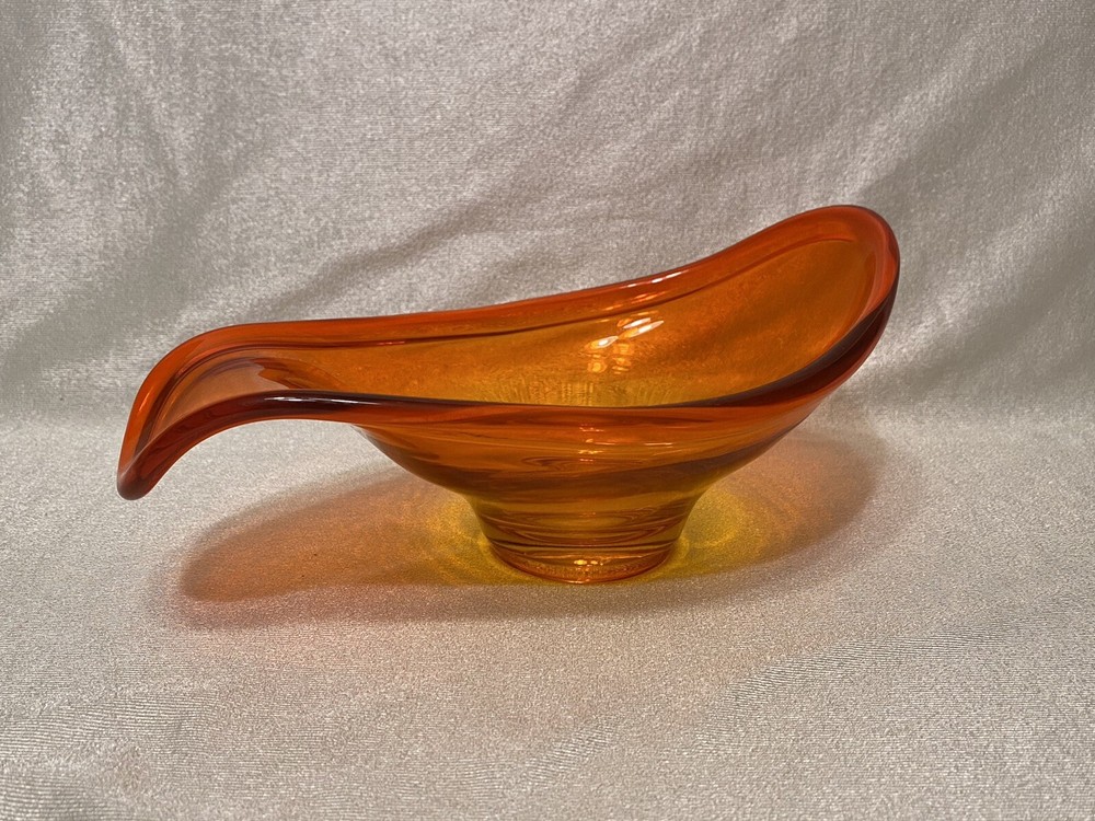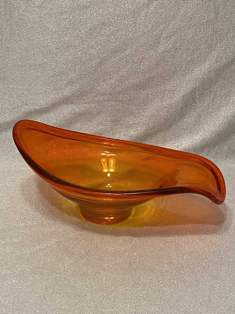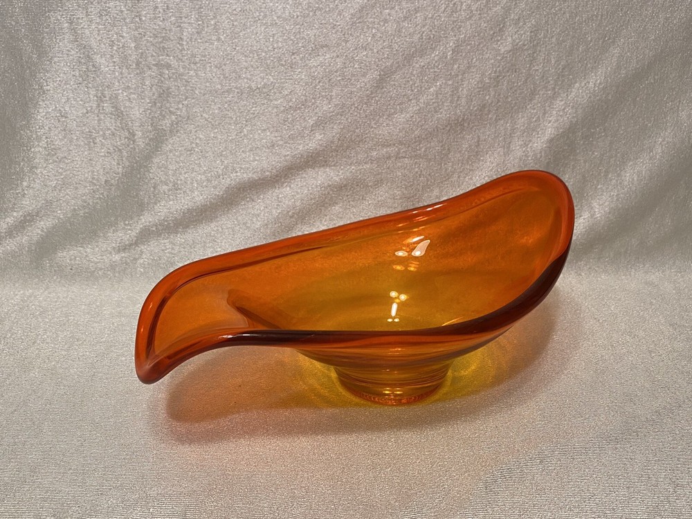 Vintage Mid Century Viking Glass Orange Abstract Oblong Pedestal Bowl. Very nice condition. Measures approximately 9.5” x 5.25” x 3”.