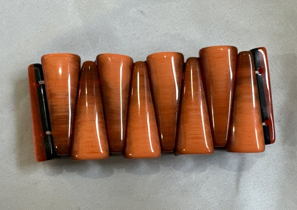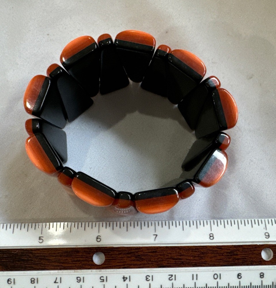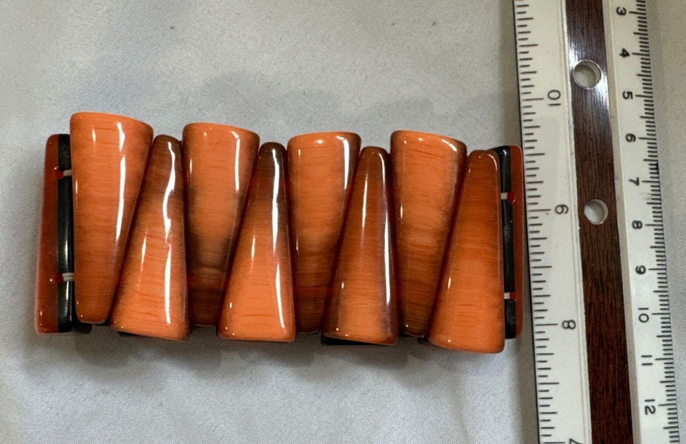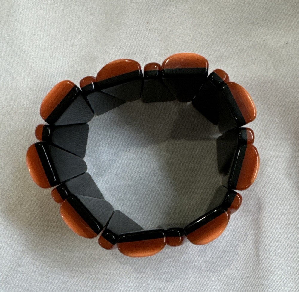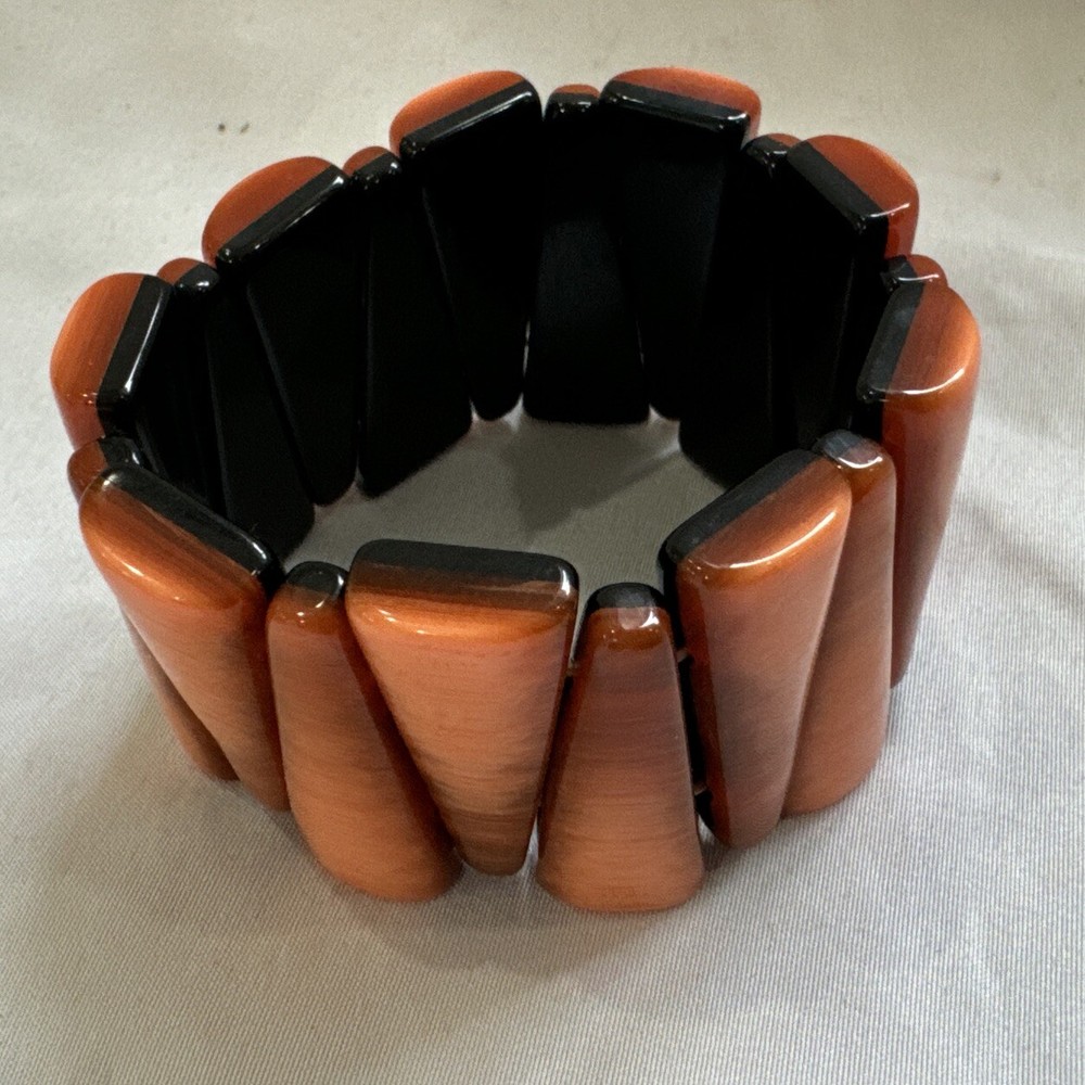 Add a touch of vintage charm to your wrist with this beautiful orange brown stretch bracelet. With a slip-on closure, this bangle is perfect for all occasions and features a round shape with no stones. The elastic chain type ensures a comfortable fit for every wrist size, while the 7-inch length makes it a great addition to any jewelry collection. This chunky bracelet has a mid-century theme and is an original piece. In excellent condition!