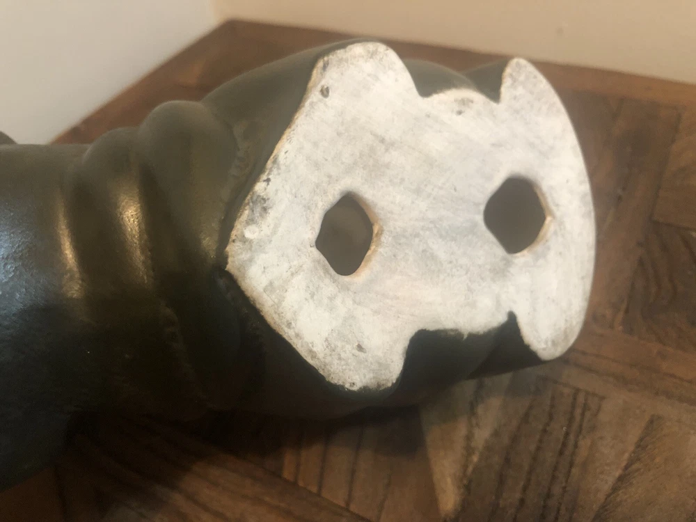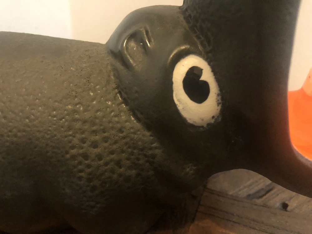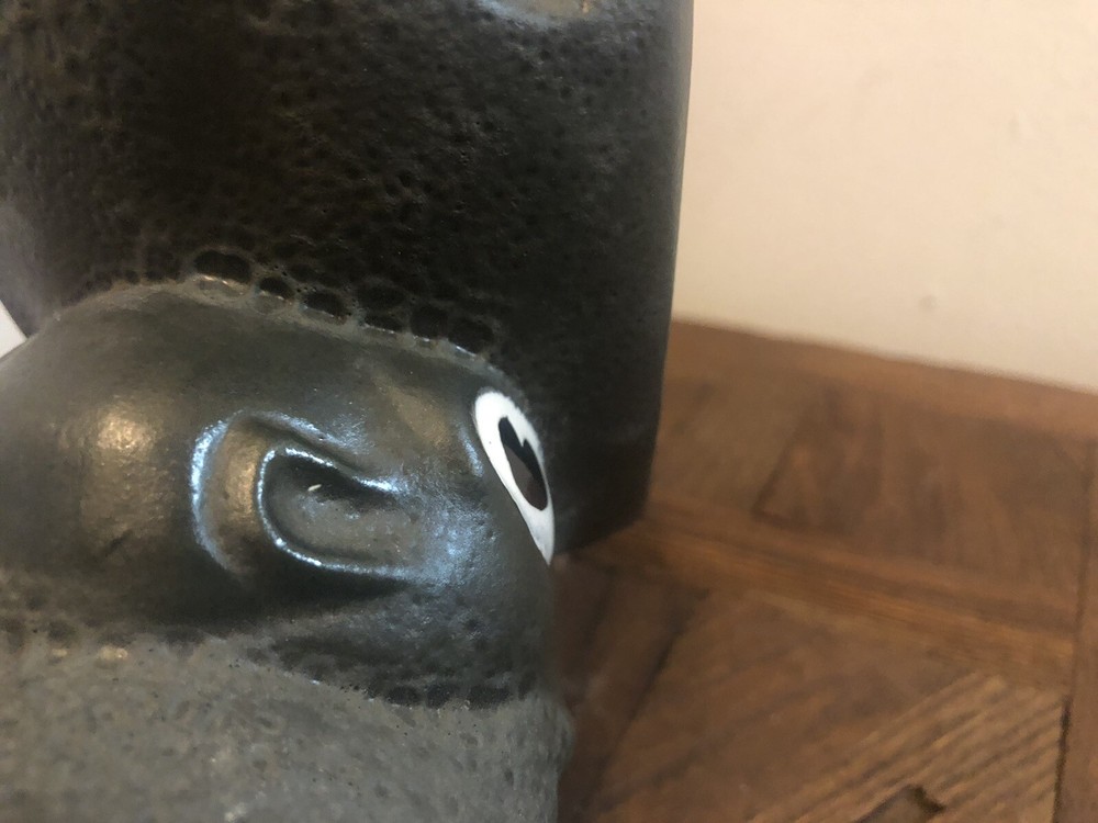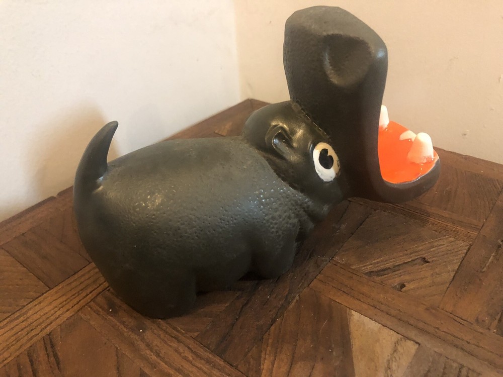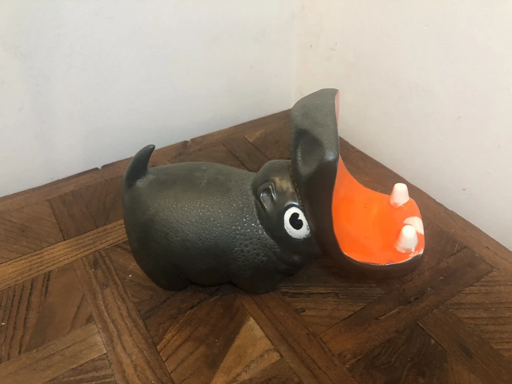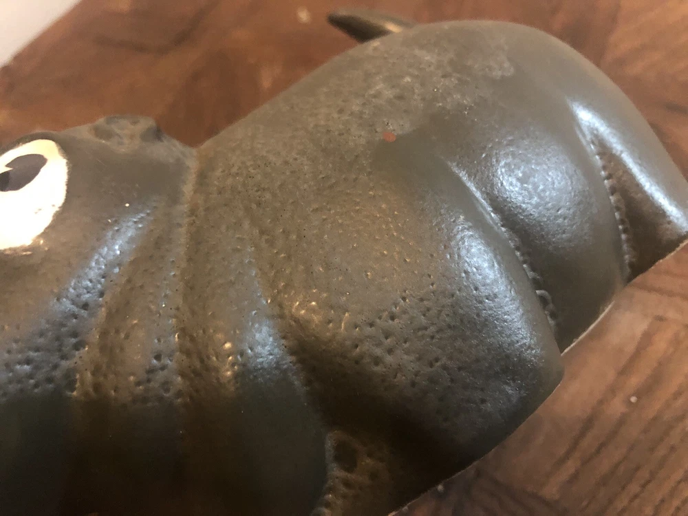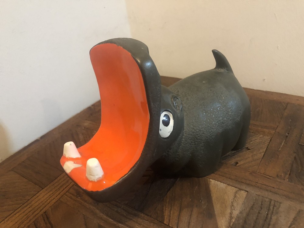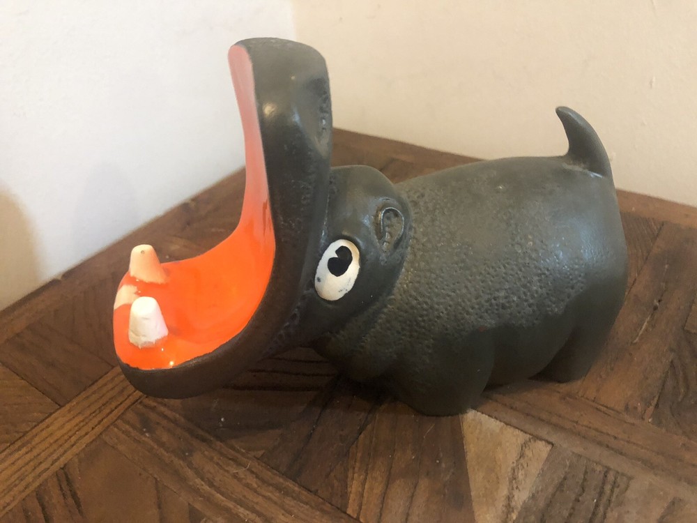 Please be sure to check out all my other listings with cool, retro and true vintage items like vintage clothing, Levis, footwear, sports, electronics, Mid Century, Hawaiian, Surf, Tiki, travel, gas, oil, soda, advertising, household, 70s, boho and all kinds of man cave stuff and junk. Vintage Mid Century Whimsical Pottery Clay Hippopotamus Hippo Figurine Orange Really great Mid Century look and design. It has beautiful orange glaze in the mouth similar to the colors from treasure craft. Unmarked on the bottom, so don’t know the maker or exact time. But it definitely has a mid-century feel to it. The body has a texture to it. 8” x 5” x 4”