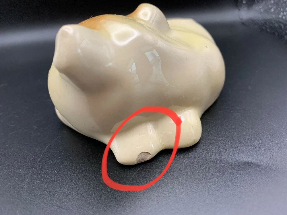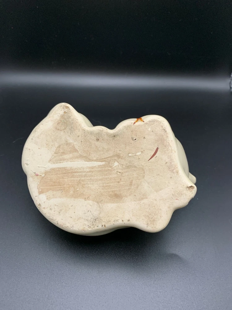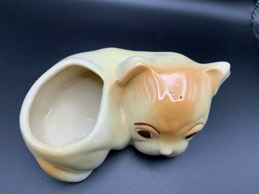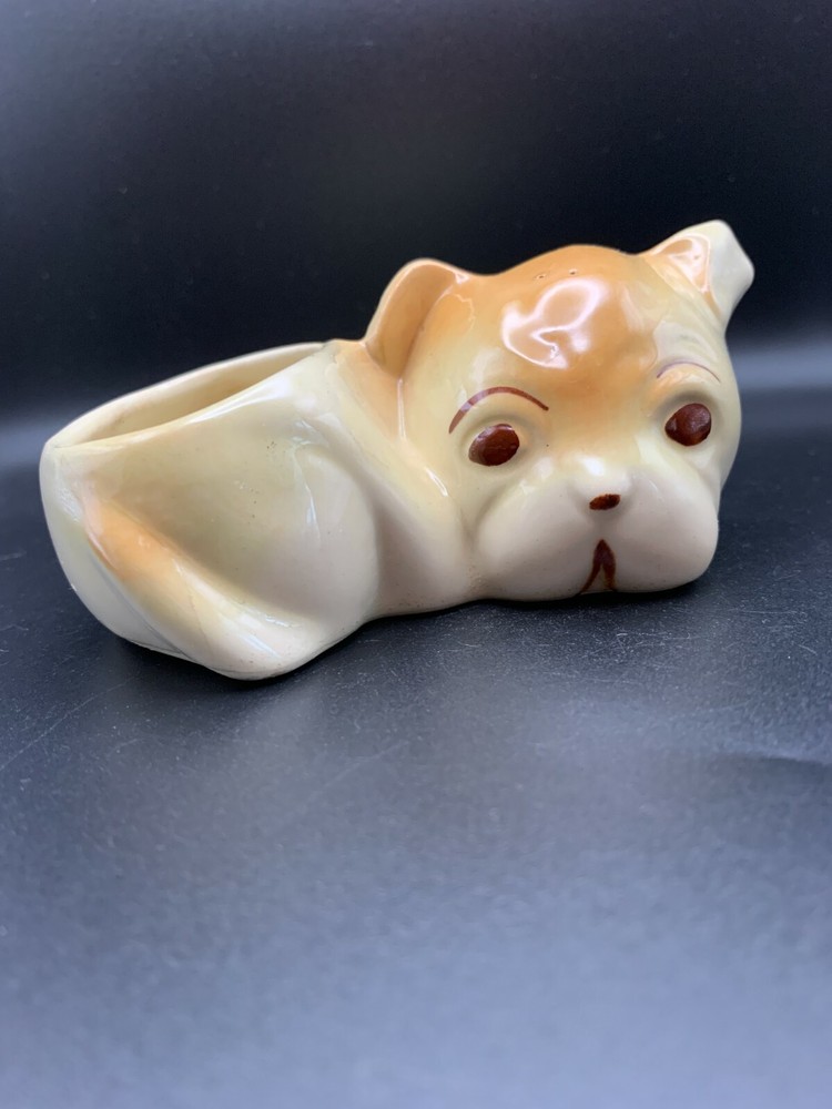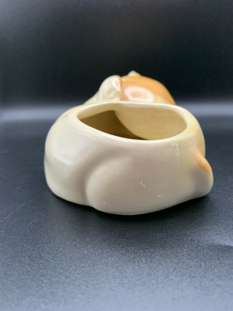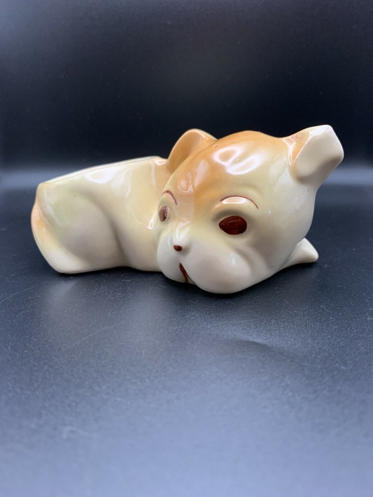Sweet little mid century cute Dog Puppy planter or vase in Porcelain - white base with orange accents and hand painted eyes. From Japan. Weird little guy in an interesting shape!...