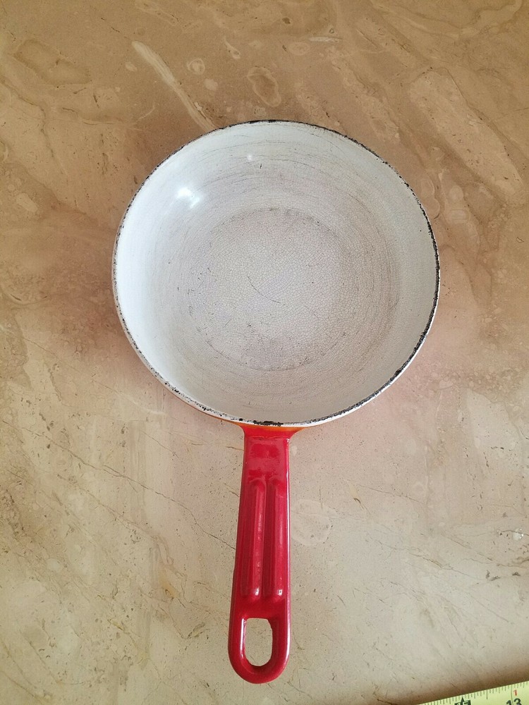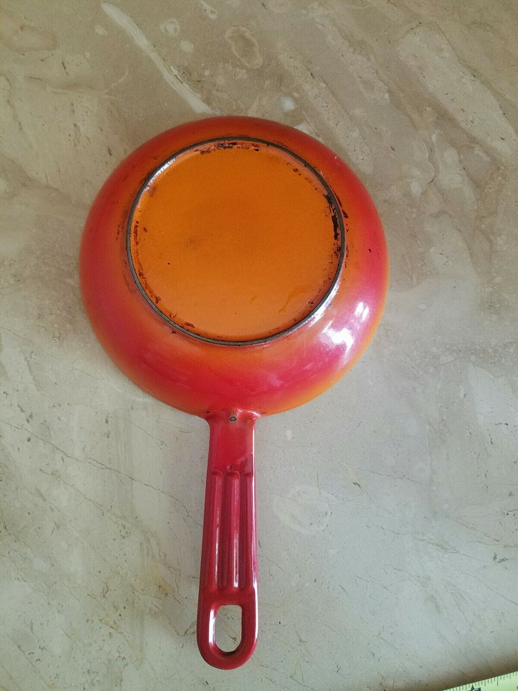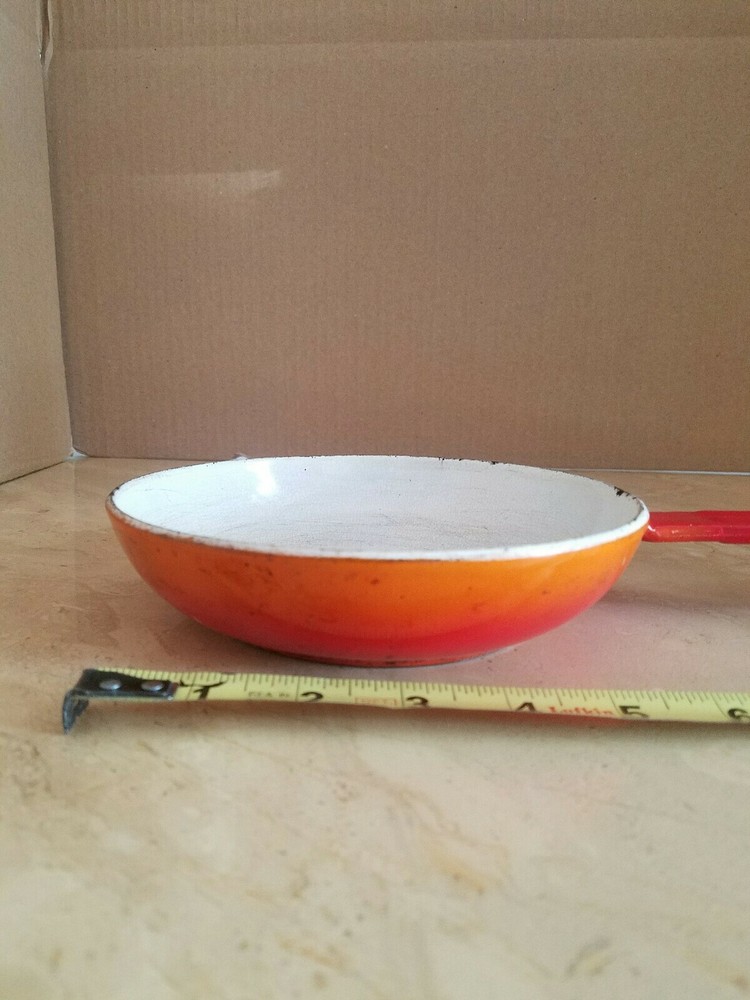 Vintage Mid Century enamel ware Orange 6.5"pan . Condition is Used. Shipped with USPS Priority Mail. Vintage preowned conditions maker unknown...