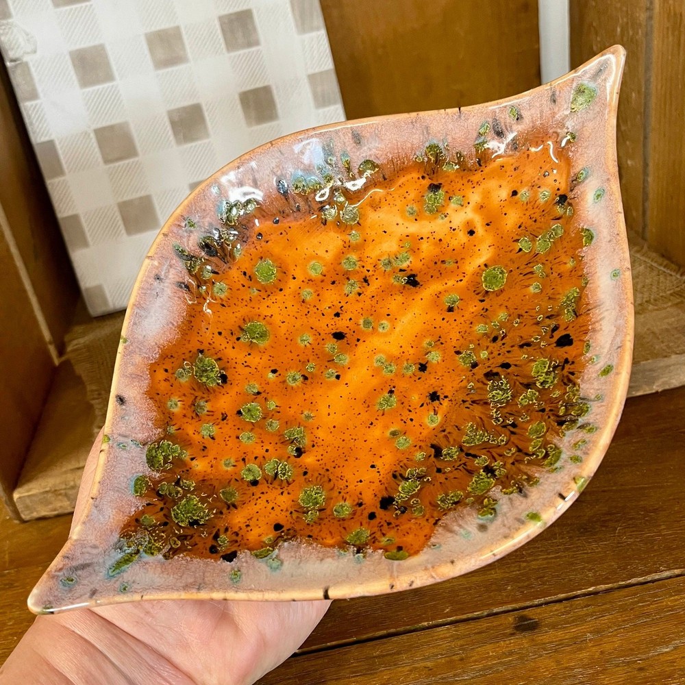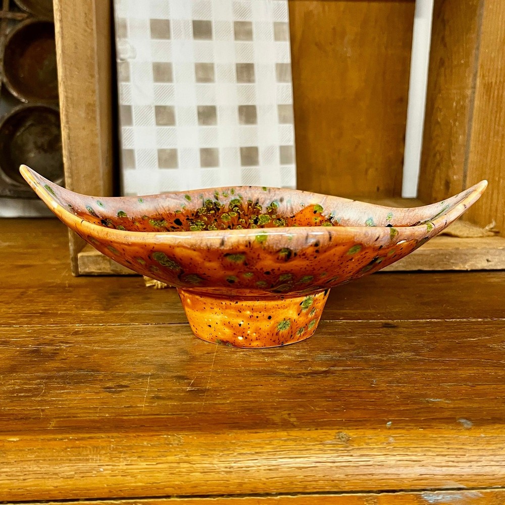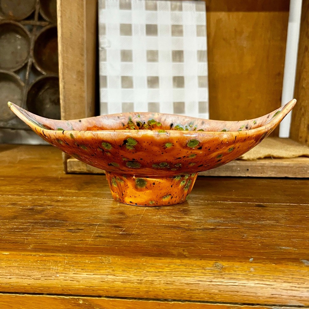 <![CDATA[<div>This unique vintage ceramic pedestal dish has a striking mid-century design, featuring a leaf shape with pointed ends and a bold orange glaze. Accented with black and green spots and a white drip glaze around the edge, this piece has a dynamic, artistic look. The green spots have a textured feel, resisting the top glaze for added visual and tactile interest. Though unmarked, this dish has a distinct mid-century modern aesthetic and could be used as a candy dish, trinket holder, or decorative accent. A true conversation piece—I’ve never seen anything quite like it! SIZE: Approx. 9" x 6" x 2 1/2" Thanks for visiting my shop! Take a moment to browse for more unique vintage items sourced on my junkin’ adventures, along with other vintage, handmade, and upcycled pieces. MORE VINTAGE FOR SALE