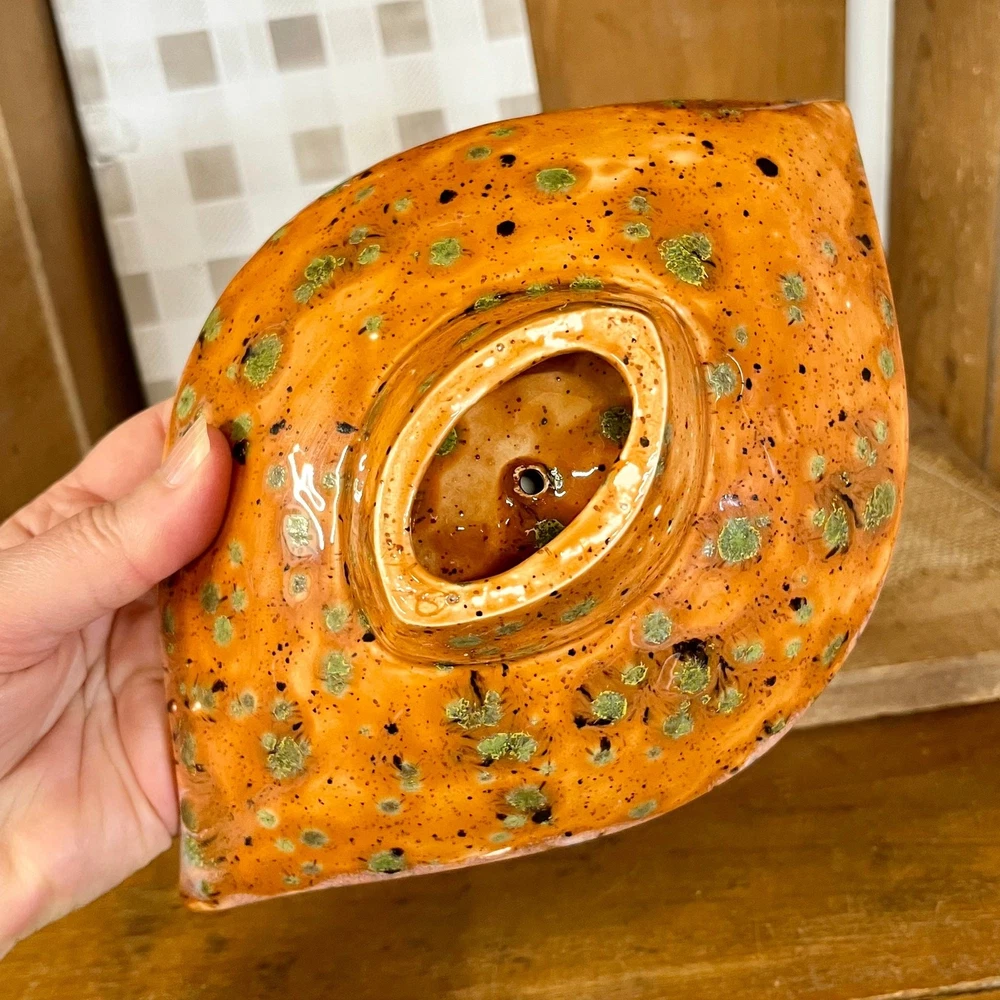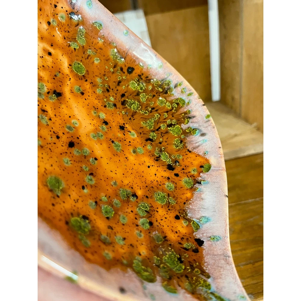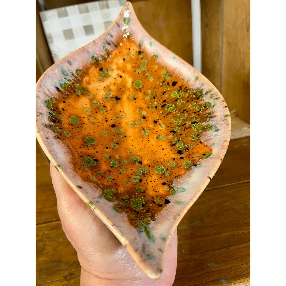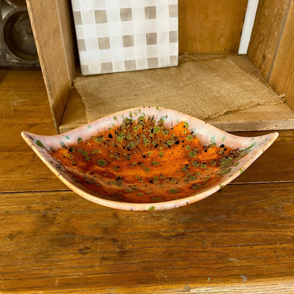 <![CDATA[<div>This unique vintage ceramic pedestal dish has a striking mid-century design, featuring a leaf shape with pointed ends and a bold orange glaze. Accented with black and green spots and a white drip glaze around the edge, this piece has a dynamic, artistic look. The green spots have a textured feel, resisting the top glaze for added visual and tactile interest. Though unmarked, this dish has a distinct mid-century modern aesthetic and could be used as a candy dish, trinket holder, or decorative accent. A true conversation piece—I’ve never seen anything quite like it! SIZE: Approx. 9" x 6" x 2 1/2" Thanks for visiting my shop! Take a moment to browse for more unique vintage items sourced on my junkin’ adventures, along with other vintage, handmade, and upcycled pieces. MORE VINTAGE FOR SALE