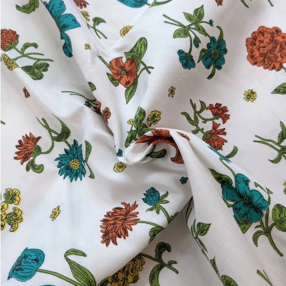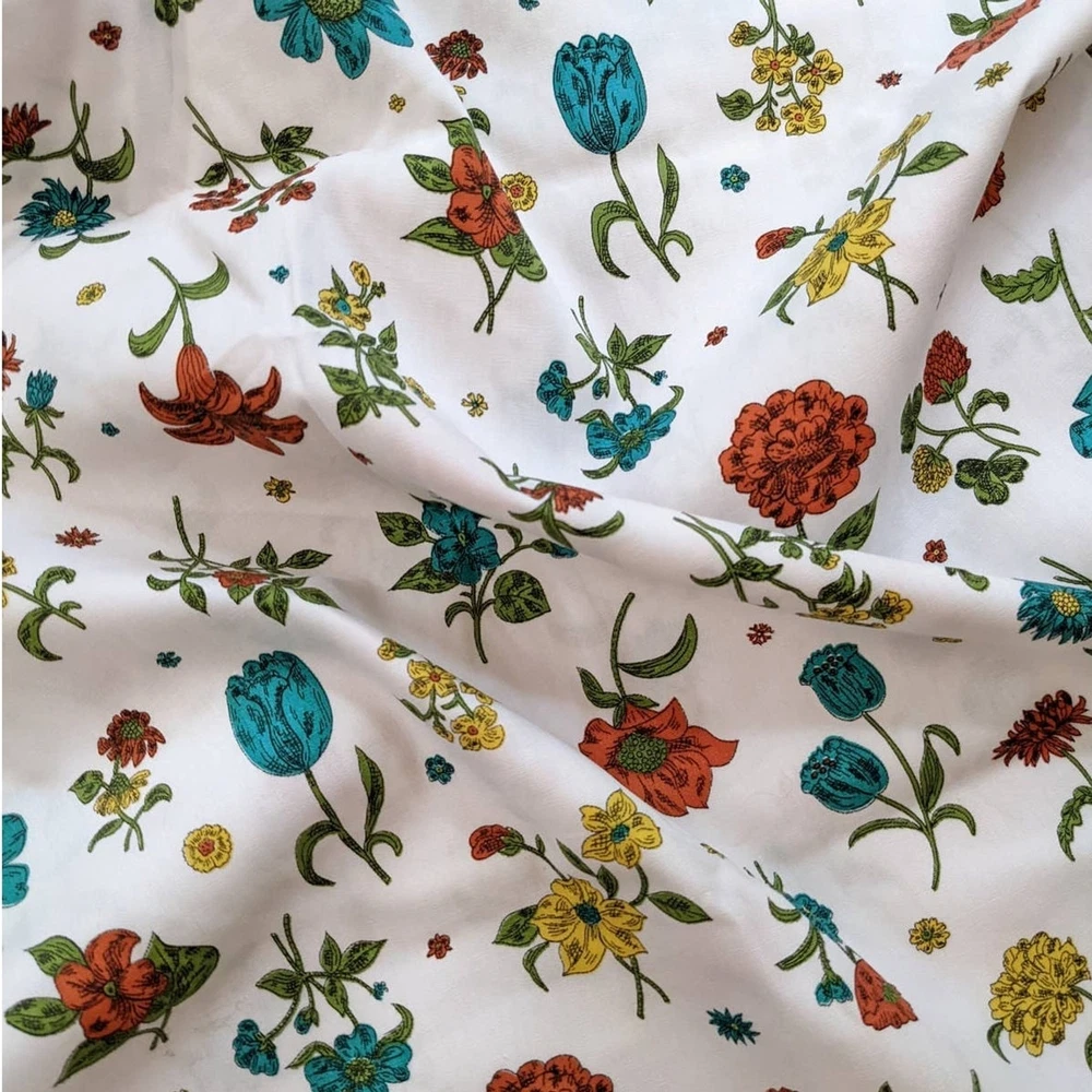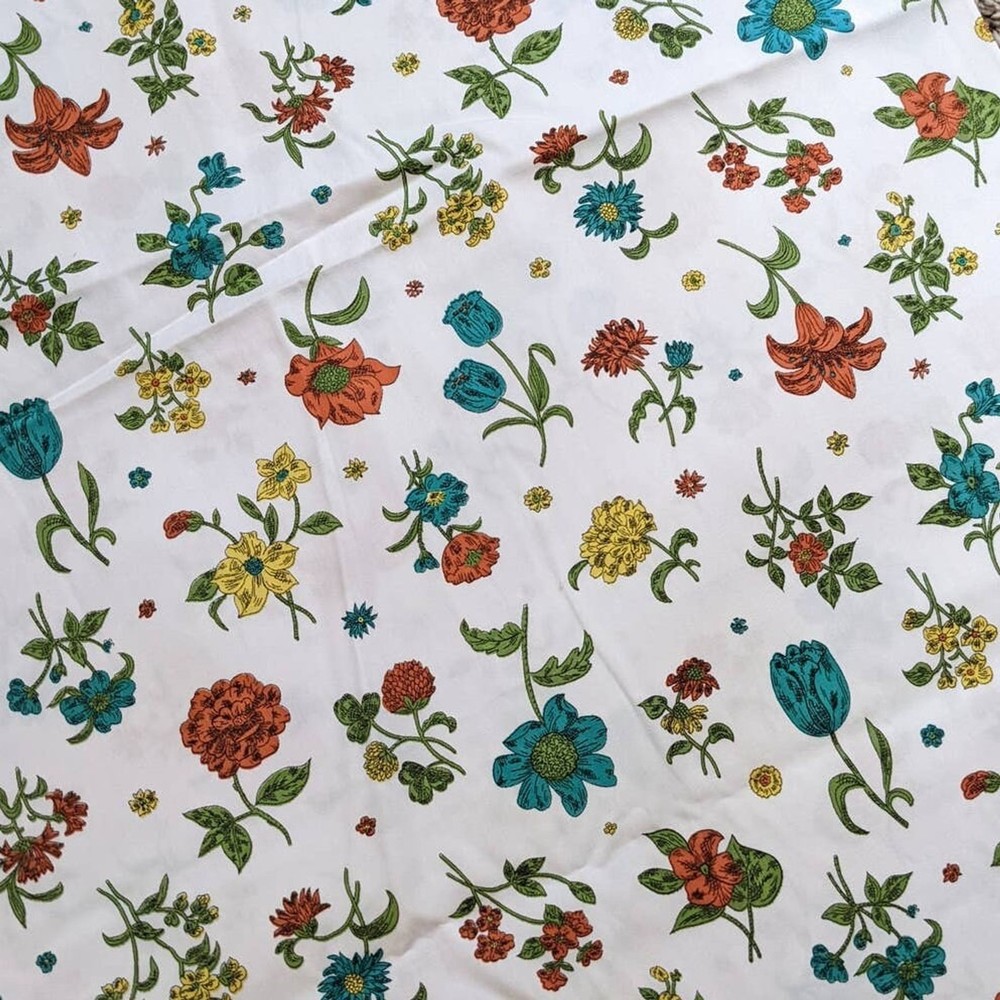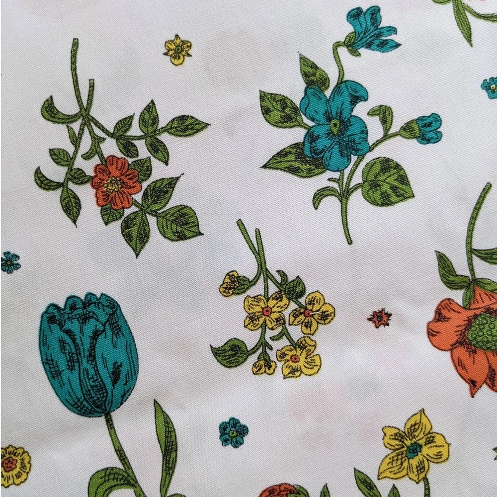 Transport yourself back to the mid-century with this vintage floral fabric that exudes timeless charm and elegance. The fabric showcases a delightful medley of blooming day lilies, tulips, and mums, creating a captivating visual feast of nature's beauty. The color palette features a harmonious blend of soothing blues, vibrant oranges, and cheerful yellows, which were signature hues of mid-century design. Measures 40" by 55" (just over 1.5 yards). This fabric is a medium weight cotton woven that would be appropriate for dress making or certain home décor projects like a pair of curtains. Excellent vintage condition with no flaws to note. Please see photos for details and ask with any questions. Thanks!