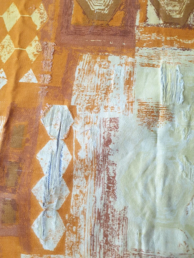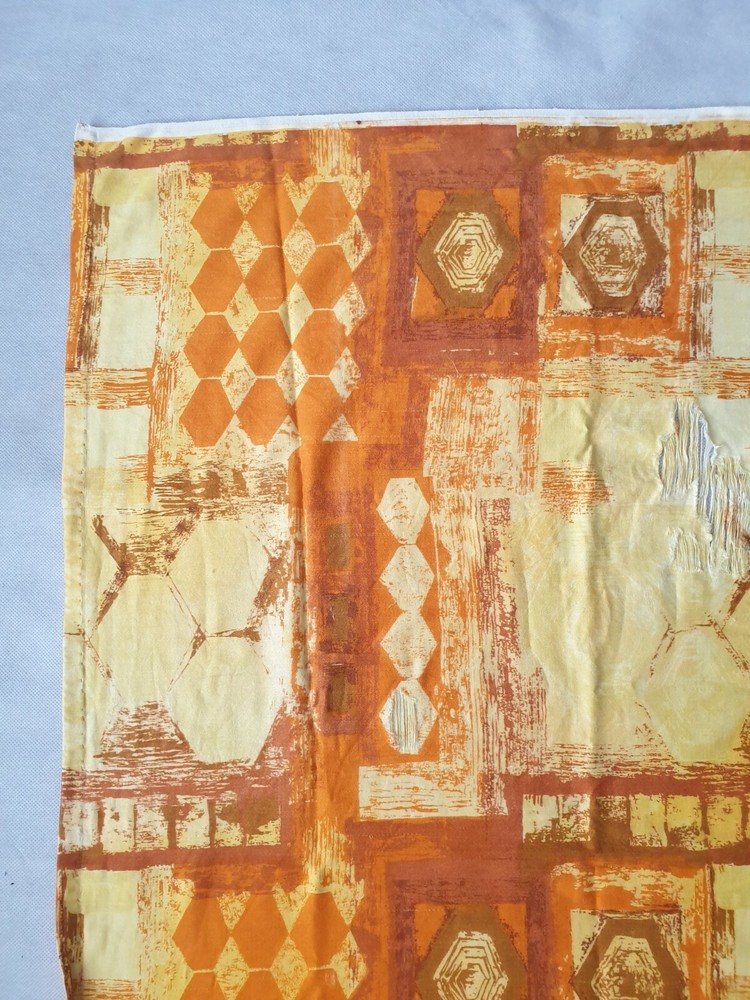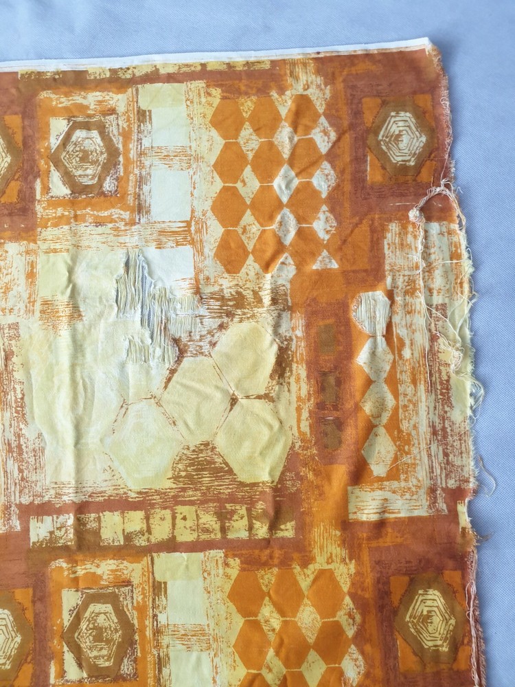 This vibrant vintage screen print fabric by Francis Price is a stunning mid-century gem! The bold orange and yellow abstract design of 'Timbre' adds a retro pop to any space. At 35" x 47", it's generously sized for framing, upholstery, or creative projects. While showing some expected age, the colors remain rich and eye-catching—perfect for collectors and mid-century modern lovers. A true conversation piece with timeless style!