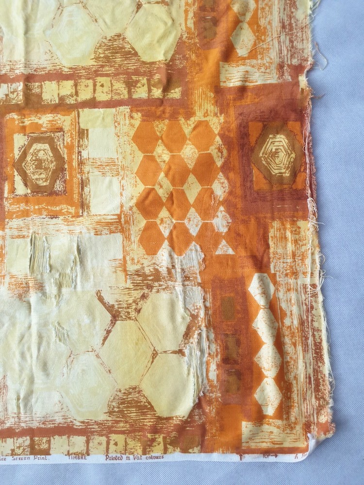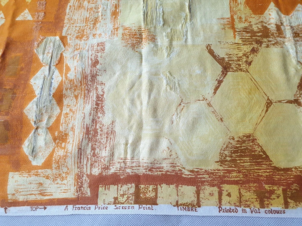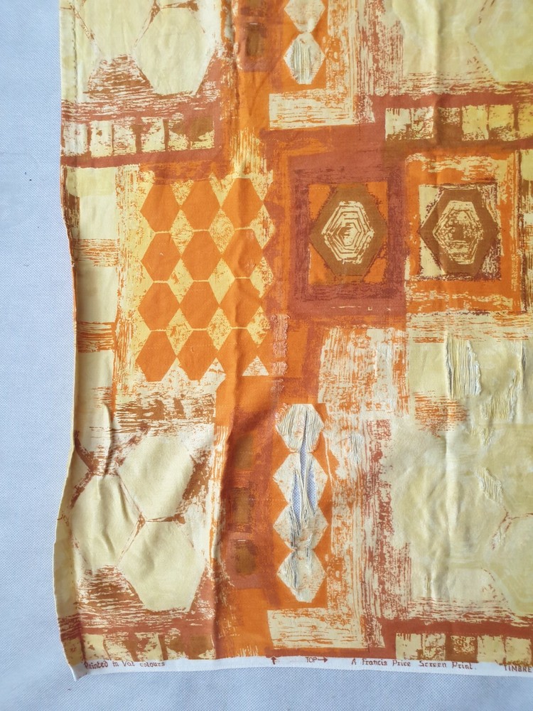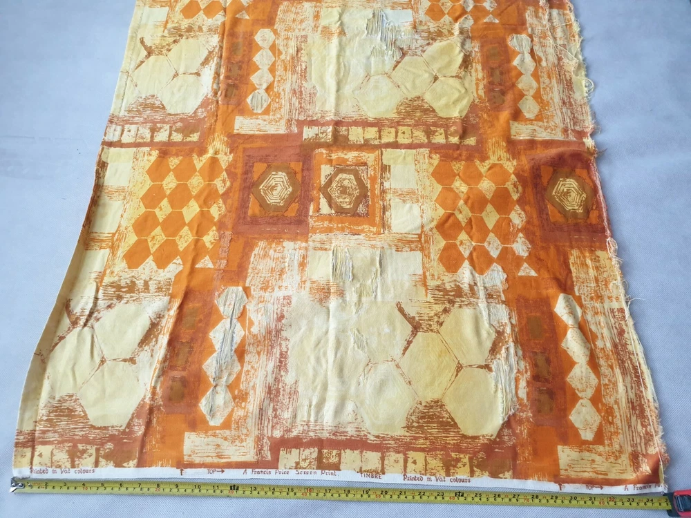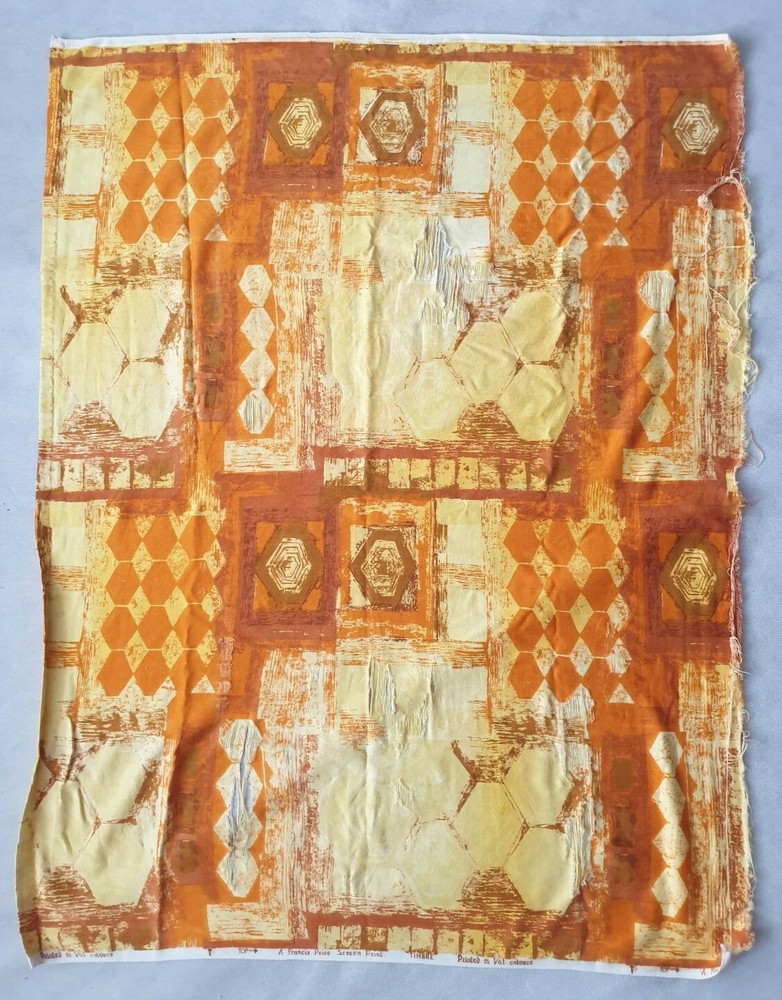 A Vintage Mid-Century Screen Print Fabric. Designed by Francis Price. This pattern is called 'Timbre'. It is orange and yellow in colour with a series of abstract shapes. I am not too sure of the exact date this piece was made, but I would suggest that it may possibly date from circa the 1960s / 1970s, or possibly earlier / later. It is large, measuring approximately 47" / 120cm long x 35" / 90cm wide. Please kindly review the listing photographs for it's condition. Please kindly note that there is some obvious areas of wear, as shown within the listing photographs. It could be kept in it's current condition as a collector's piece, or alternatively the buyer may possibly be able to cut it into smaller sections for use elsewhere. Any questions please kindly ask by sending me a message. Please feel free to take a look at the other items which I have listed.