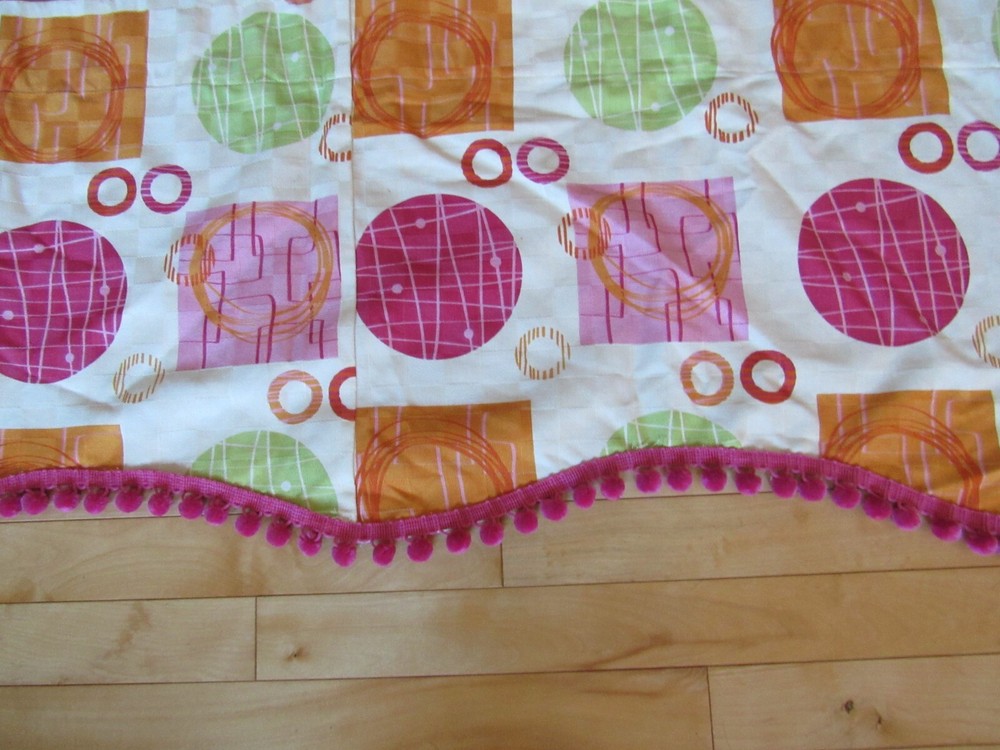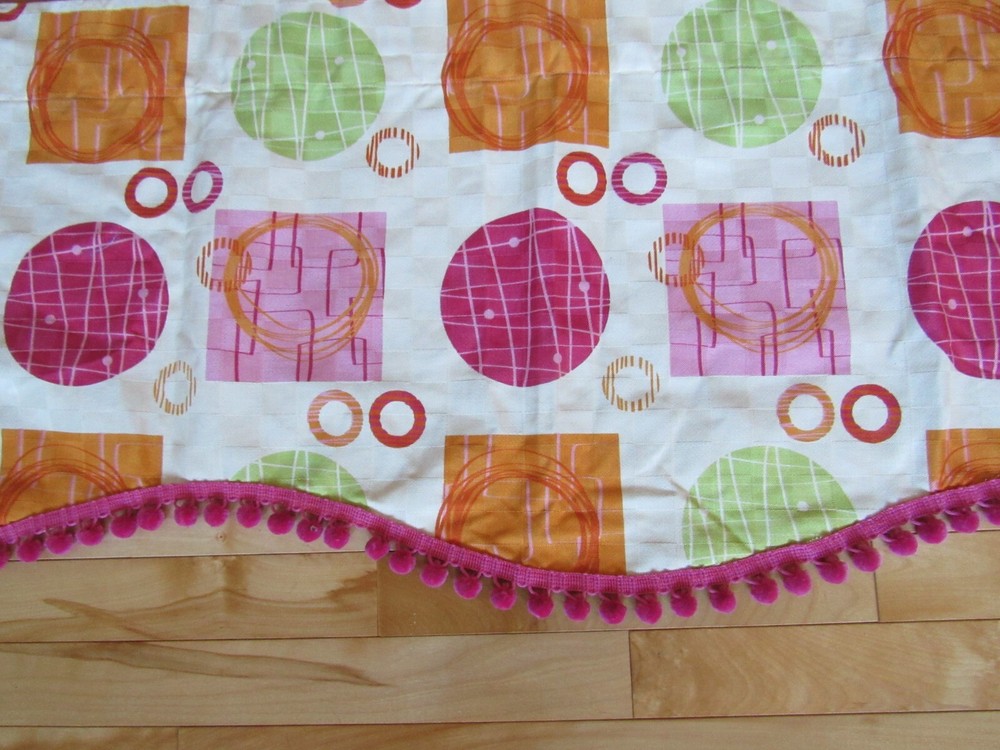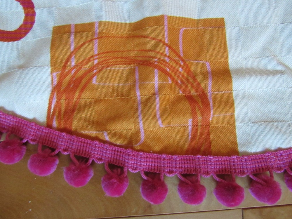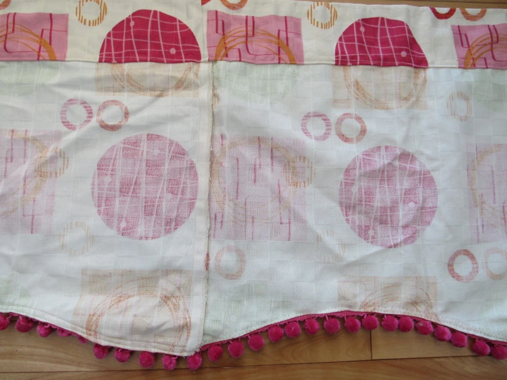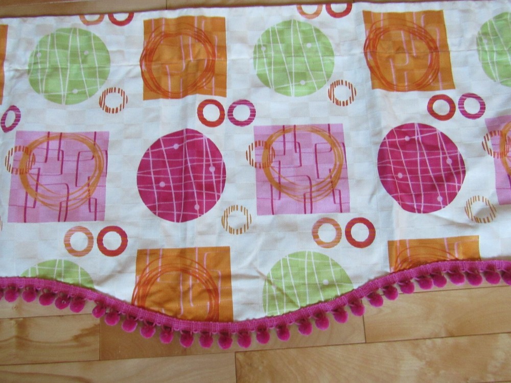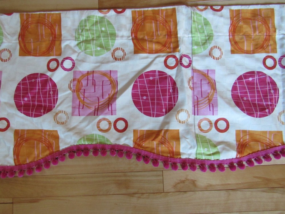 Vintage Mid-Century Geometric Scallop Valance Measures 18" x 84" Bright Pinks, Orange & Lime Green on Checkered Cream Bright Pink Pom Poms Heavy Fabric: I believe it is Waverly Fabric Excellent Pre-Owned I have 2 Valances; Will Combine Shipping