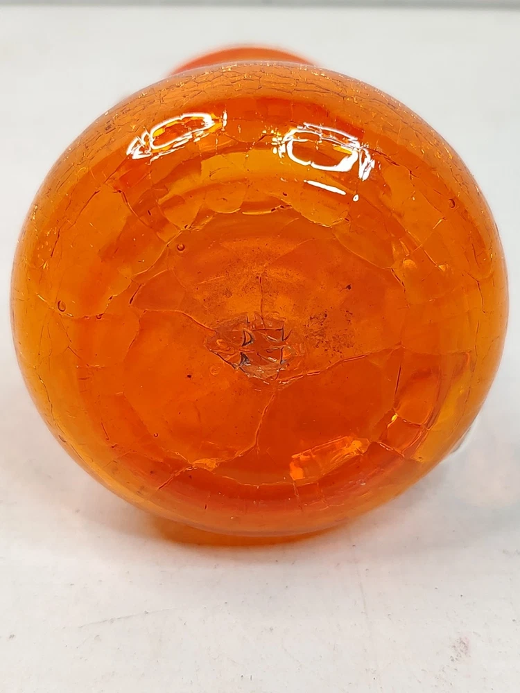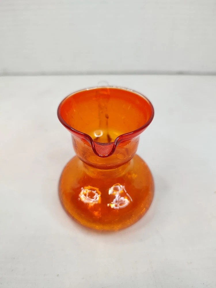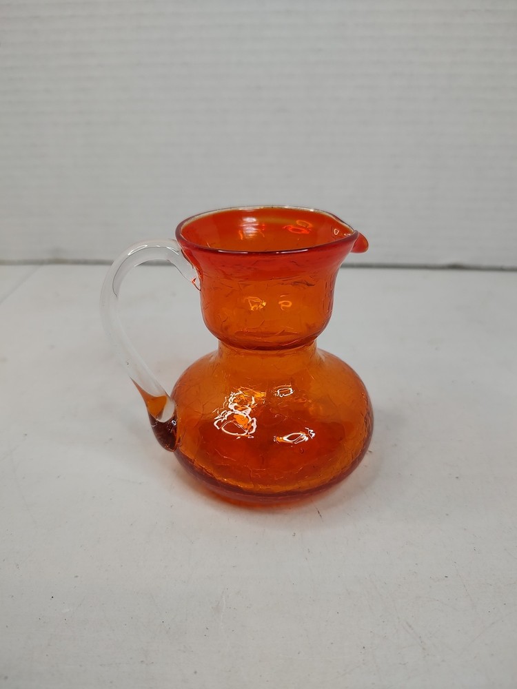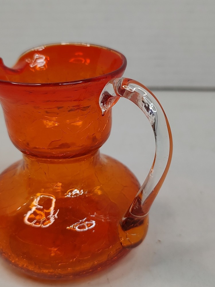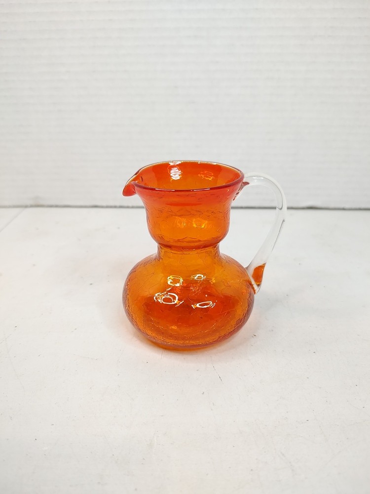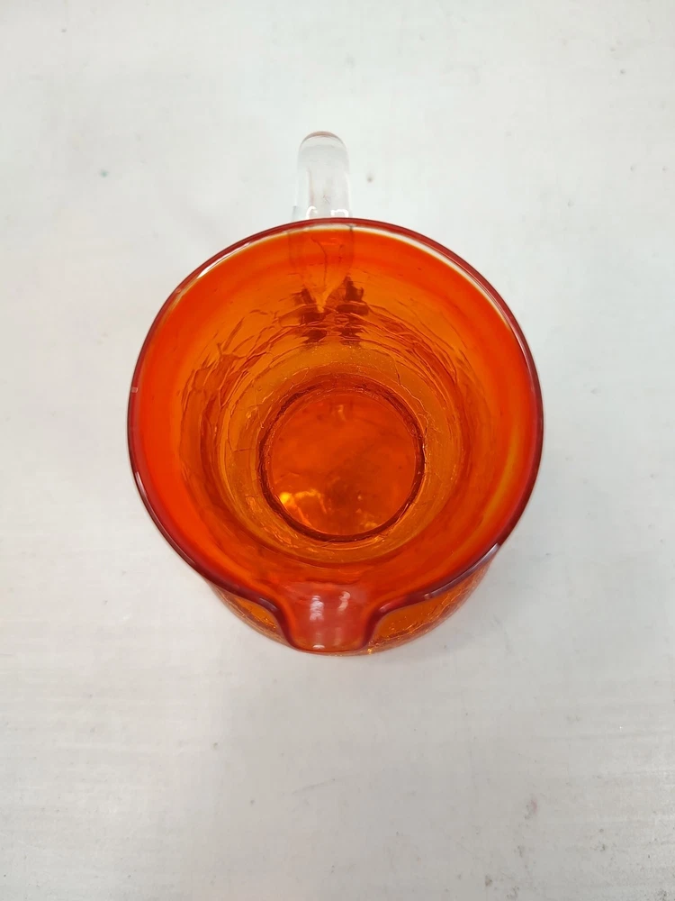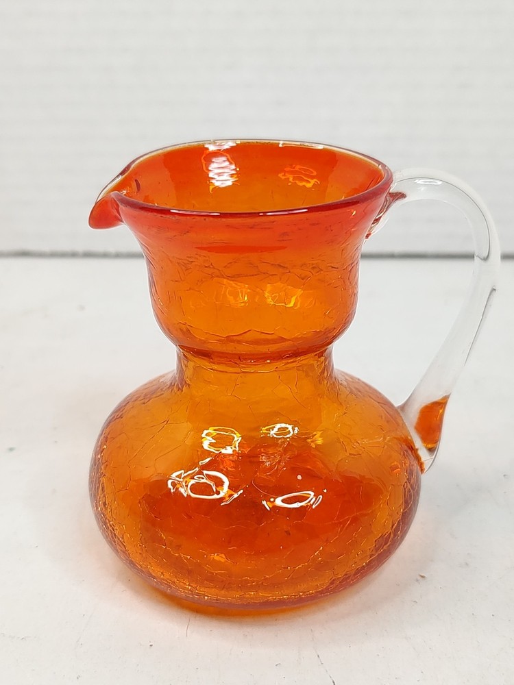 Vintage Mid-Century Orange Crackle Glass Pitcher Creamer with Handle Hand Blown 3.25" High See photos for the condition.