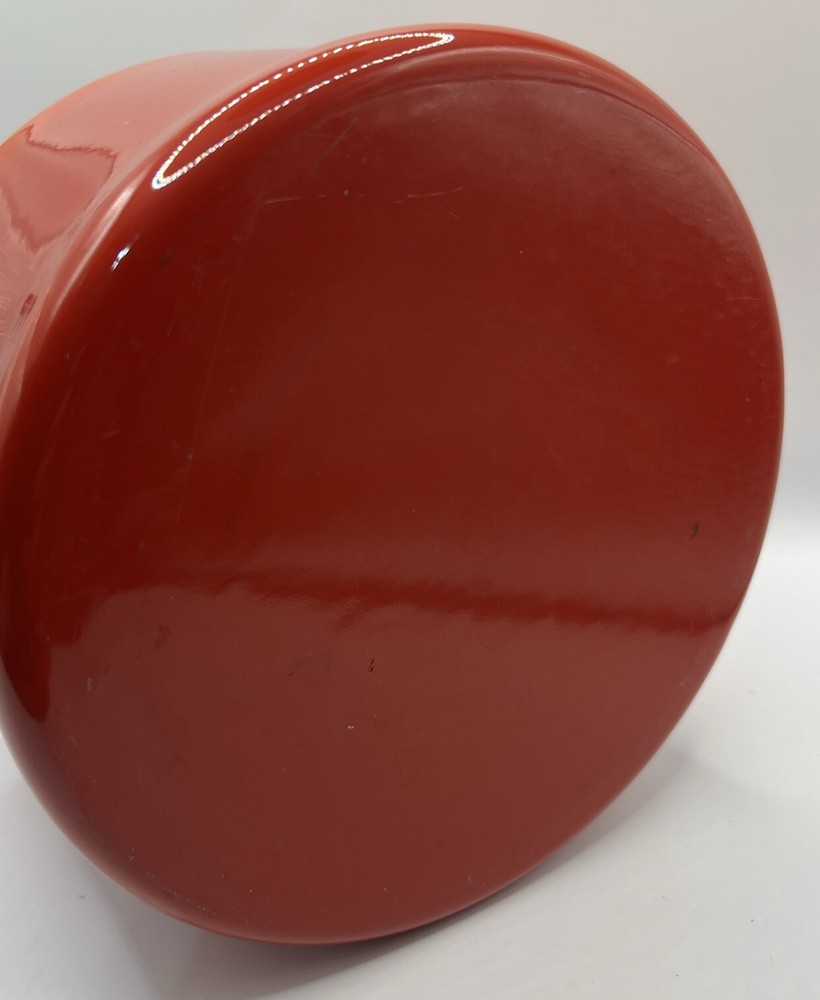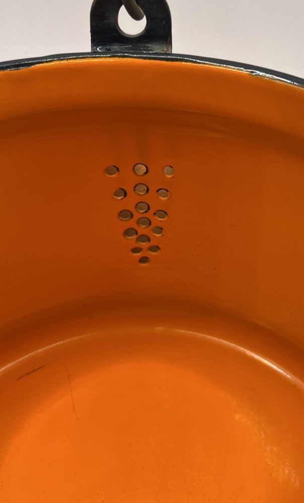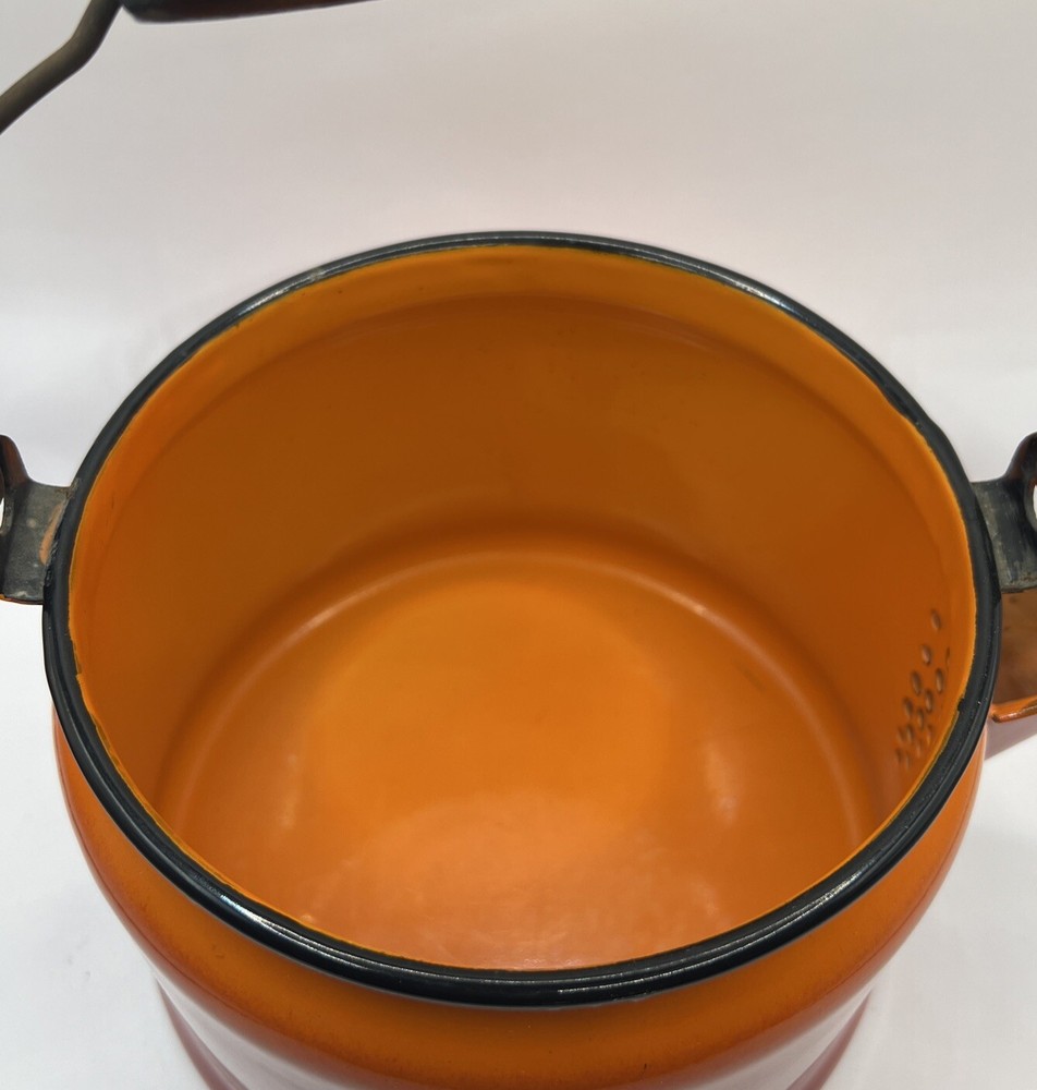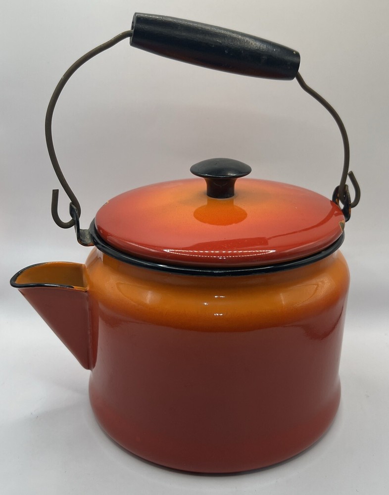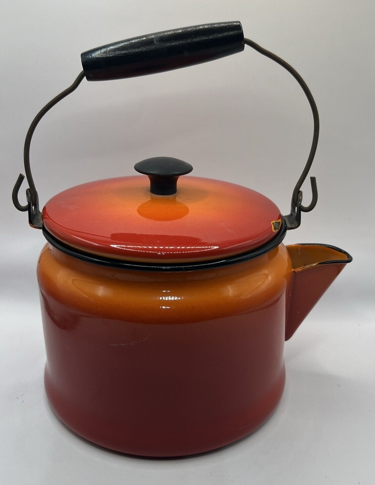 This vintage tea kettle is the perfect addition to any kitchen or farmhouse. The bright orange enamelware adds a pop of color to your decor. The brand and model of this kettle are unknown, but it is a true vintage piece. The durable enamelware material is perfect for heating water for your favorite cup of tea. This vintage tea kettle is a collectible item that will add a touch of nostalgia to your home. Don't miss out on the opportunity to own this unique and stylish piece.