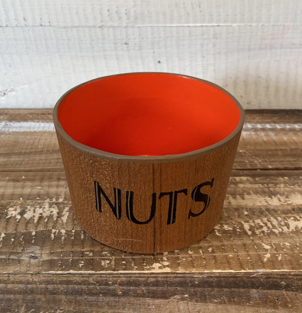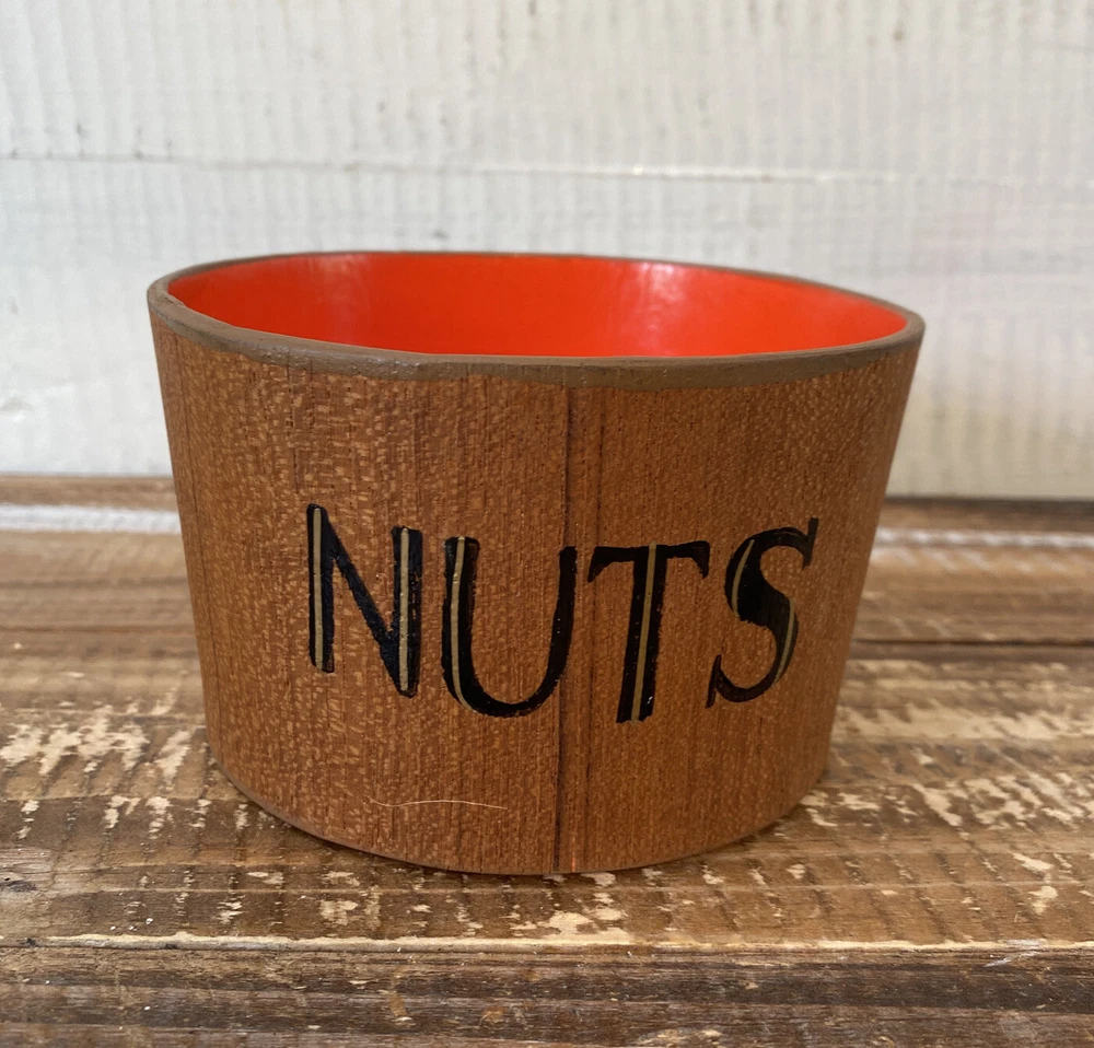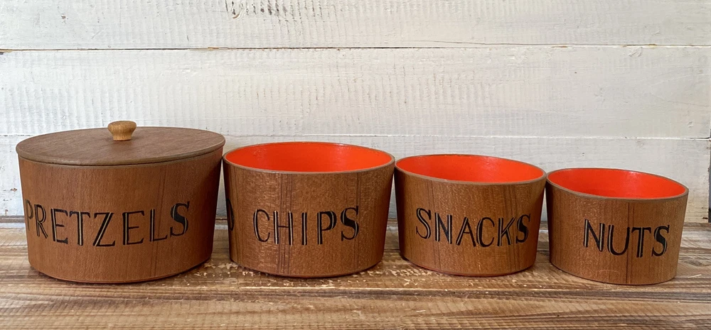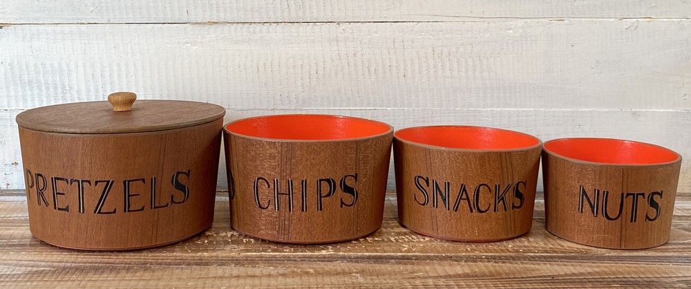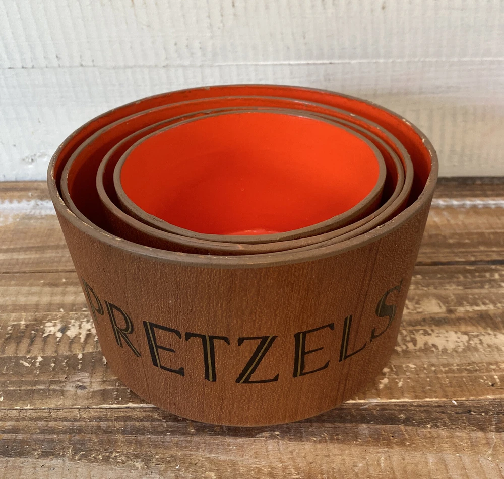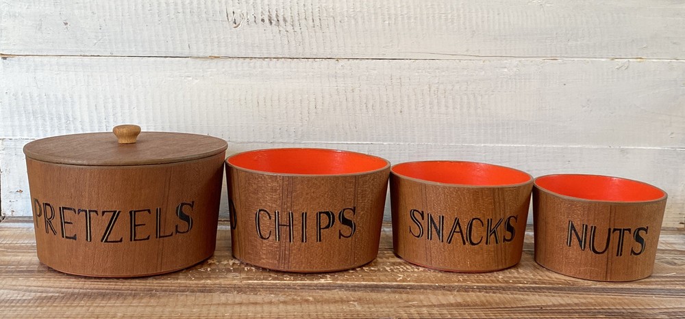 Vintage Mid-Century Nesting Snack Bowls Viking Import from Japan Wood outside, lacquered orange interior Nesting bowls with lid Largest pretzel bowl measures 6.25" x 3.5"...