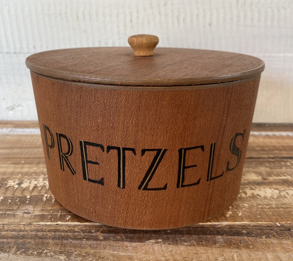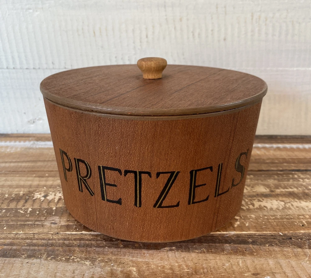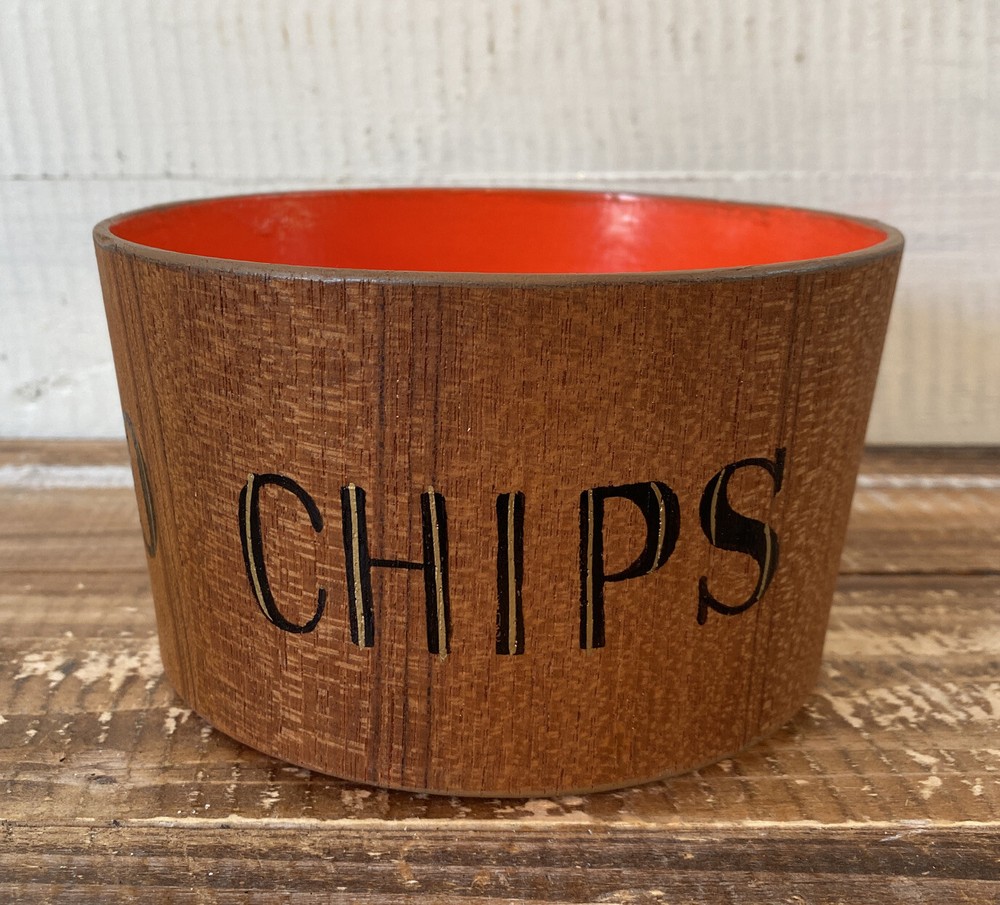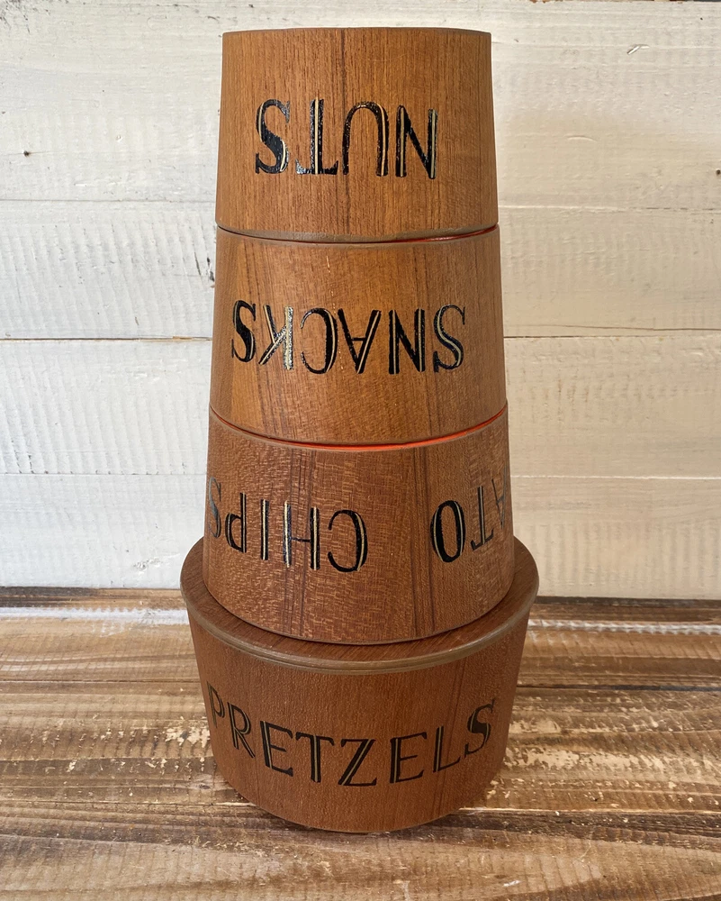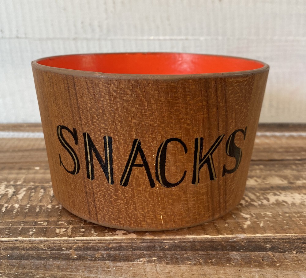 Vintage Mid-Century Nesting Snack Bowls Viking Import from Japan Wood outside, lacquered orange interior Nesting bowls with lid Largest pretzel bowl measures 6.25" x 3.5"...