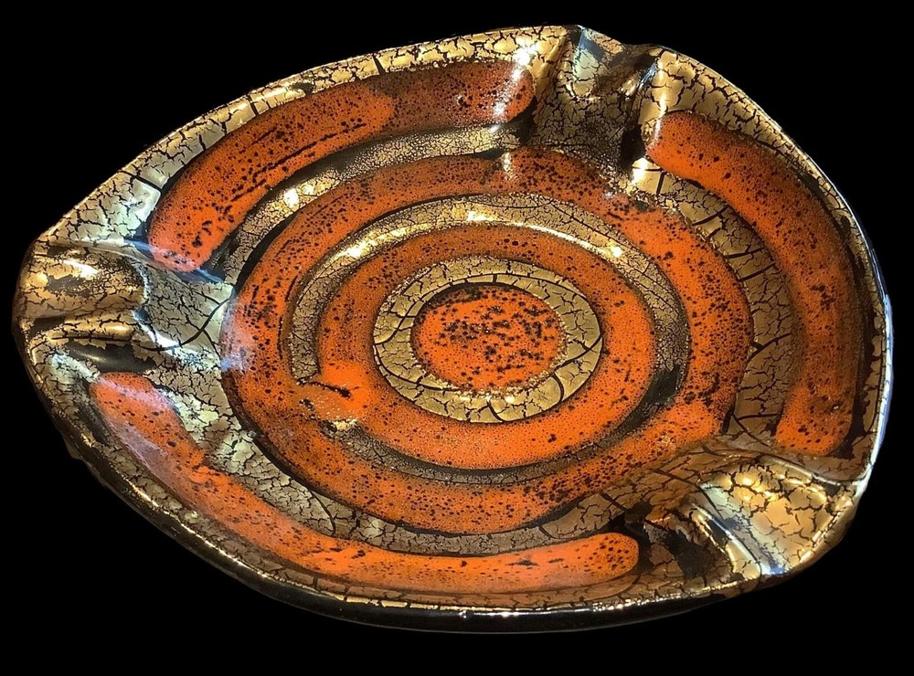 Vintage Mid-century Orange And Gold Ashtray Hollywood Glam 7.5" At Widest Point. Stunning ashtray in perfect condition, no chips or cracks, fantastic glaze! 3 cigarette divets. See all pics.