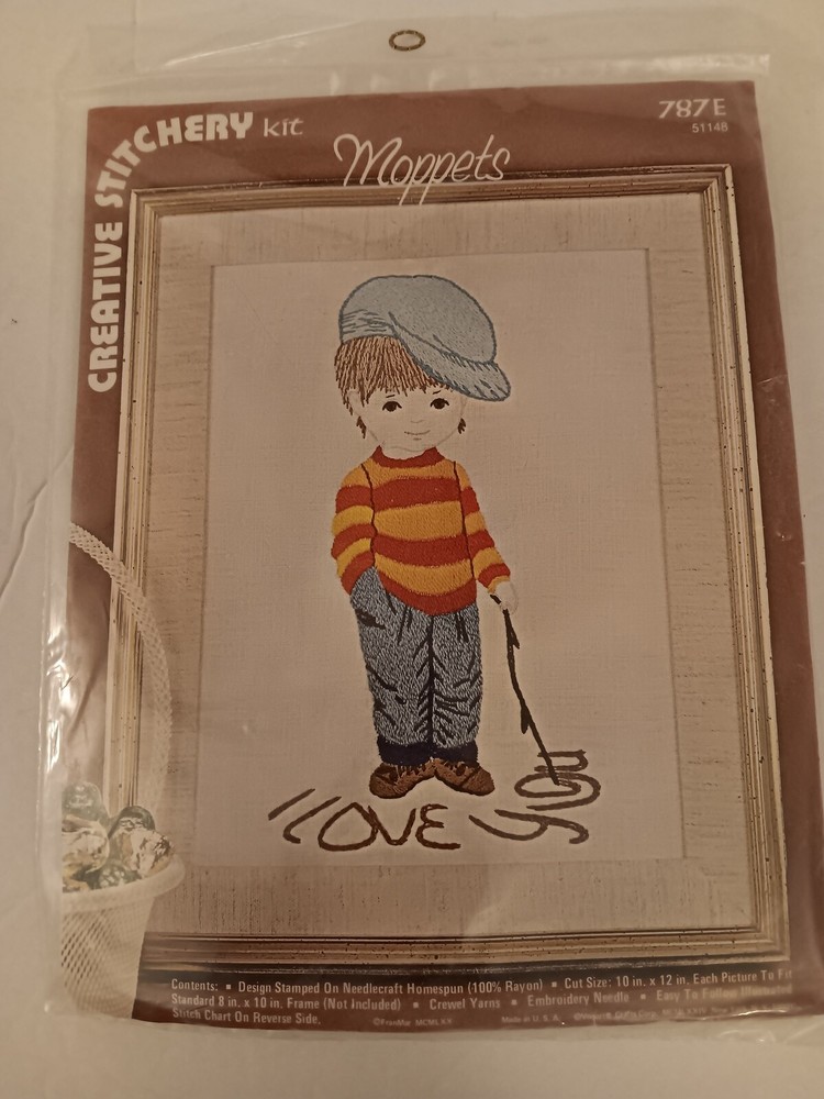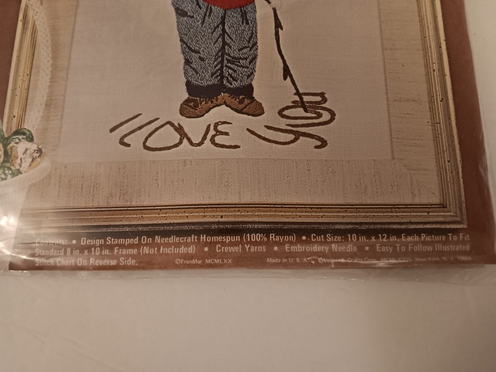 New Old Stock Item Still Factory Sealed Vintage Needlework Kit From 1974 Completed Size Approx. To Fit 8" X 10" Frame (Frame NOT Included) Features An Adorable Child With A Stick And The Phrase "I Love You" Kit Contains: Design Stamped On Needlecraft Homespun (100% Rayon) / Cut Size 10" X 12" To Fit Standard 8" X 10" Frame ( NOT Included ) / Crewel Yarns / Embroidery Needle / Easy To Follow Illustrated Stitch Chart On Reverse Side
