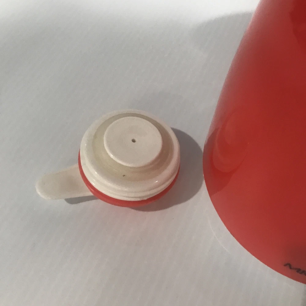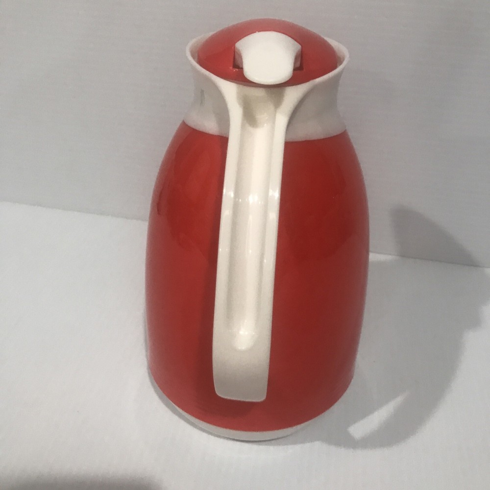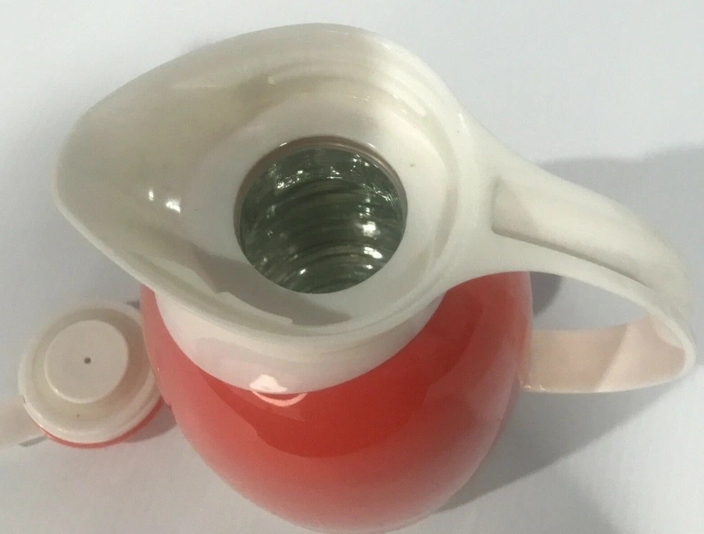 Great Mid-Century Modern Styling Orange and White Caraffe Thermal glass interior Excellent condition Perfect for your vintage or modern kitchen Measures approx 10" high, 17" around at widest part 1 Quart capacity