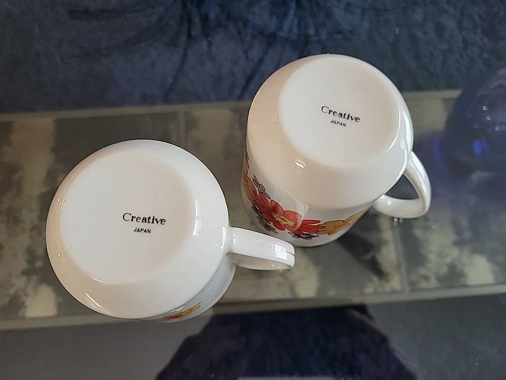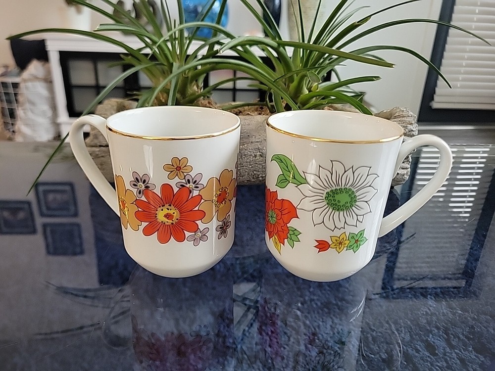 2 Beautiful Vintage Mugs Yellow Orange White. Gold trim. Marked Creative Japan on the bottom. Flowers Mid Century Mod. Each Cup is 3 6/8" tall. 4 3/8" wide including the handle. 3" top opening. Excellent clean condition. No damage. Gold trim is all there. AS SHOWN. SEE PICTURES AND USE THE ZOOM. NO RETURNS. THANKS FOR LOOKING AND HAVE A GREAT DAY :)