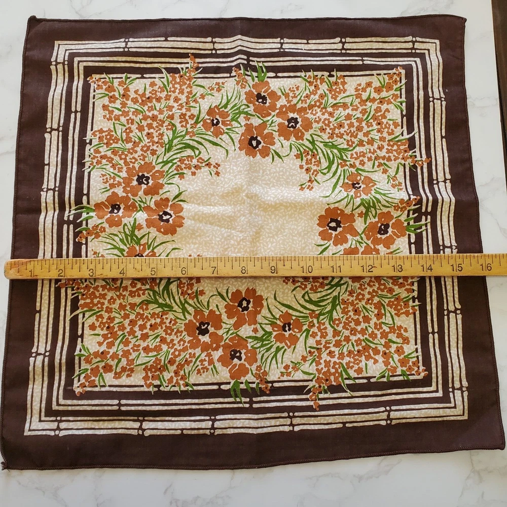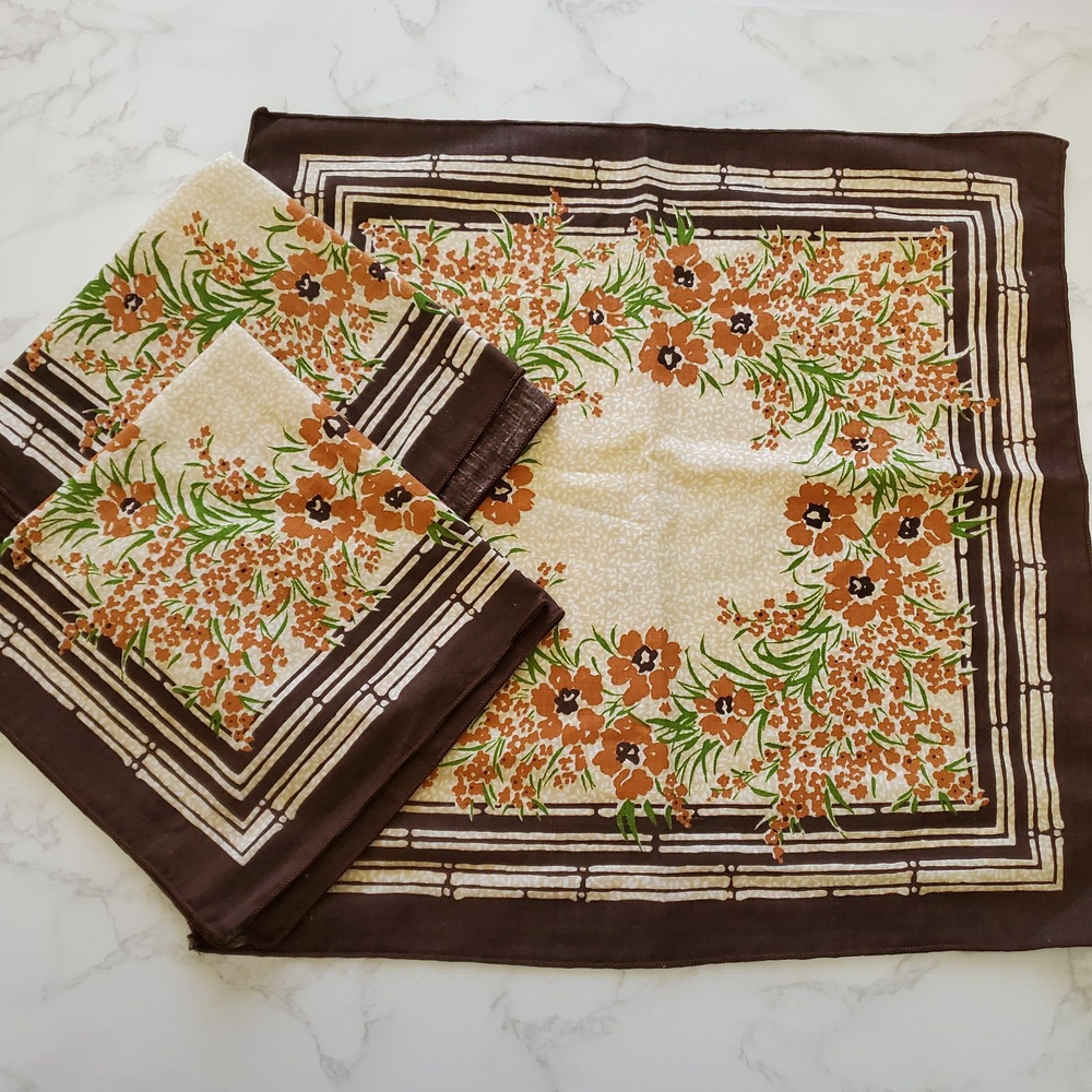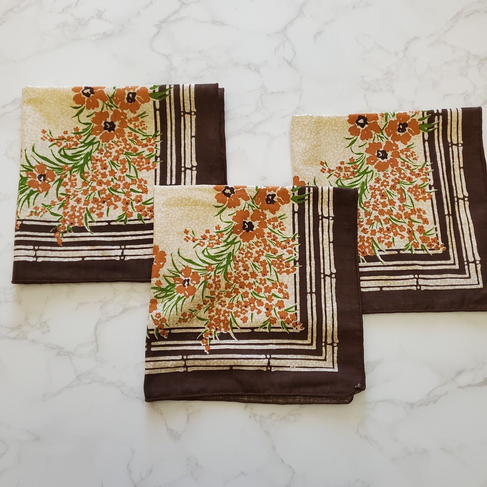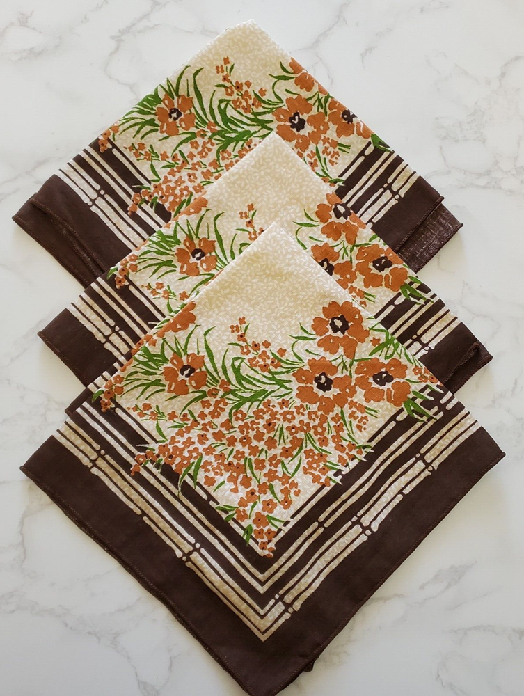 Vintage Napkins 3 Brown Beige Orange Floral Print Cotton Blend 16"sq Mid Century Good Condition- General Light Wear- See photos. Ships Fast- Smoke Free! CLOTHING AND FABRIC ITEMS: All clothing and fabric items have been steam cleaned and/or washed per eBay standards.