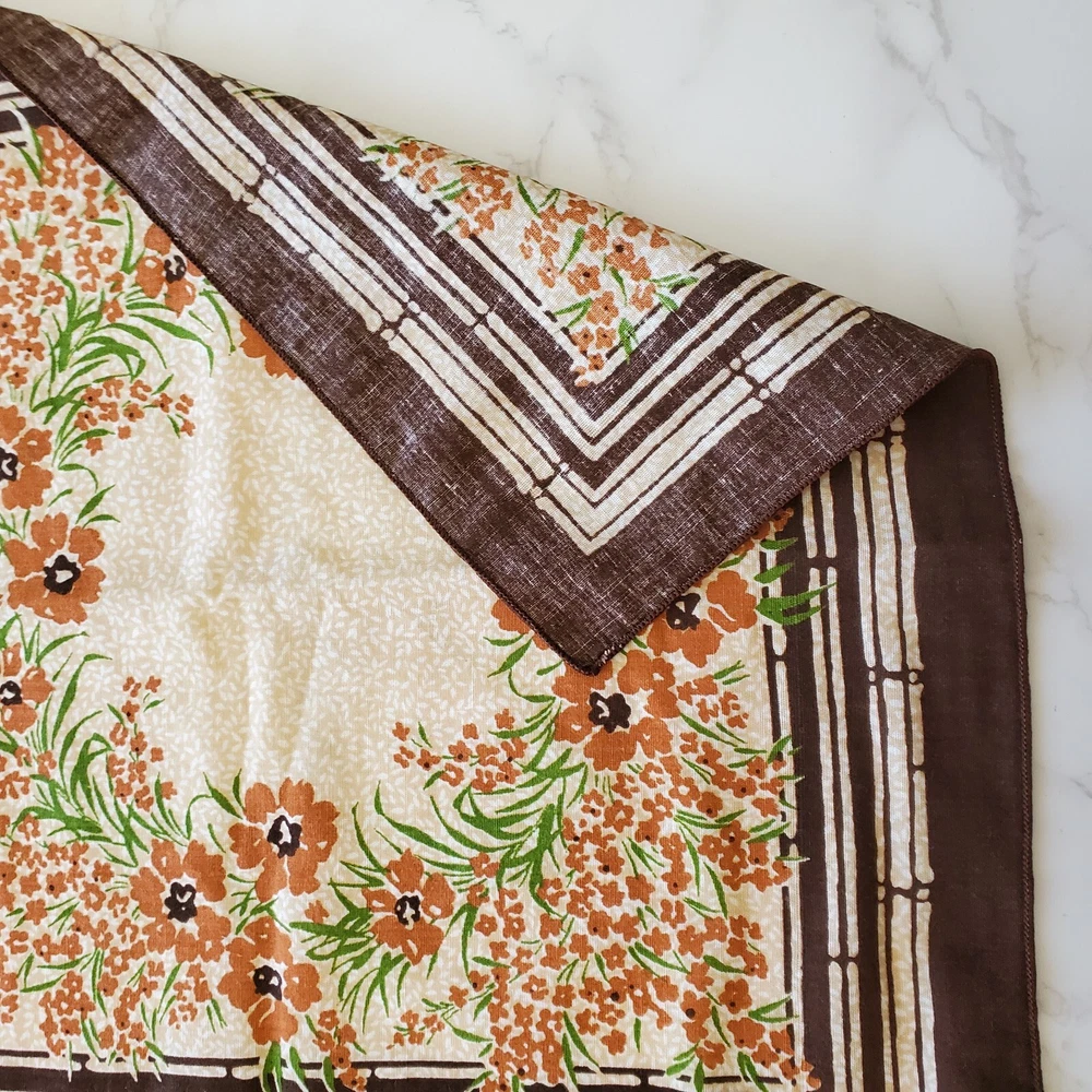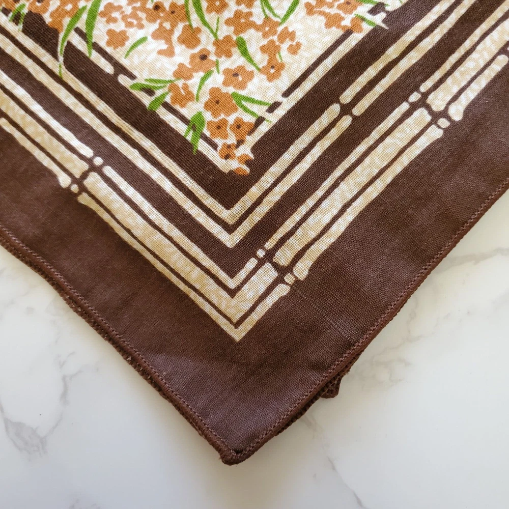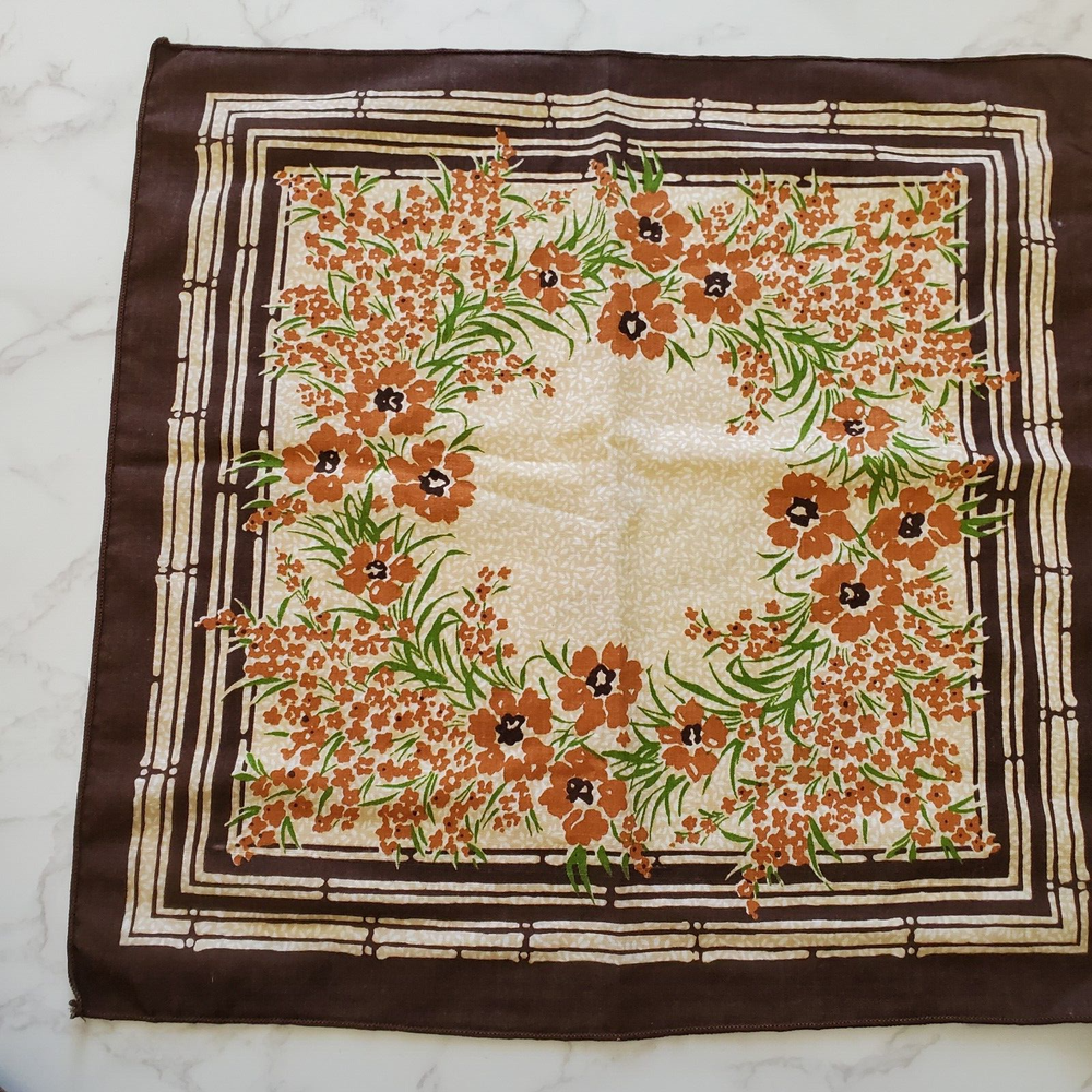 Vintage Napkins 3 Brown Beige Orange Floral Print Cotton Blend 16"sq Mid Century Good Condition- General Light Wear- See photos. Ships Fast- Smoke Free! CLOTHING AND FABRIC ITEMS: All clothing and fabric items have been steam cleaned and/or washed per eBay standards.