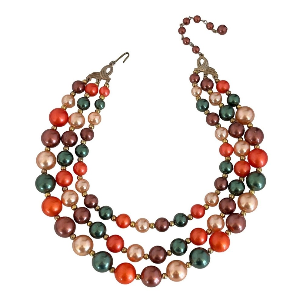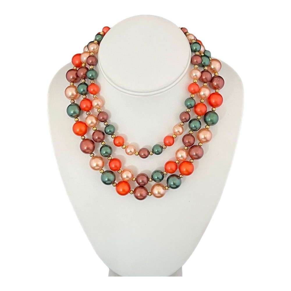 This stunning necklace is gold tone and features beads in autumn tones. It measures approximately 16.5 inches at its longest length. It is sure to make a beautiful gift or be a treasured addition to your collection. Madsky 1S