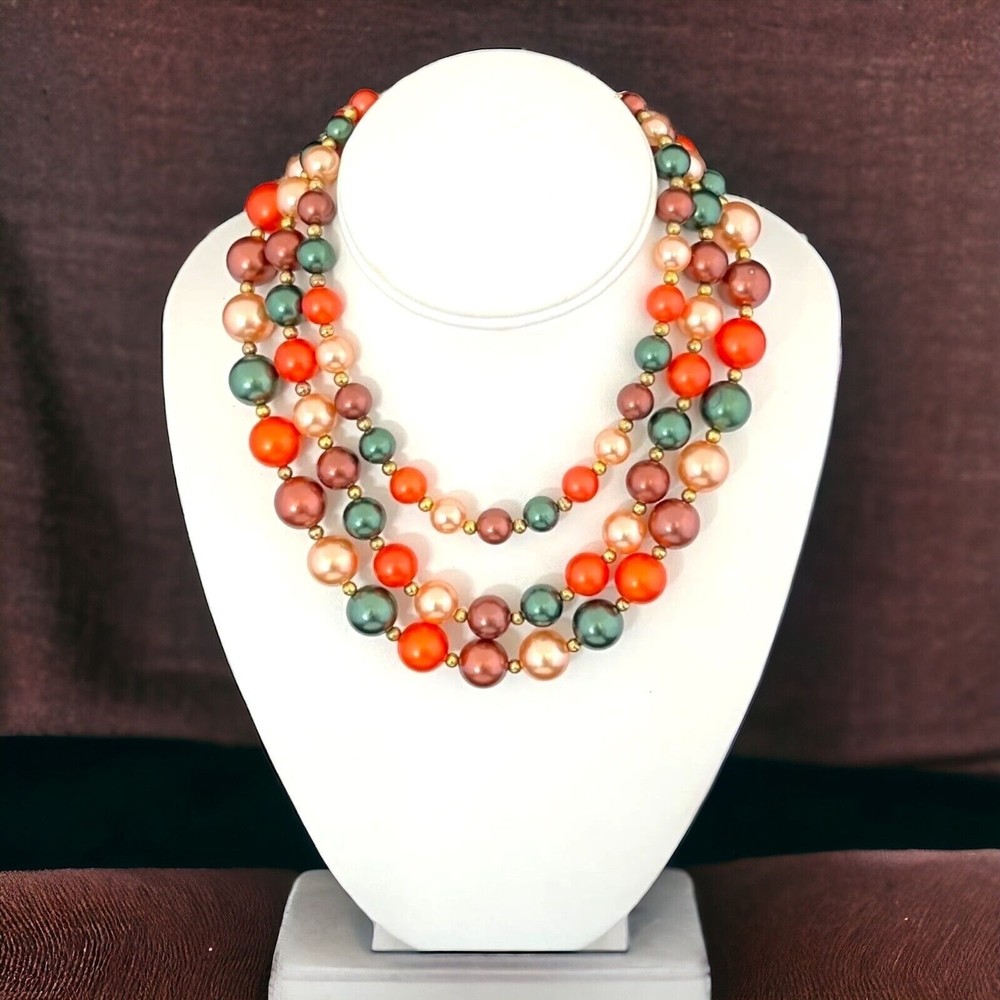 This stunning necklace is gold tone and features beads in autumn tones. It measures approximately 16.5 inches at its longest length. It is sure to make a beautiful gift or be a treasured addition to y...