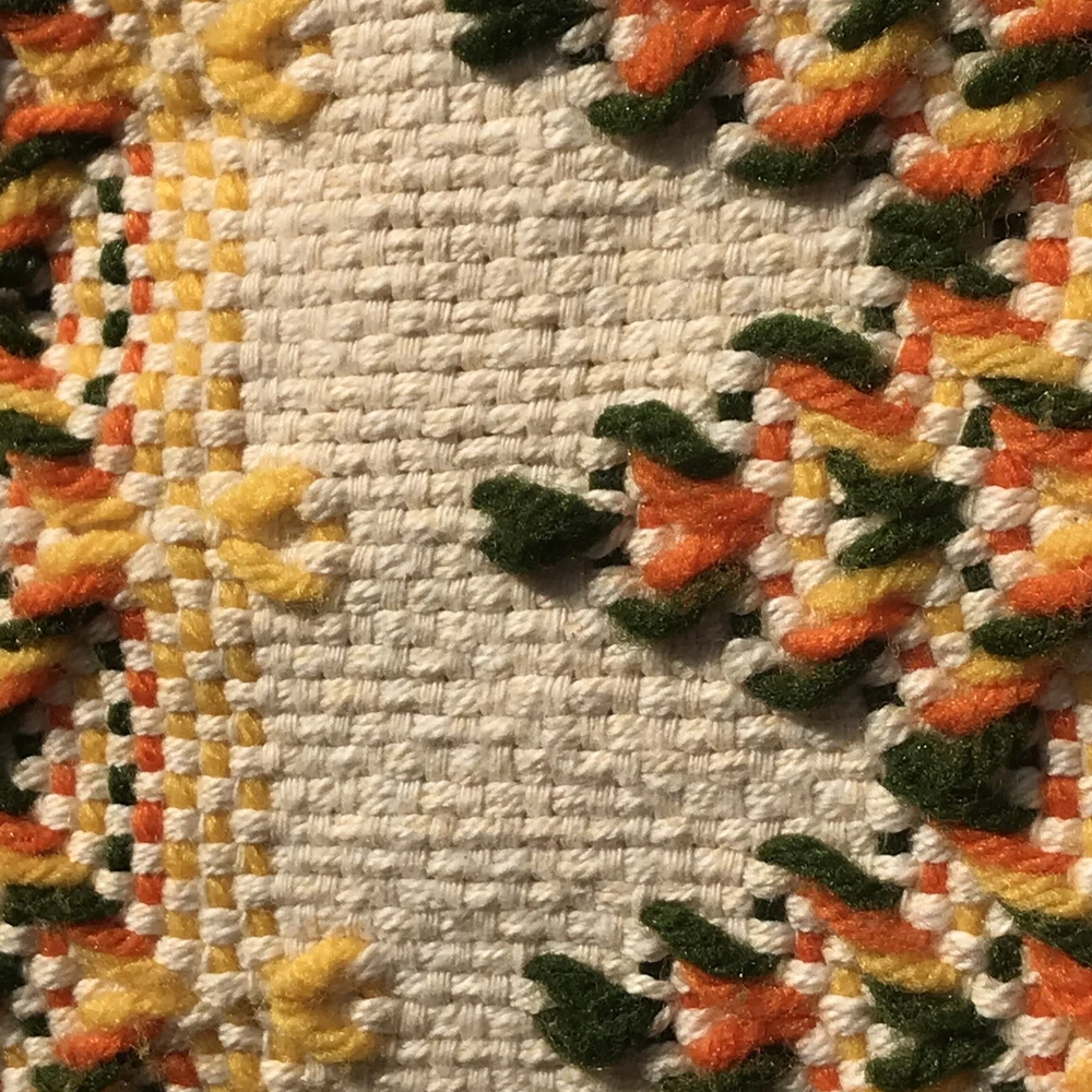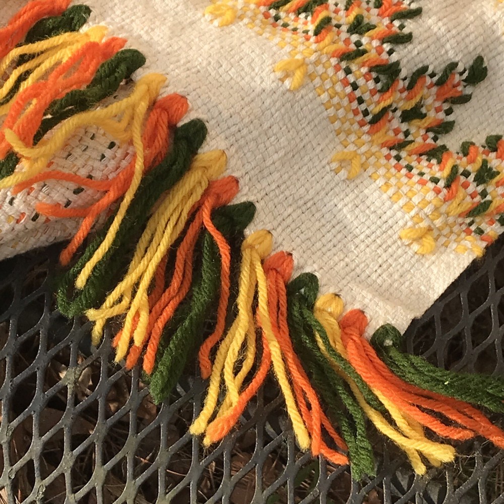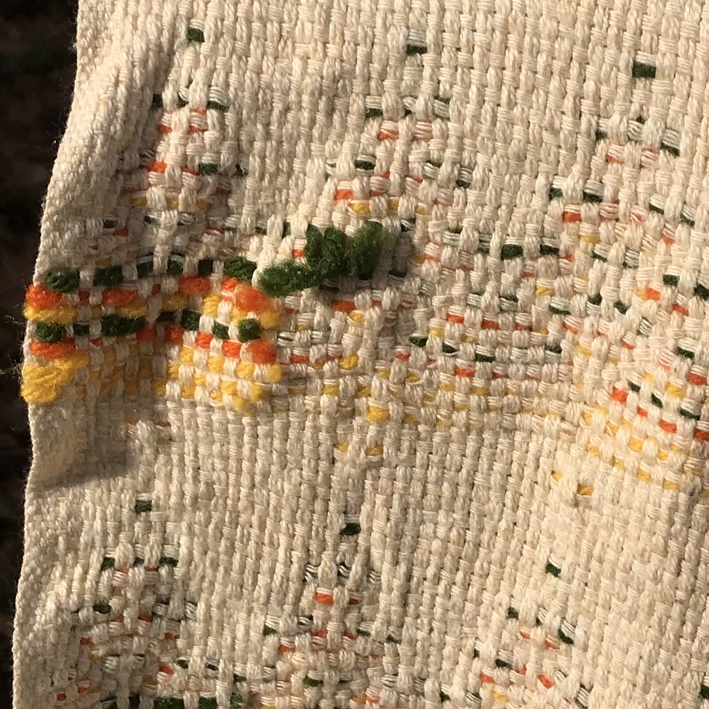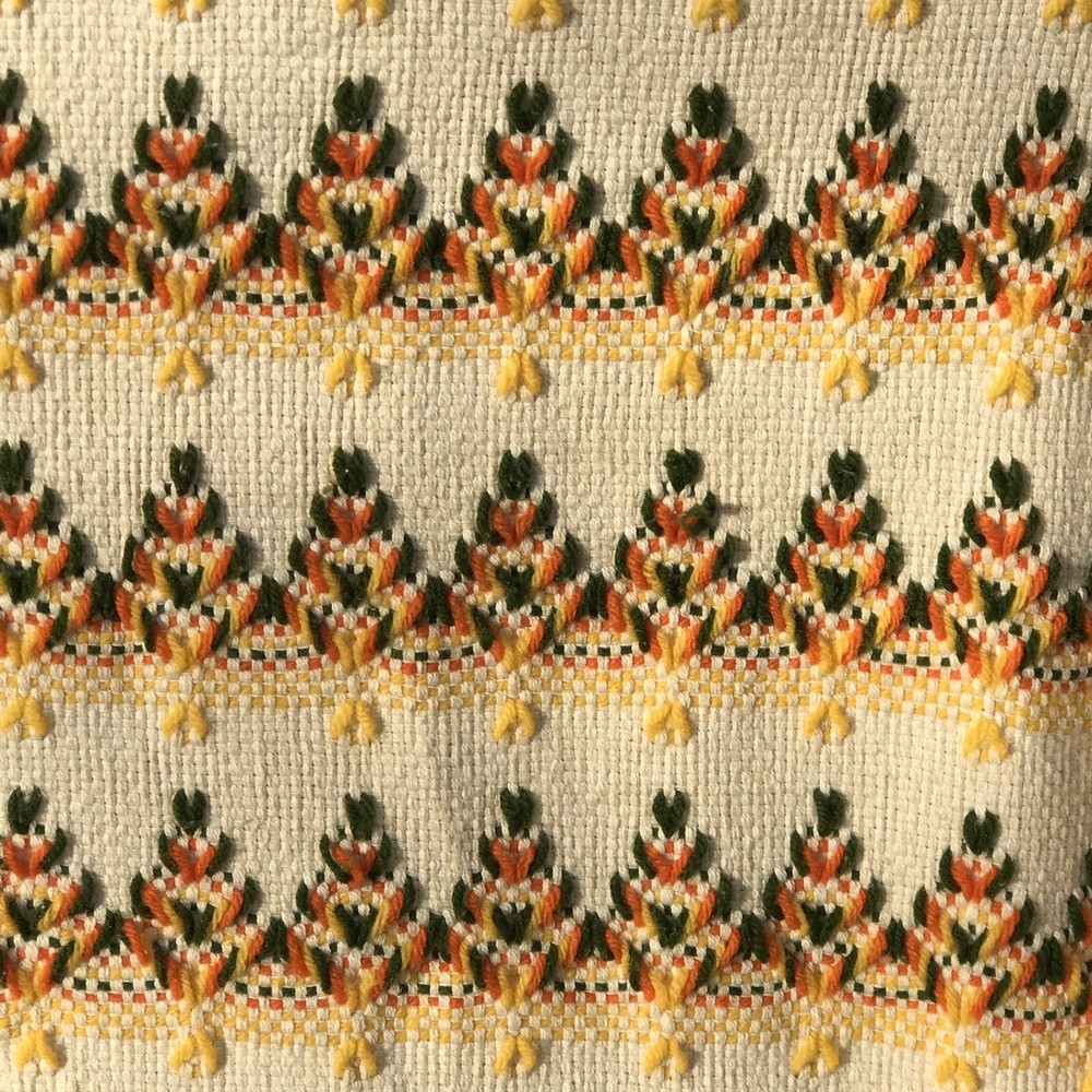 Unique vintage throw that has been embellished with yellow, orange, and green yarn. The woven cloth appears to be a blend of two types of cotton that have a very slight color variation. I have repeatedly thought they were very light stains, but they wouldn’t be on the back and shift depending on angle. Hopefully you will be able to see what I mean from the photos. Fairly sure this dates to the mid 70s and probably was made from a kit. Measures appropriately 45 x 66 without the fringe. If you have any questions please let me know.