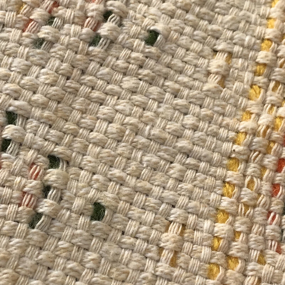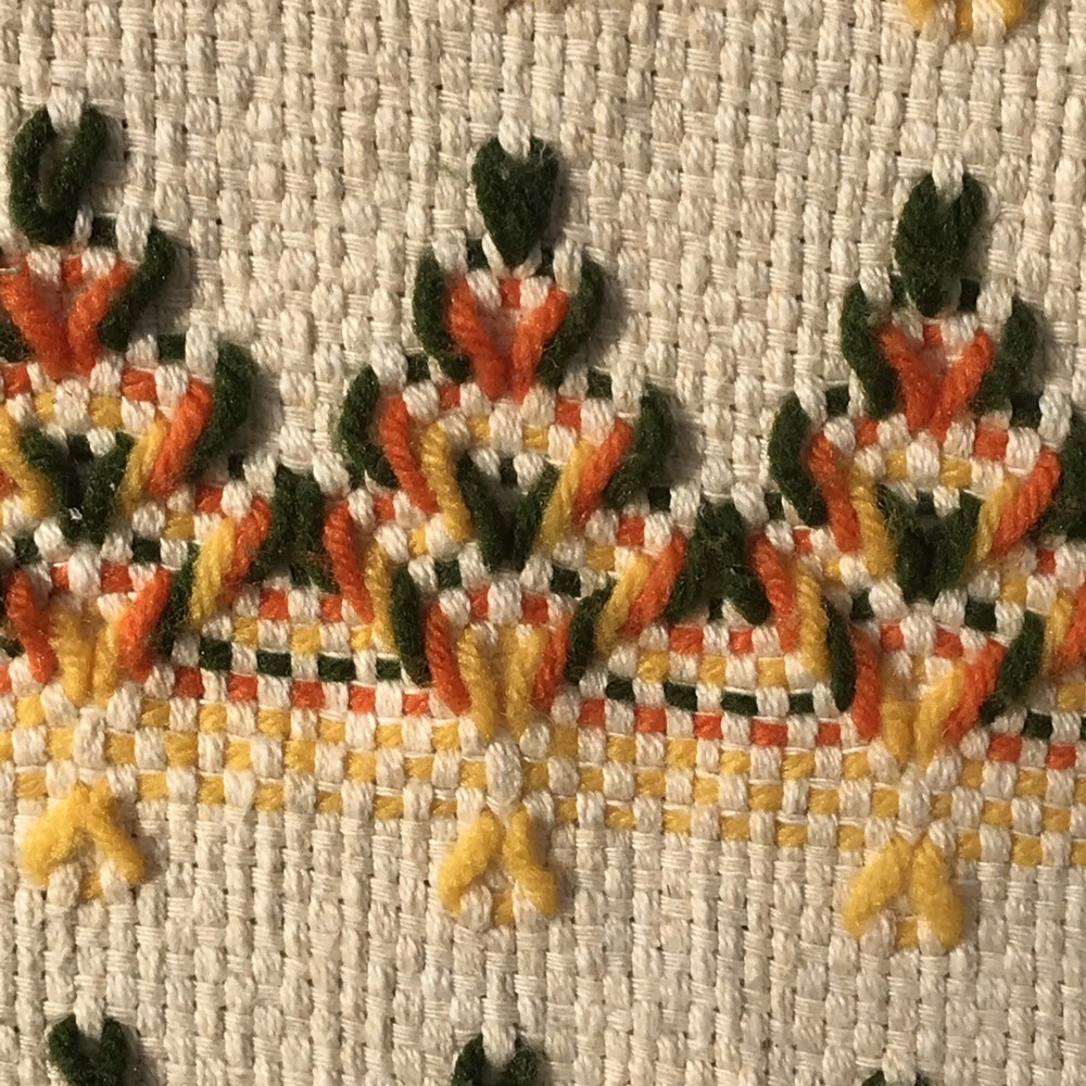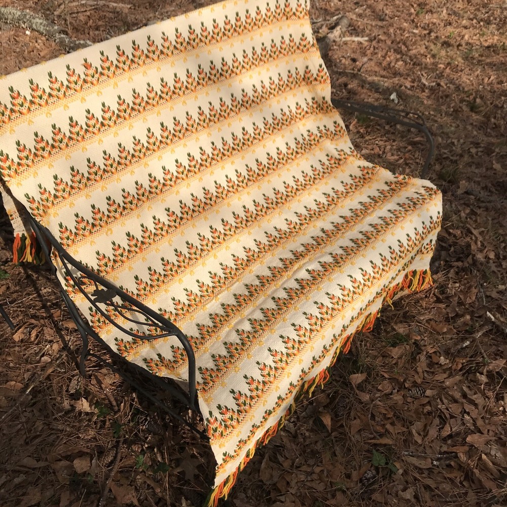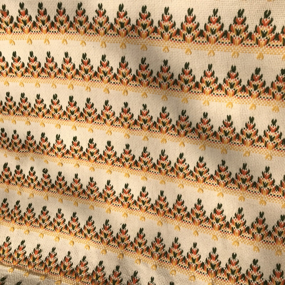 Unique vintage throw that has been embellished with yellow, orange, and green yarn. The woven cloth appears to be a blend of two types of cotton that have a very slight color variation. I have repeatedly thought they were very light stains, but they wouldn’t be on the back and shift depending on angle. Hopefully you will be able to see what I mean from the photos. Fairly sure this dates to the mid 70s and probably was made from a kit. Measures appropriately 45 x 66 without the fringe. If you have any questions please let me know.