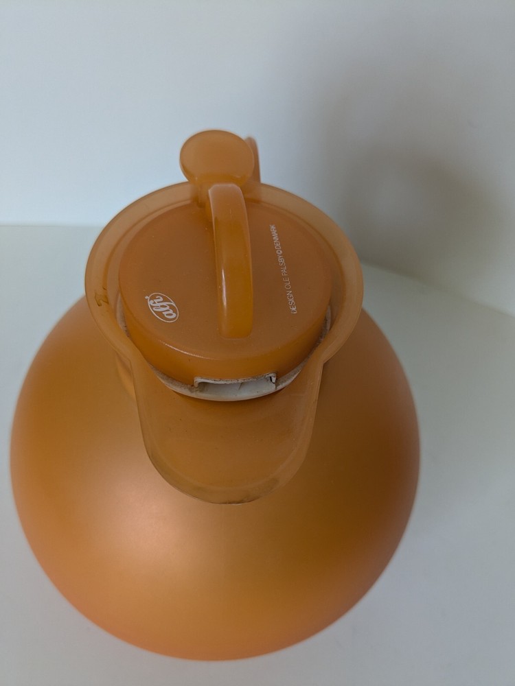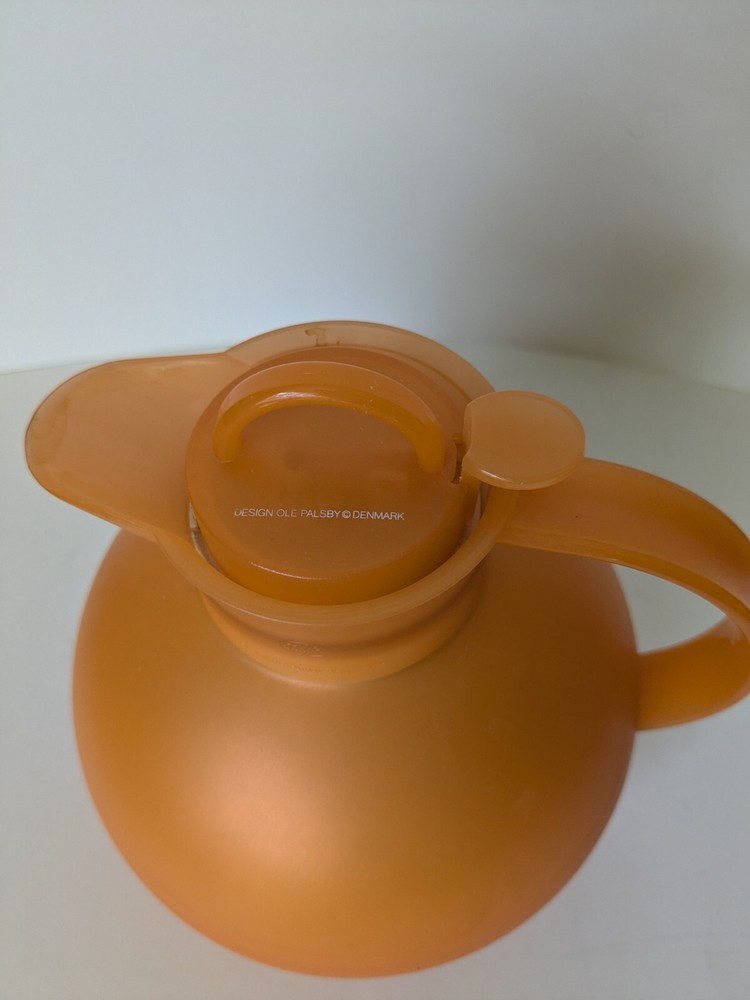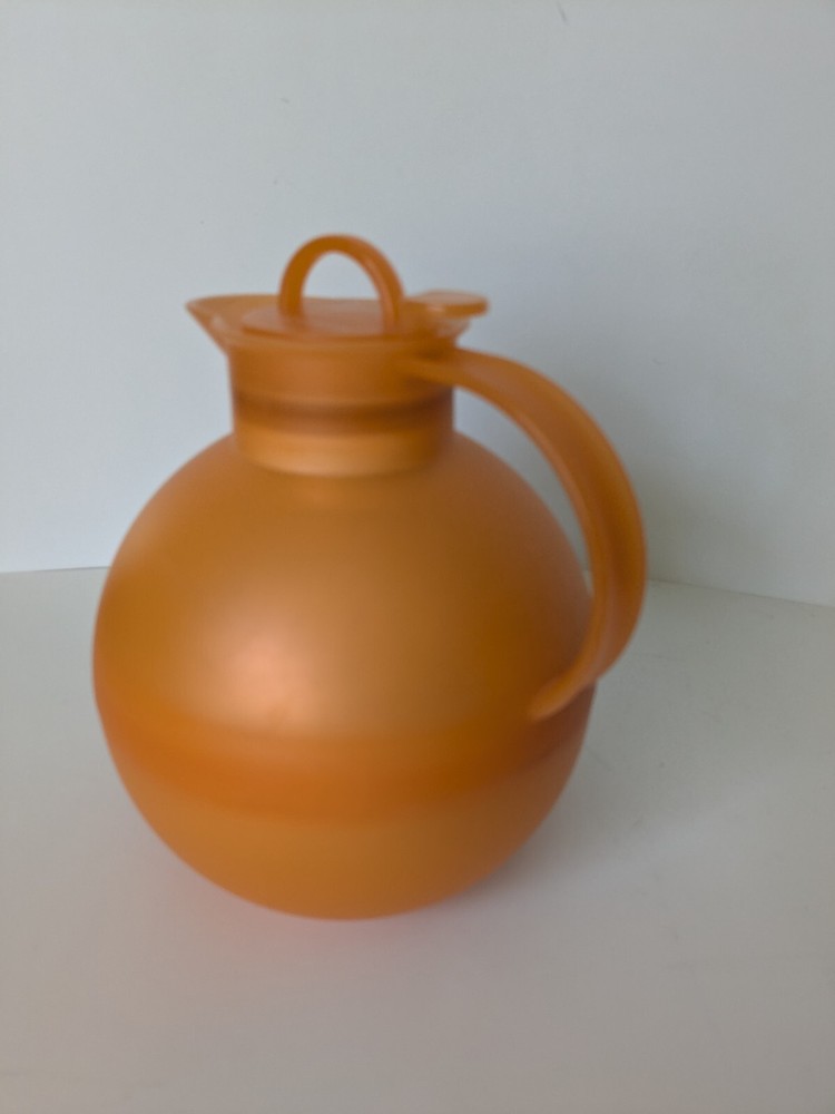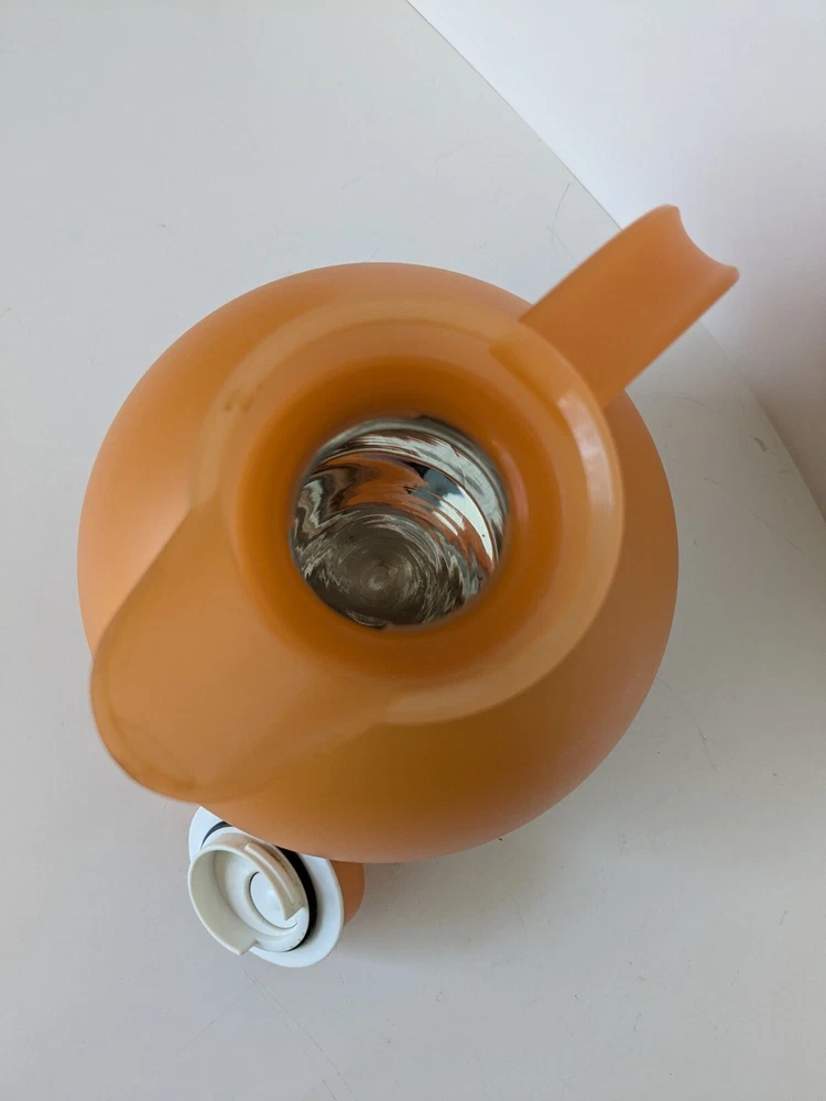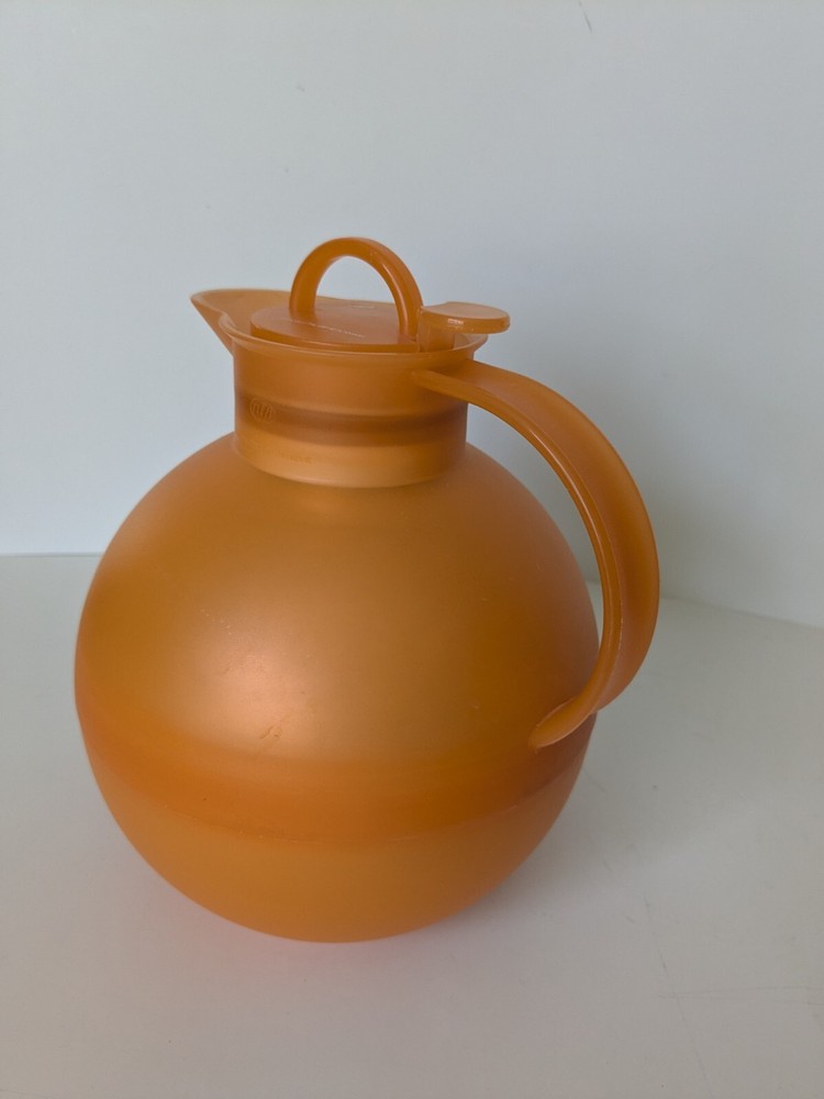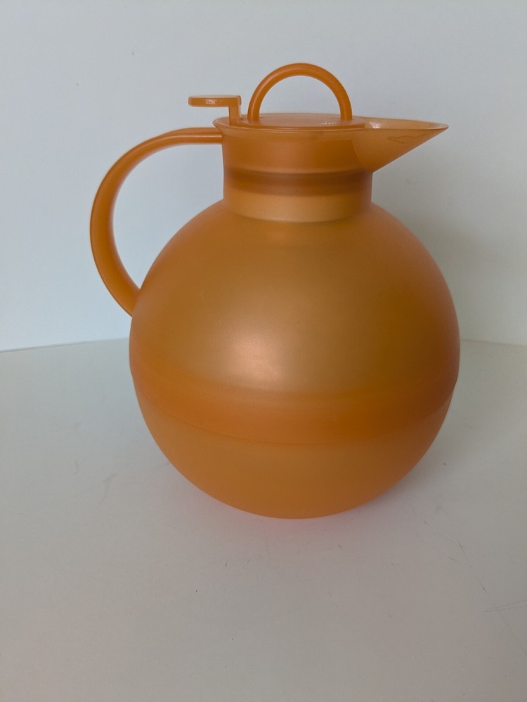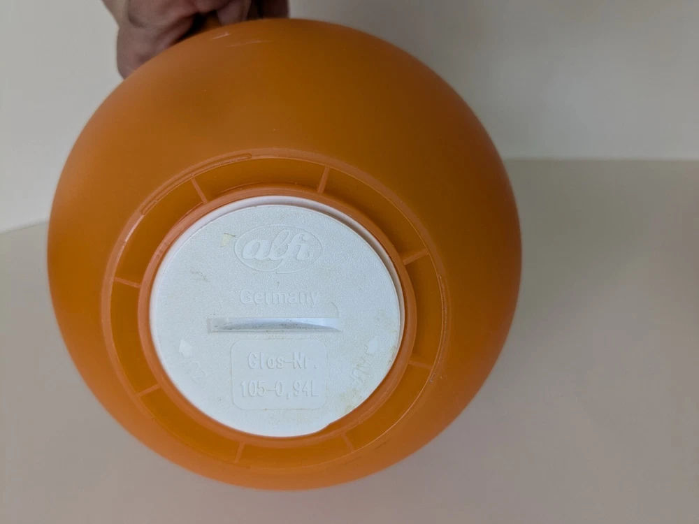 This is a fabulous vintage Alfi insulated plastic thermos/pitcher. It is featured here in a fun retro orange. The condition is very good for its age with a very clean inside. Designed to keep a quart of liquid hot or cold while looking brilliant. Measurements: Approx: 8 in high and 7 inches wide to the handle