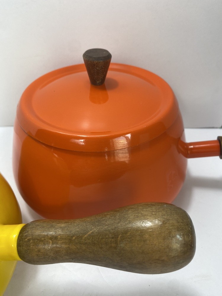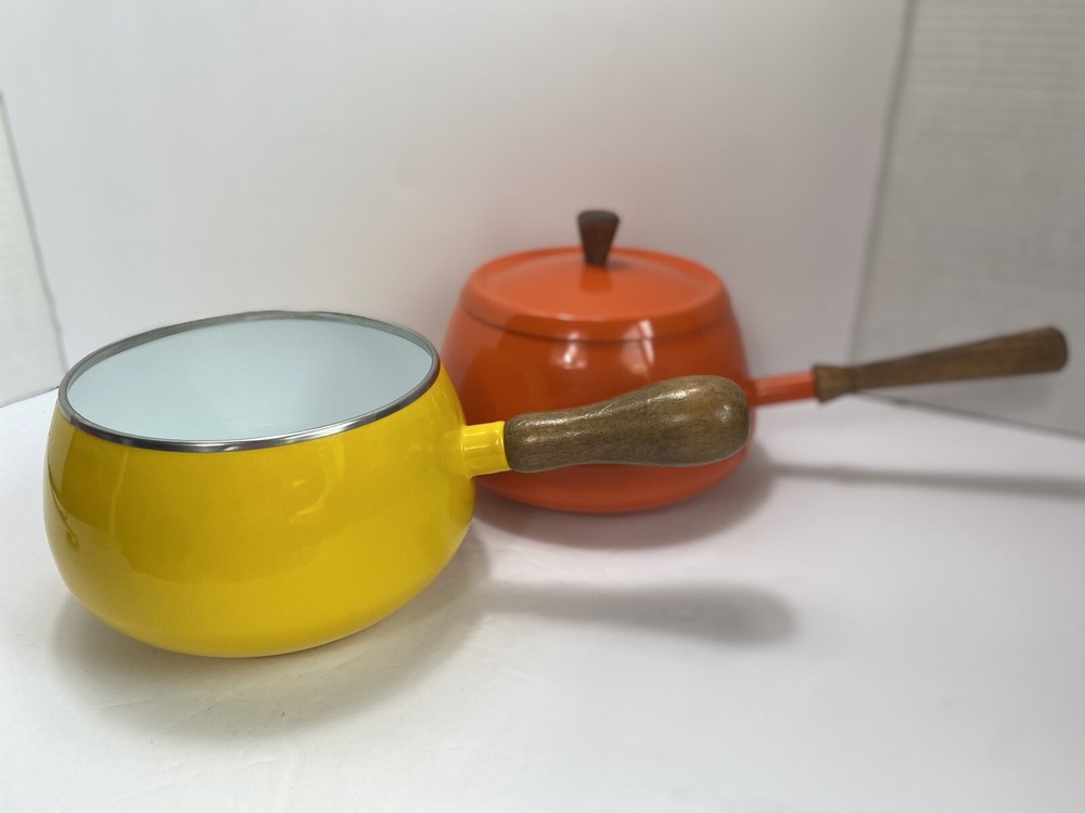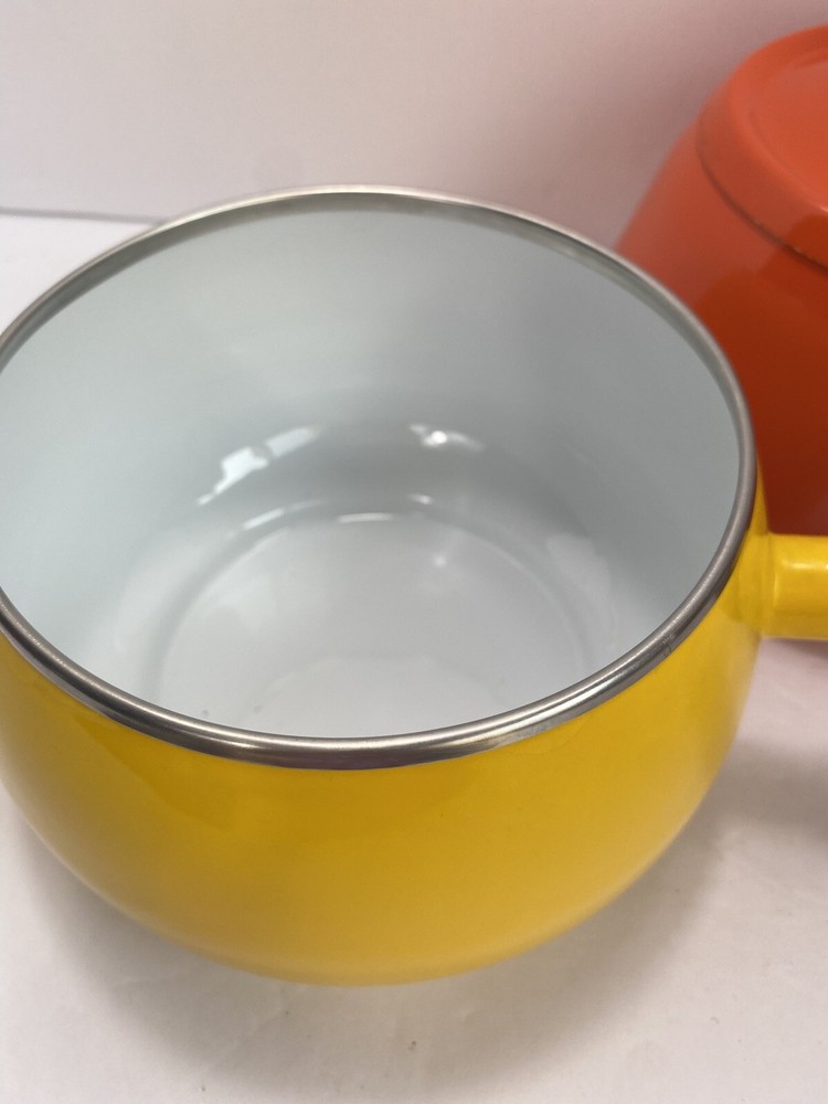 Add some vintage flair to your dinner parties with this set of fondue pots. The orange and yellow color combination gives a cheerful and fun vibe. Made of aluminum, these pots are sturdy and perfect for serving your favorite fondue recipes. The set includes a stand and fondue pot, making it easy to set up and use. Made in Japan, these fondue pots are a unique addition to your kitchen tools and gadgets. Impress your guests with a fun and stylish fondue experience.