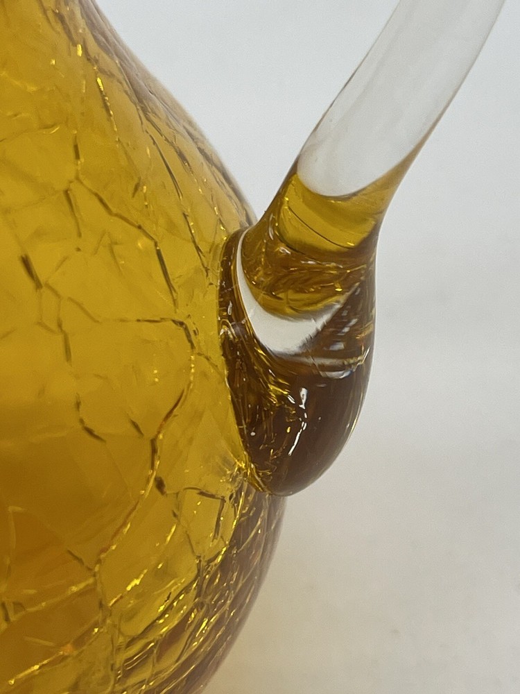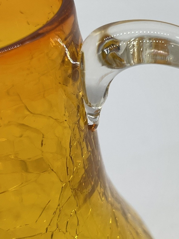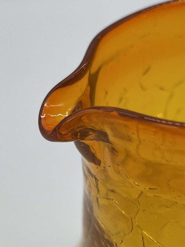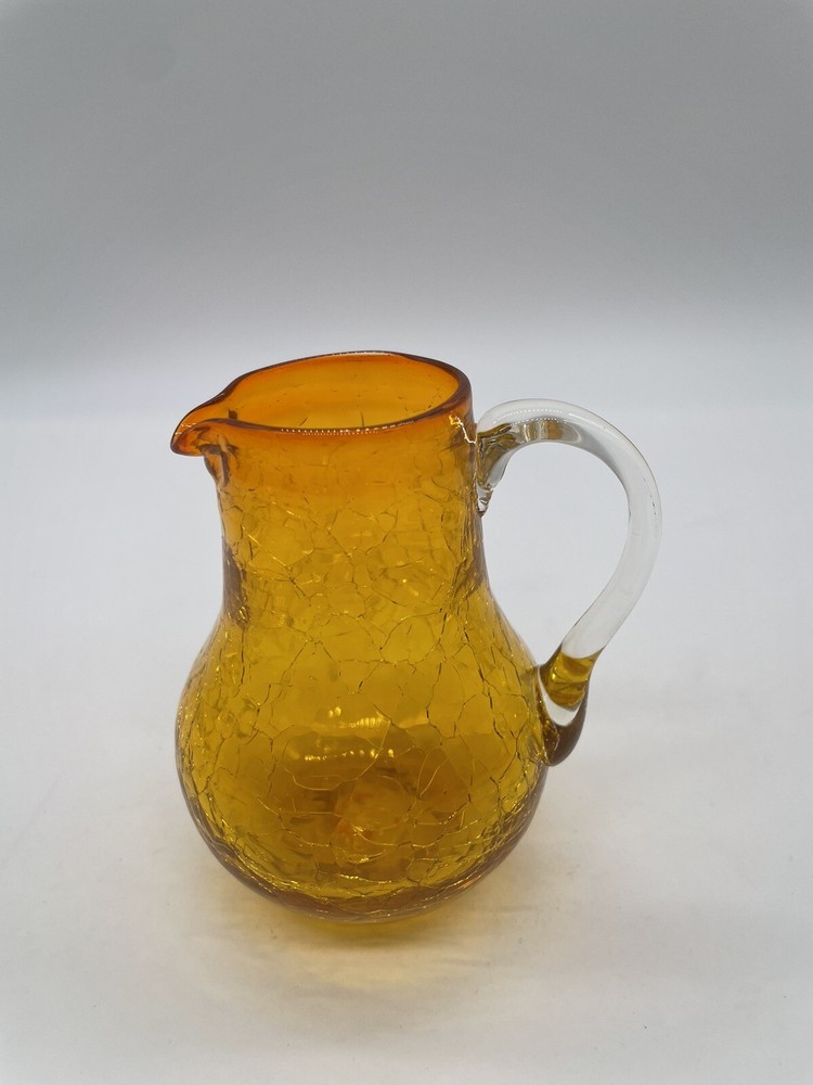 This vintage ArtGlass pitcher is a stunning addition to any Mid-Century Modern collection. The hand blown orange crackle glass is complemented by a clear glass handle, adding to its unique charm. Measuring at 3 1/2 inches in height, this round pitcher is perfect for serving any beverage. The glossy finish and all-over pattern make this pitcher a true work of art. It is recommended to hand wash only for optimal care. This original, vintage piece is perfect for any art-themed home decor. Pre-owned, used, vintage condition See photos for condition concerns See photos for measurements No chips
