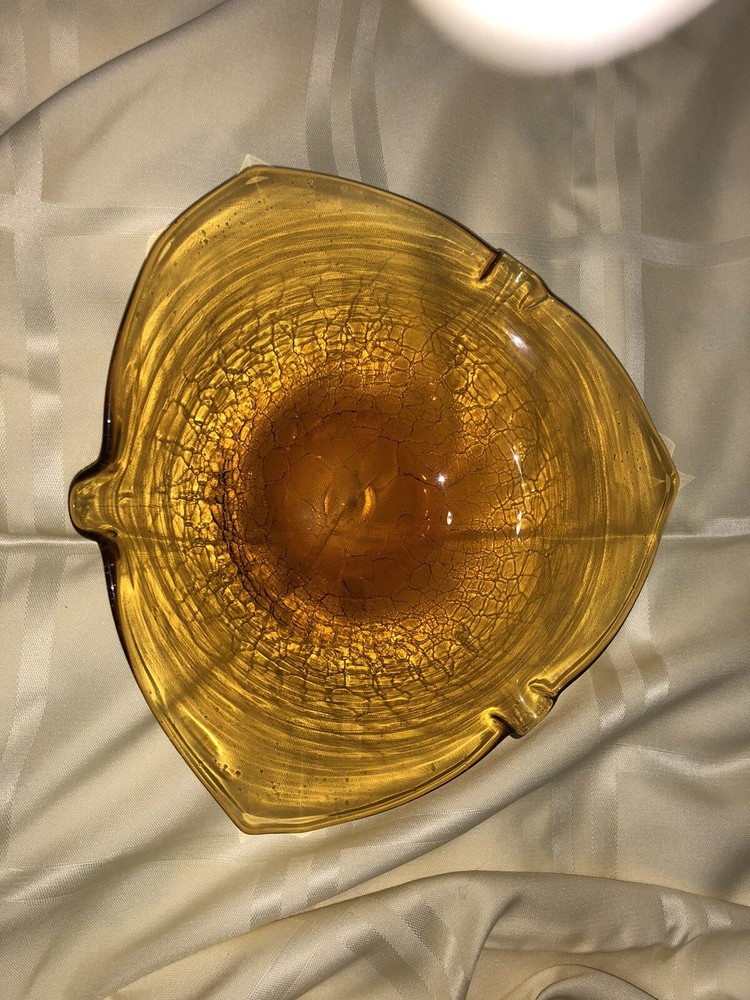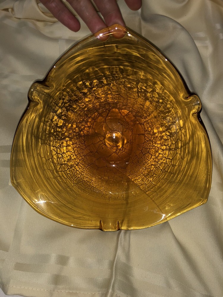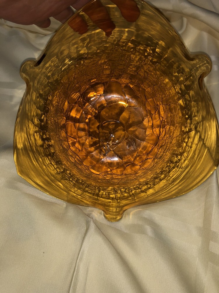 No chips or damage. Could be used to hold a centerpiece, fruit , candy or an ashtray or catchall. 9.25”x3”.Vintage Orange Crackle Glass MCM Dish. Condition is "Used". Shipped with USPS Priority Mail.
