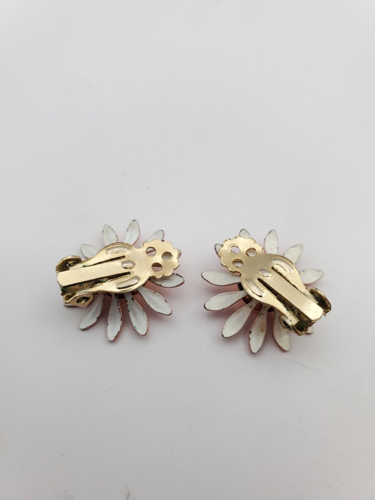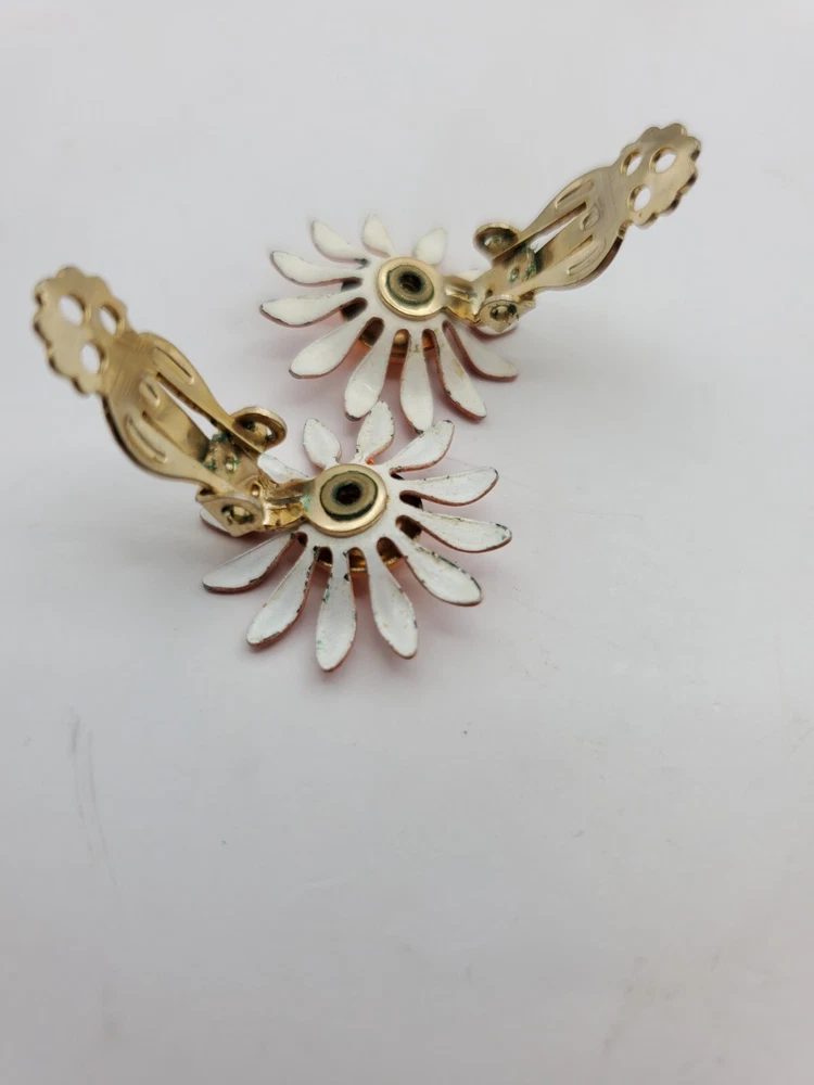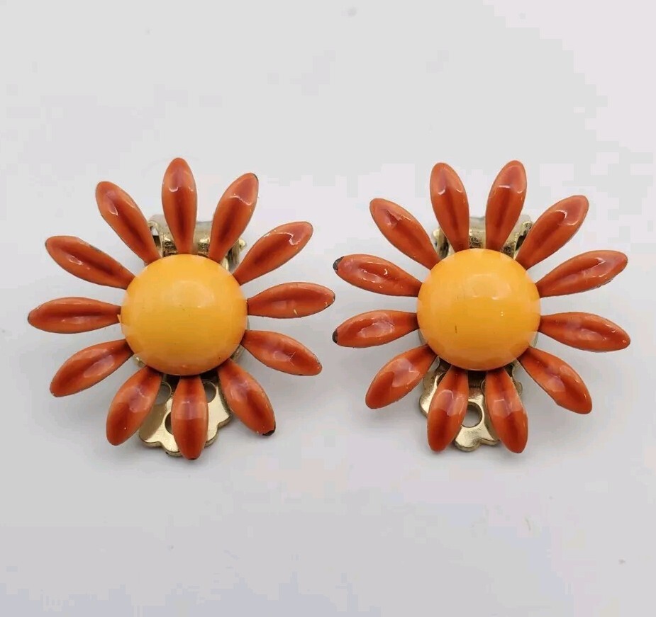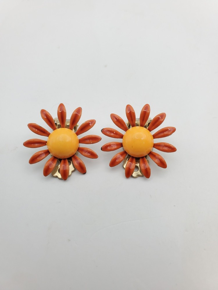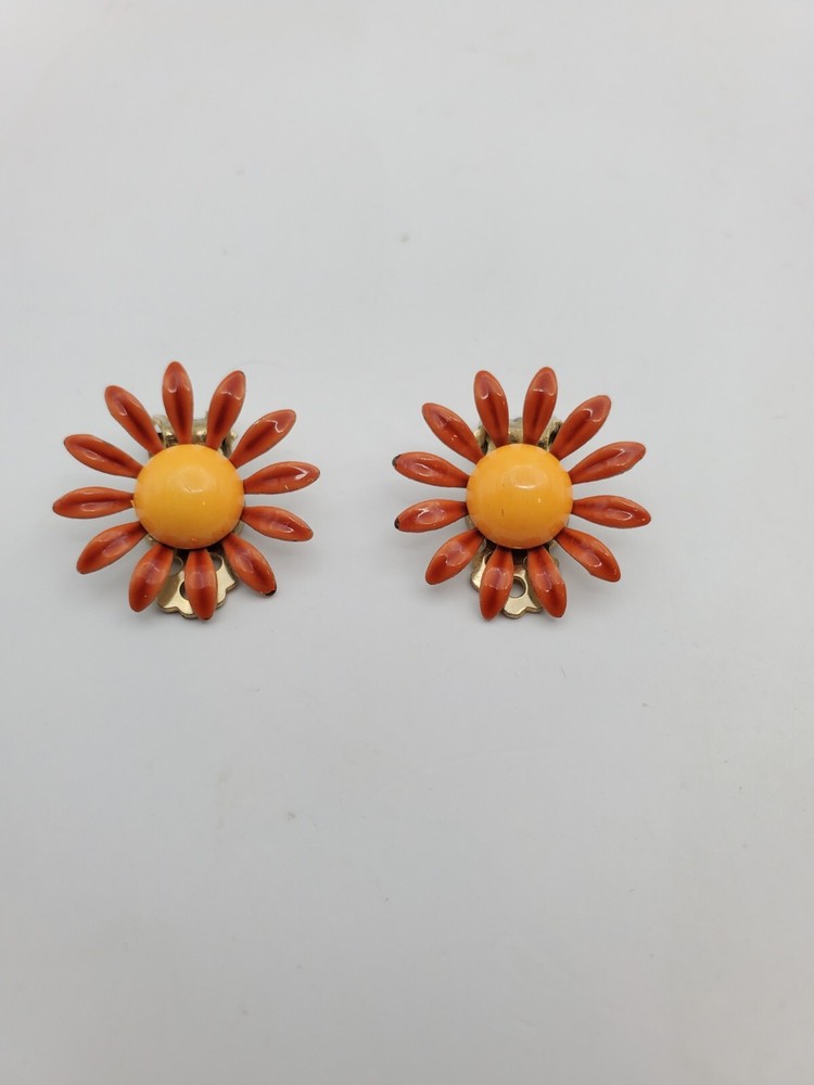 Vintage Enamel Flower Earrings. Orange petals and yellow centers. Great vintage condition. Clips on the back. Not signed. Measures 1 inches. Vintage and used items will show wear due to use and age (scratches, discoloration, patina, etc). I call out the most notable imperfections, but please consider pictures as a description of condition. Ships from a smoke and pet free home in recycled packaging. Happy to entertain offers, combine shipping and answer any of your questions.
