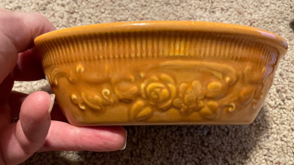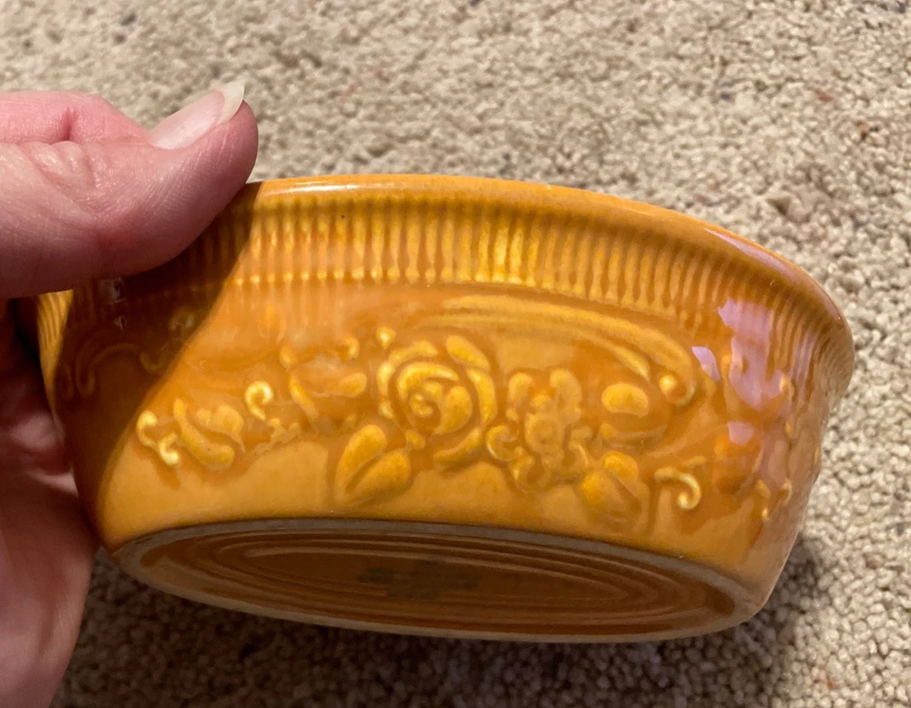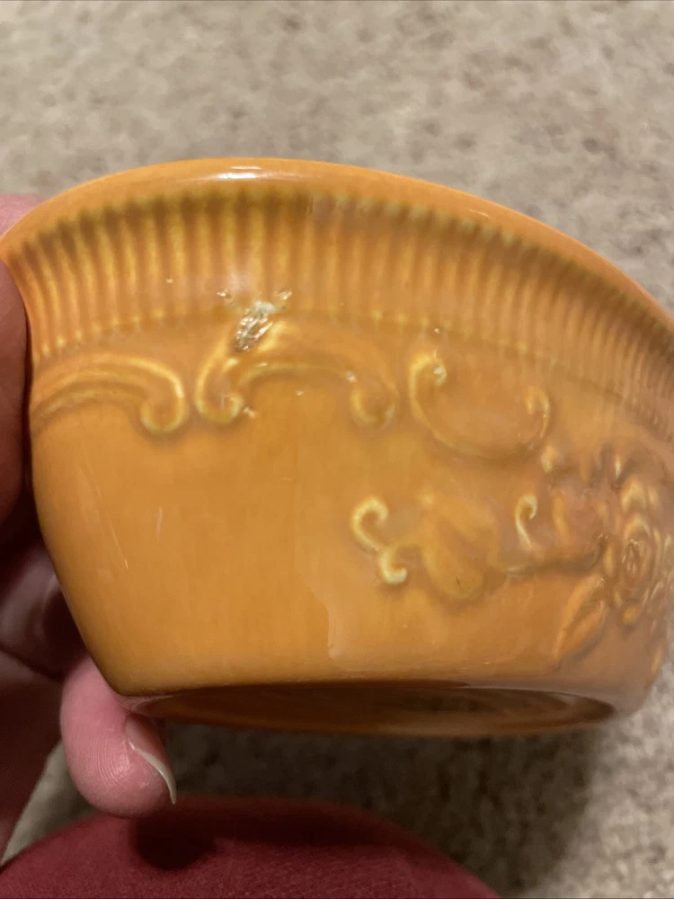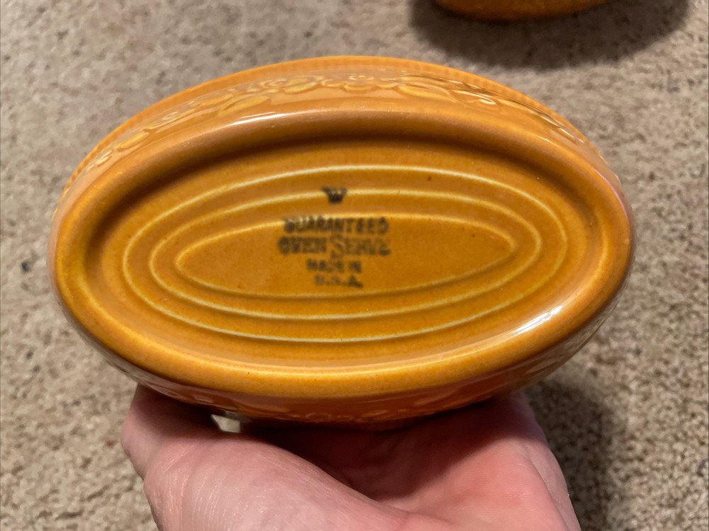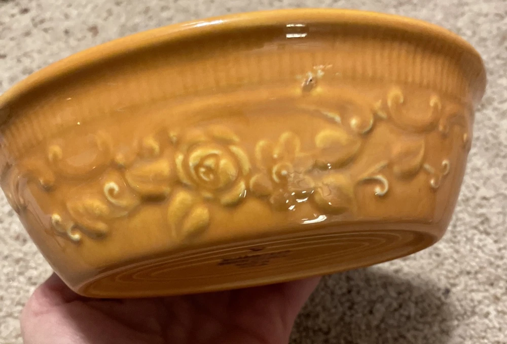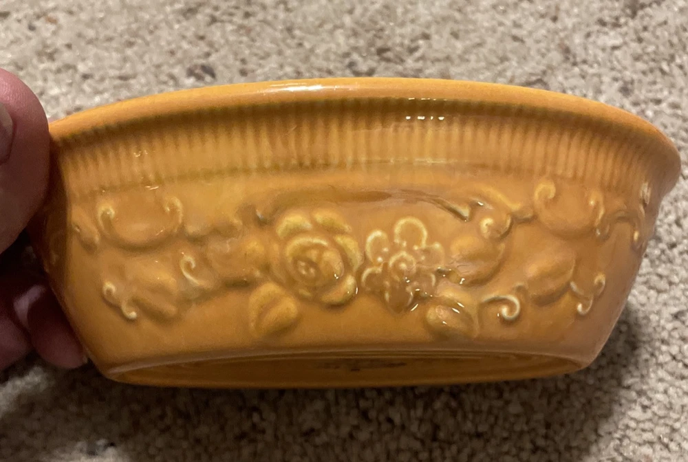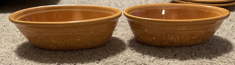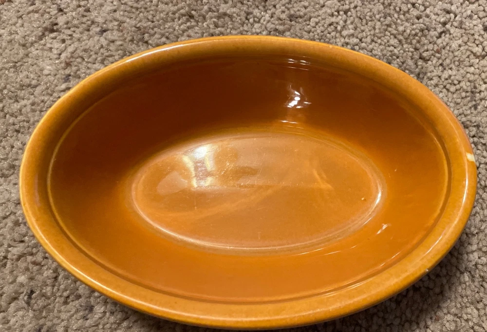Vintage orange ceramic oval bowl with embossed floral pattern from the United States. Measuring 6.25" in diameter and 2" in depth, this mid-century modern bowl is part of a two-piece set. It features a glossy finish and a printed backstamp, showcasing its originality. Perfect for all occasions, this decorative piece by the brand oven serve adds a touch of retro charm to any setting. These bowls are used. One bowl shows some crazing and the other has an area on rim that looks like a manufacturer flaw where paint is missing. It is smooth and not a chip. See photos. One bowl does have some different shading. The pink showing on right side of bowls in the pictures is a light reflection from my computer and not on the bowl itself.