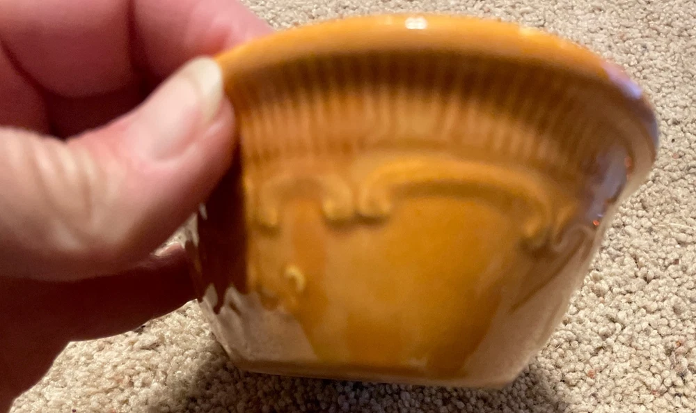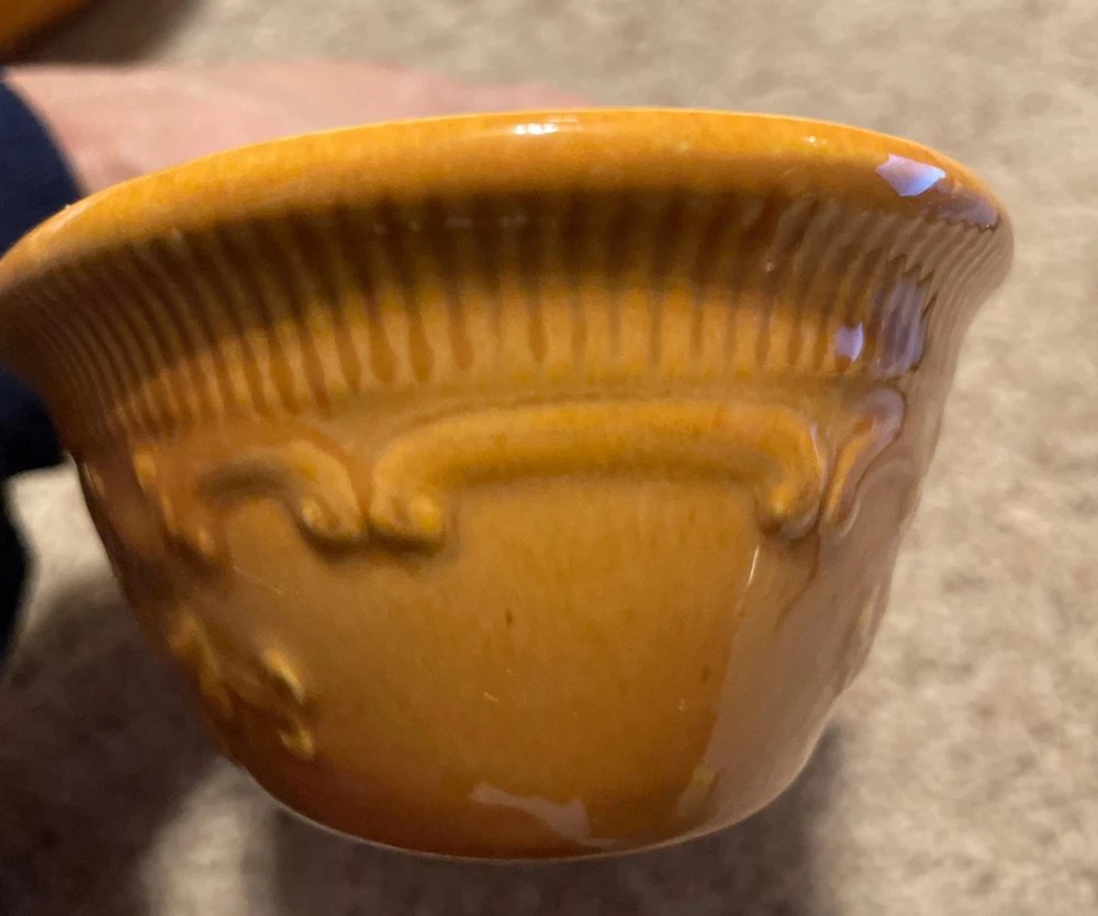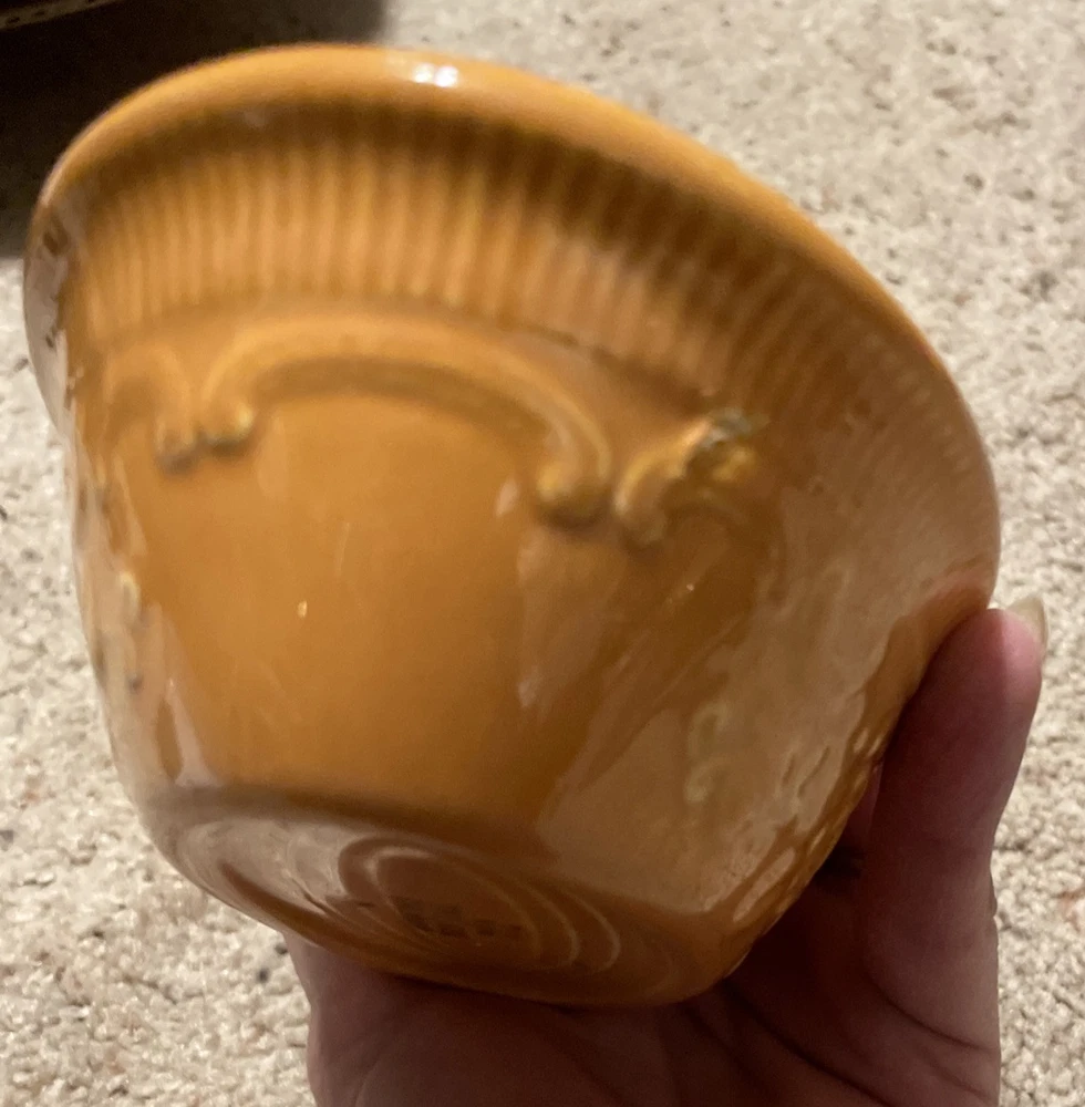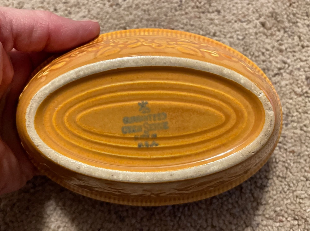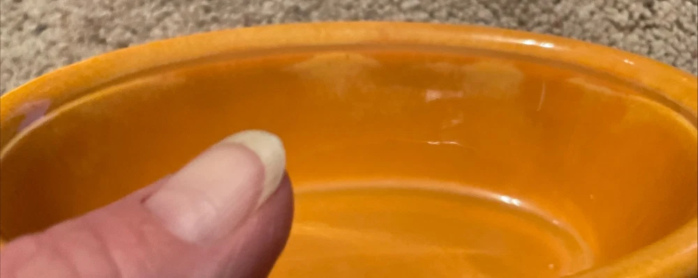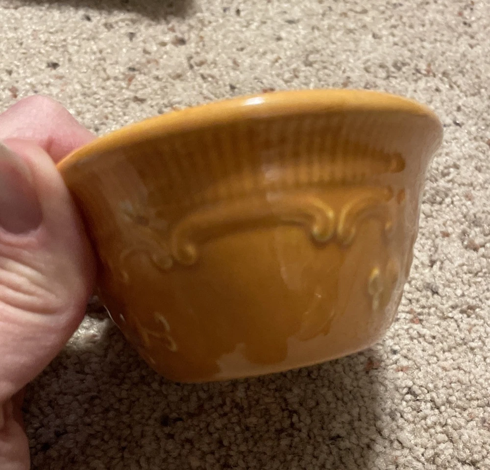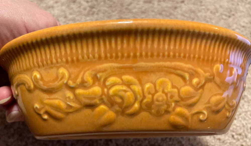 Vintage orange ceramic oval bowl with embossed floral pattern from the United States. Measuring 6.25" in diameter and 2" in depth, this mid-century modern bowl is part of a two-piece set. It features a glossy finish and a printed backstamp, showcasing its originality. Perfect for all occasions, this decorative piece by the brand oven serve adds a touch of retro charm to any setting. These bowls are used. One bowl shows some crazing and the other has an area on rim that looks like a manufacturer flaw where paint is missing. It is smooth and not a chip. See photos. One bowl does have some different shading. The pink showing on right side of bowls in the pictures is a light reflection from my computer and not on the bowl itself.