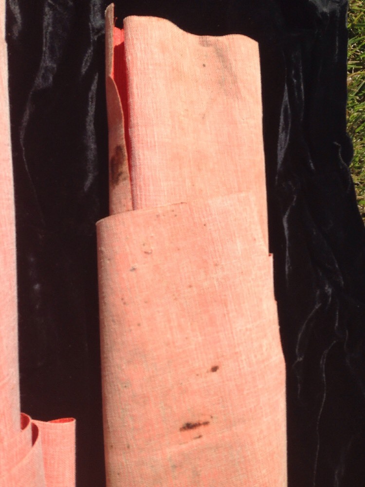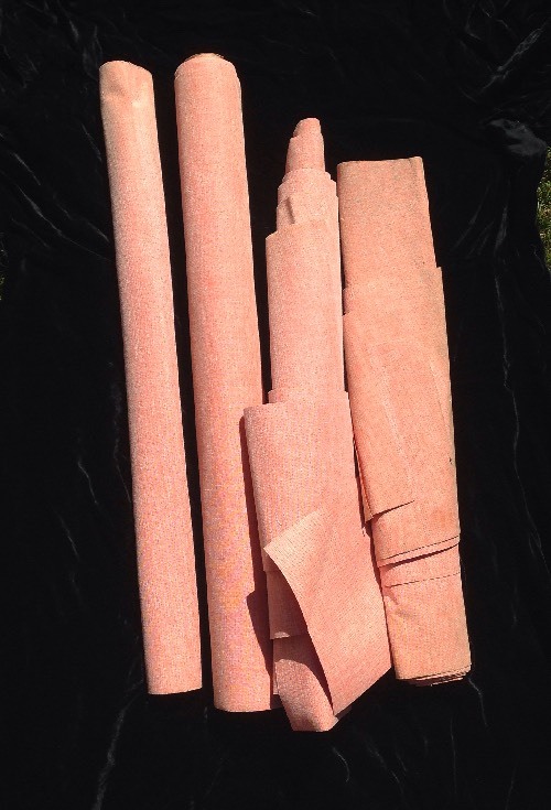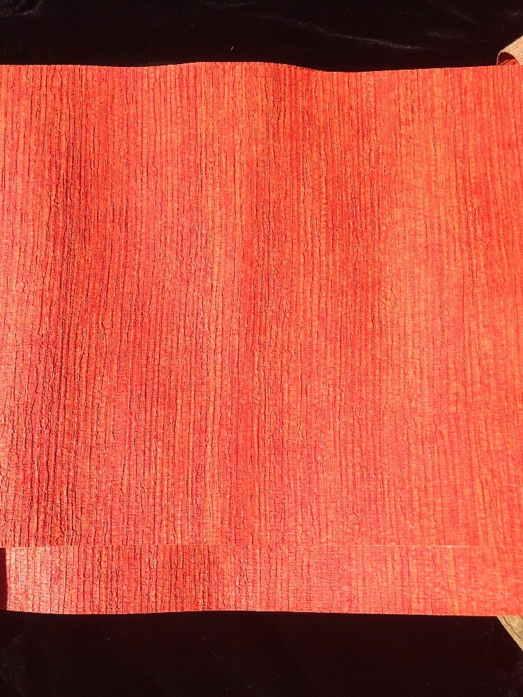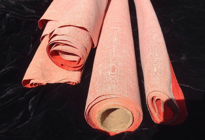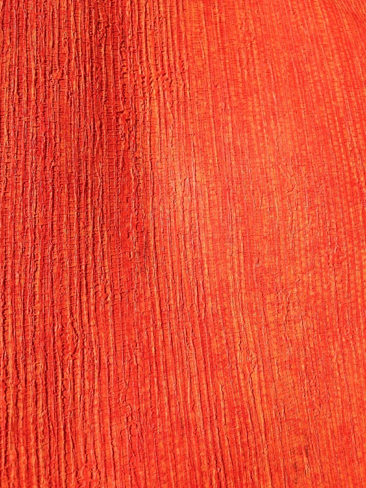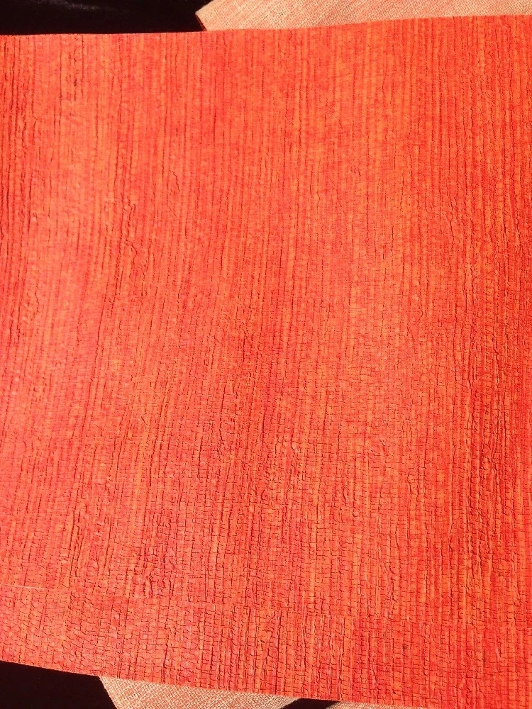 Unused but opened, orange grasscloth style textured wall paper. These are an estate find and come as found. There are three "rolls", none are whole, and one seems extra grubby, there are also smaller cut pieces. Color is a brilliant deep orange with darker striations of color mixed in. Rolls measure right around 26.5" in width, I will not unroll to measure actual length.