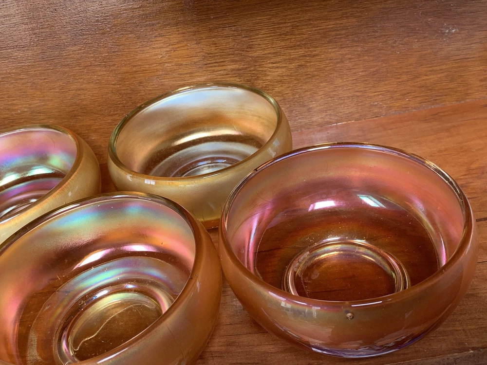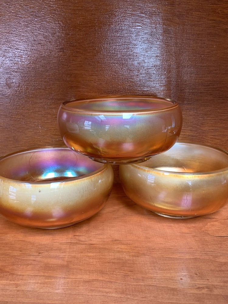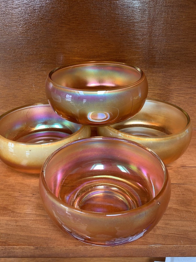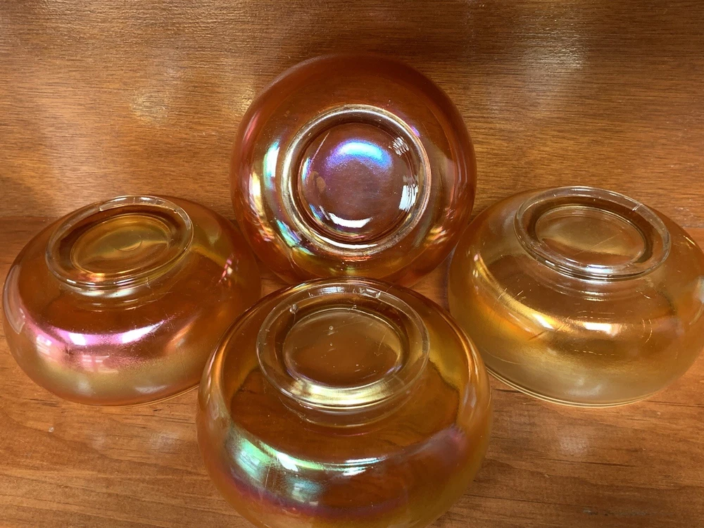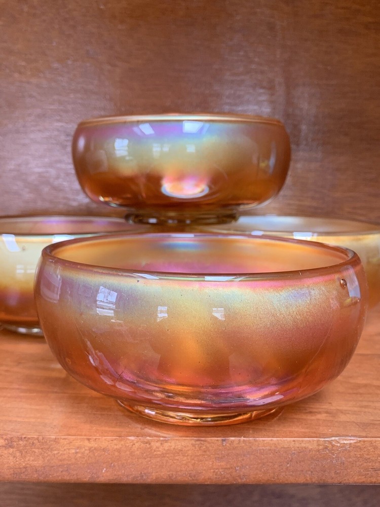 Orange Iridescent Carnival Glass Round Pressed Glass Bowl 2.5" Tall. 2.5" Tall x 5 1/4" Wide Beautiful orange iridescent pressed glass bowl. Unknown maker. 2.5" Tall x 5 1/4" Wide There are some scratches on the inside and out, flea bites and flaws from manufacturing. See photos for more.