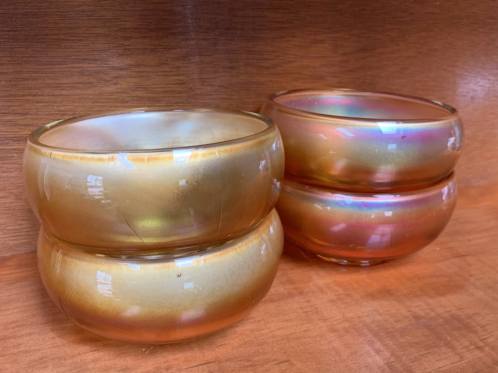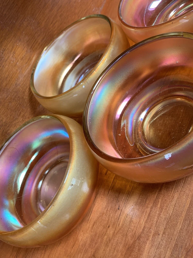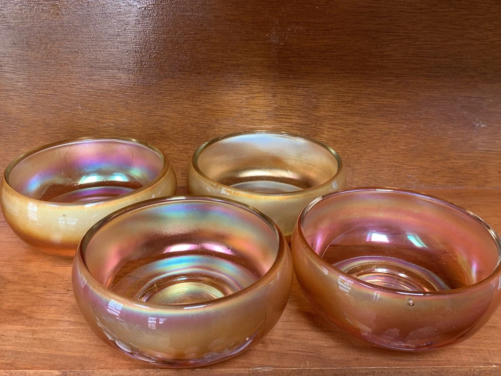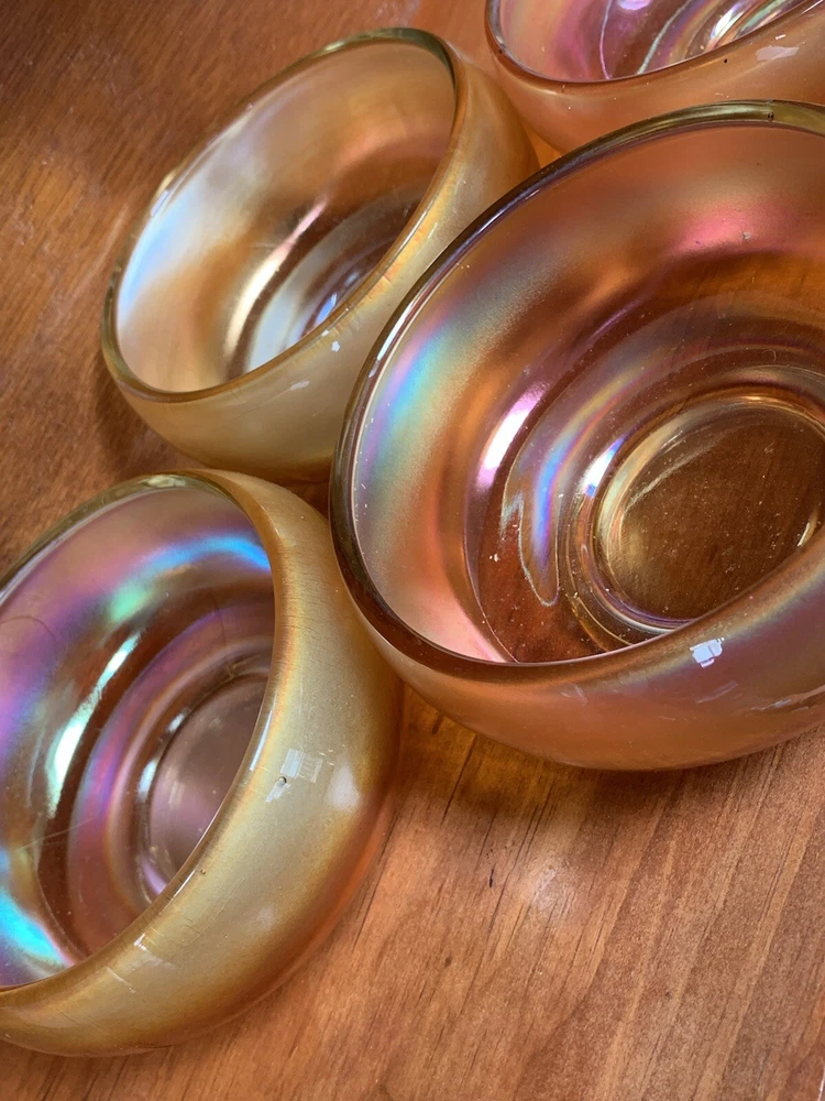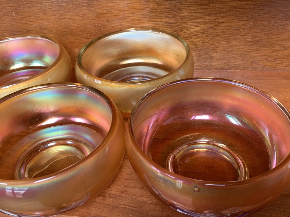 Orange Iridescent Carnival Glass Round Pressed Glass Bowl 2.5" Tall. 2.5" Tall x 5 1/4" Wide Beautiful orange iridescent pressed glass bowl. Unknown maker. 2.5" Tall x 5 1/4" Wide There are some scratches on the inside and out, flea bites and flaws from manufacturing. See photos for more.