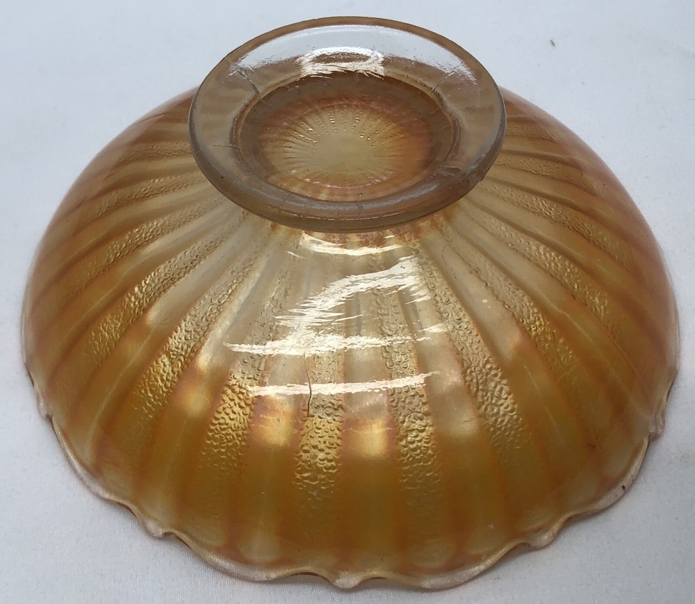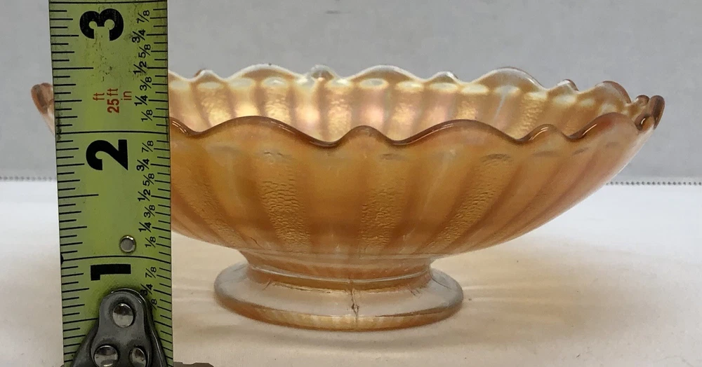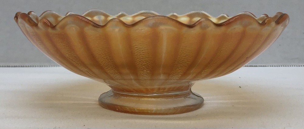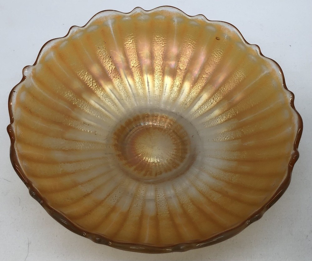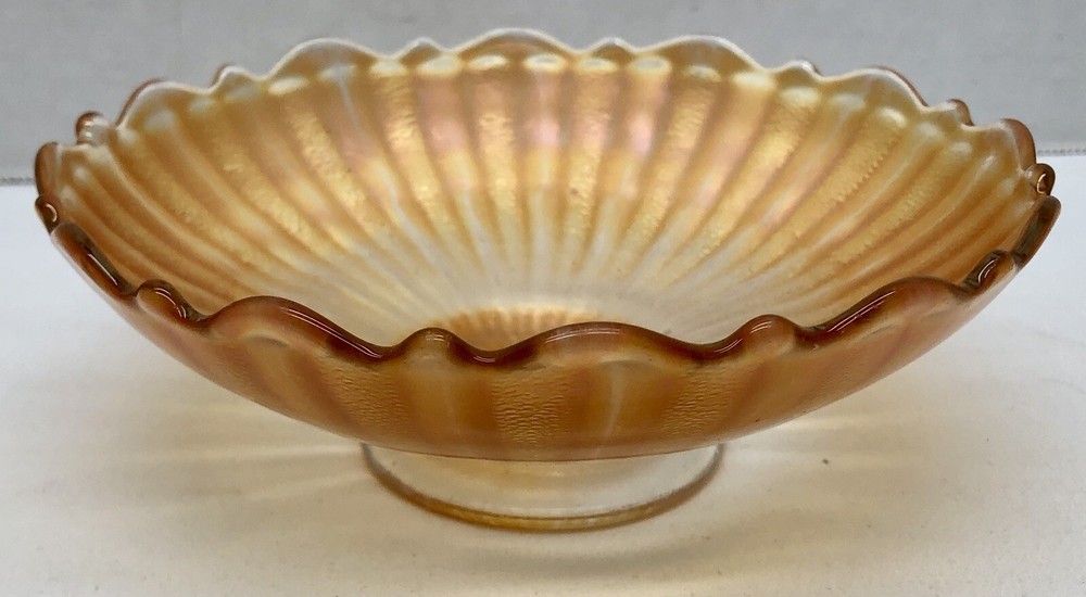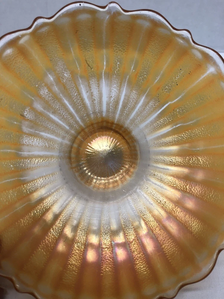 This vintage orange marigold carnival glass bowl is a beautiful addition to any mid-century modern collection. The scalloped edges and pedestal base give it a unique touch, while the vibrant orange color adds a pop of color to any decor. This bowl is made of high-quality glass and features a carnival glass production style. It is unmarked, but the brand doesn't affect the beauty and value of this piece. It's perfect for serving or display, and its vintage charm will definitely impress. Great Condition! See pics for condition and details