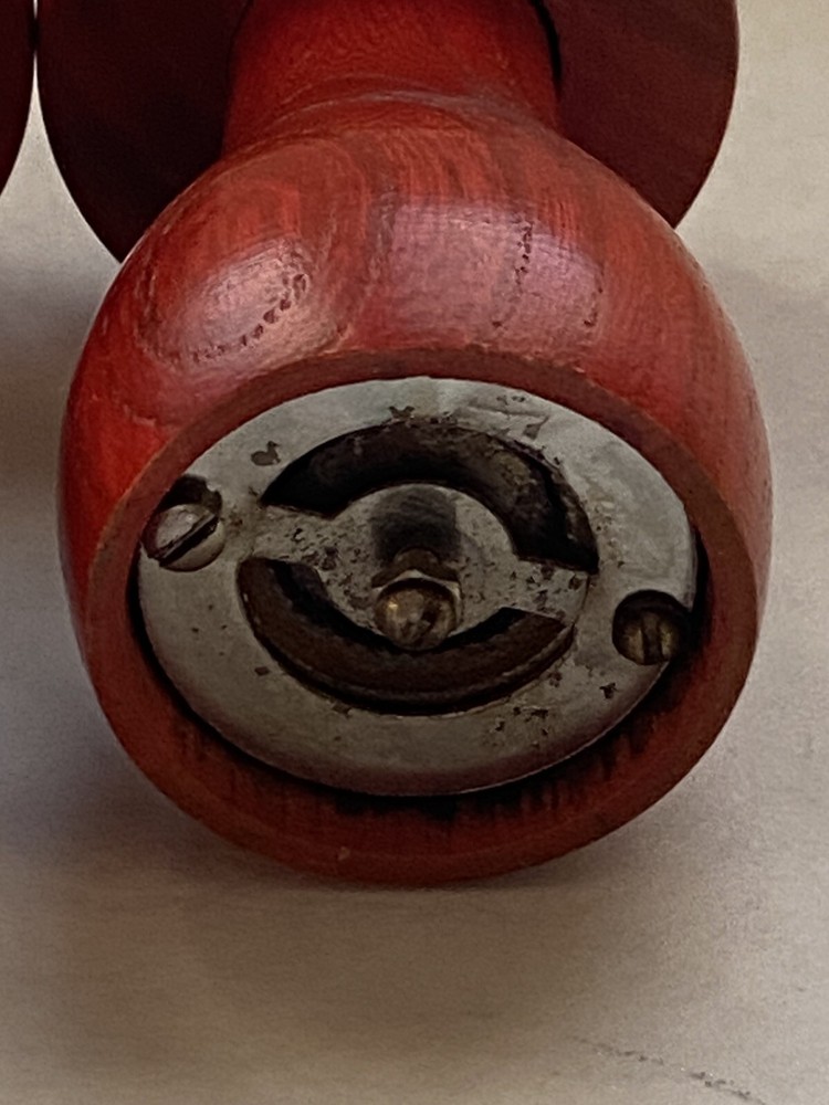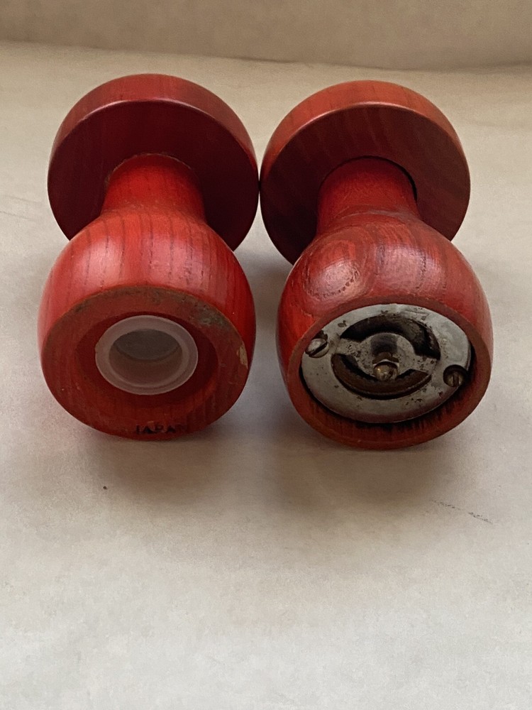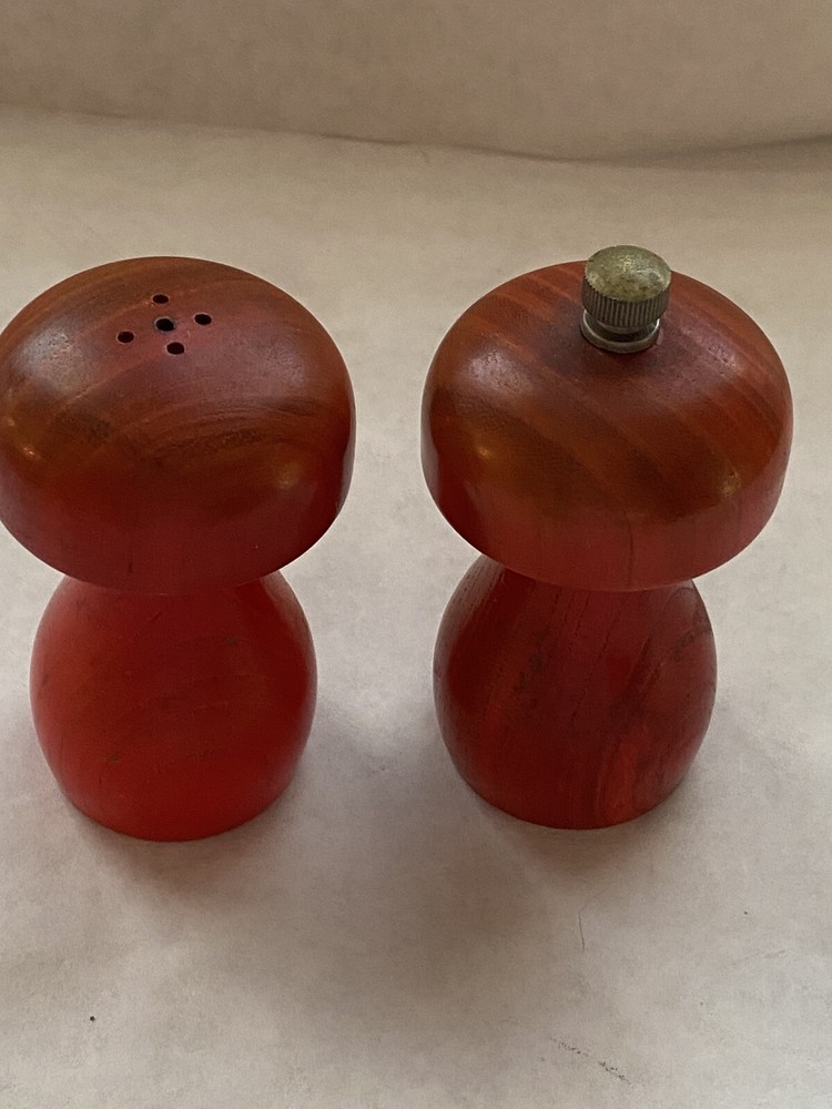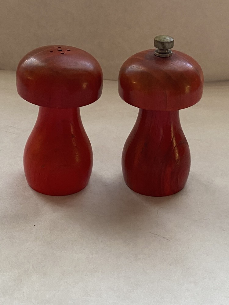 Spice up your kitchen with this vintage Mid Century Modern mushroom salt and pepper set. The orange wood tone and solid pattern make these shakers perfect for all occasions. The set includes a pepper shaker and salt shaker, both shaped like mushrooms. These original, non-antique shakers are a great addition to any Mid-Century Modernism collection. The matching set features and is made in the Japan.Get your hands on this unique set today and add a touch of retro charm to your dining table.