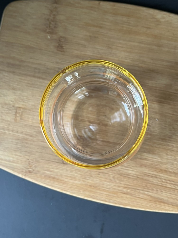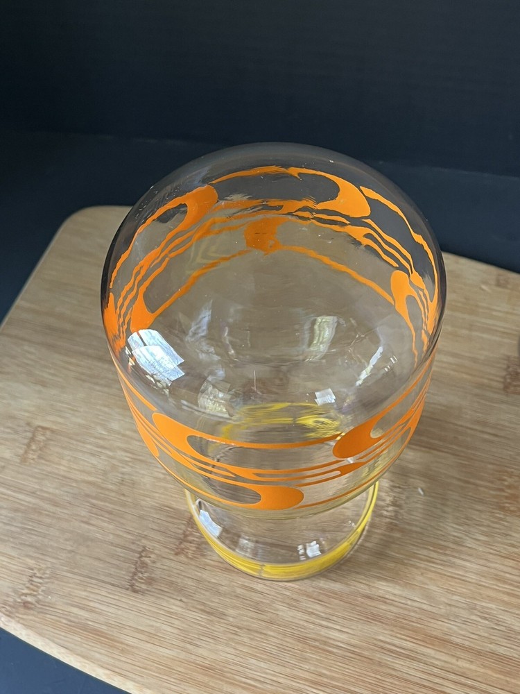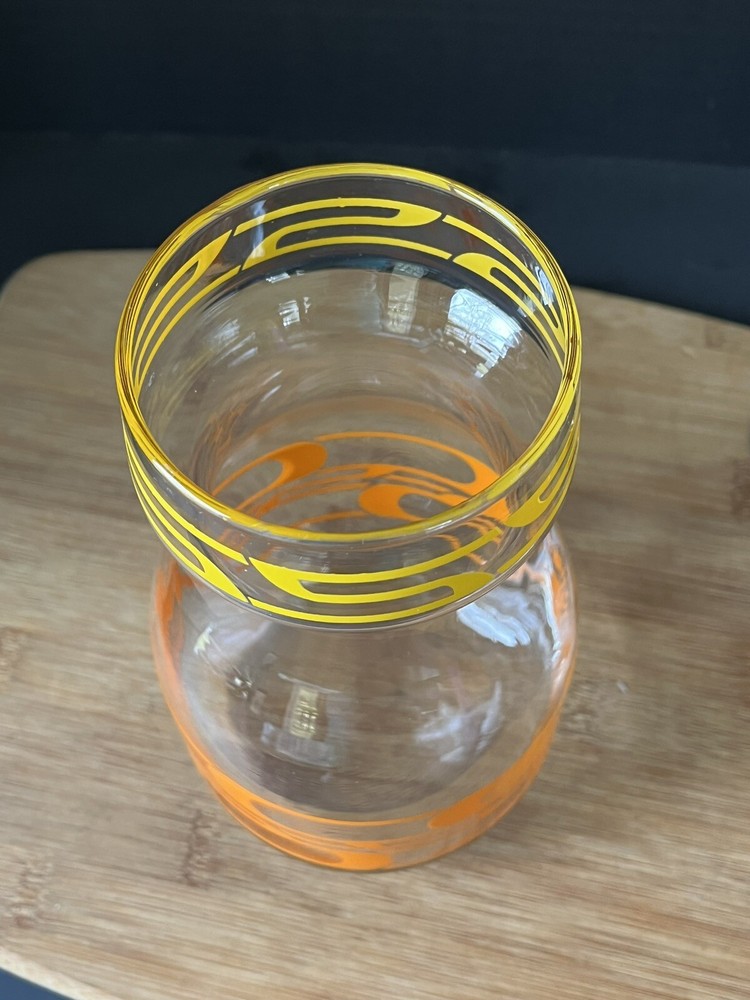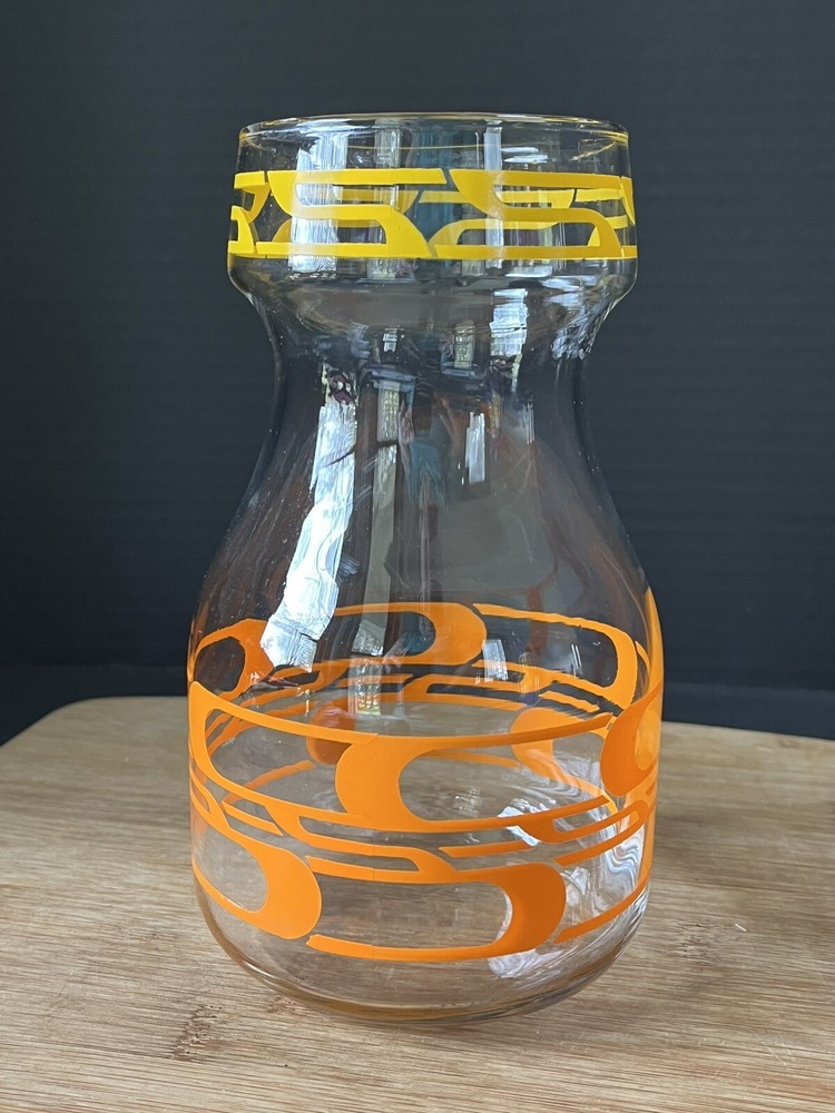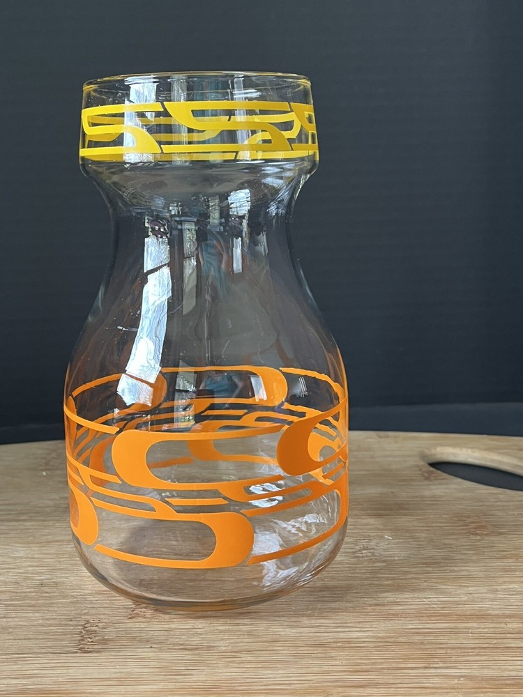 Elevate your barware collection with this vintage mid-century modern glass juice container from Libbey's Century product line. The ombre geometric abstract design in clear orange and yellow adds a pop of color to any bar or kitchen. This decanter has a quart capacity, making it perfect for serving your favorite drinks to guests. Crafted from high-quality glass, this vintage decanter has a timeless appeal, making it a must-have for those who love mid-century modern style. Add this unique and vibrant piece to your collection today. No chips or cracks.
