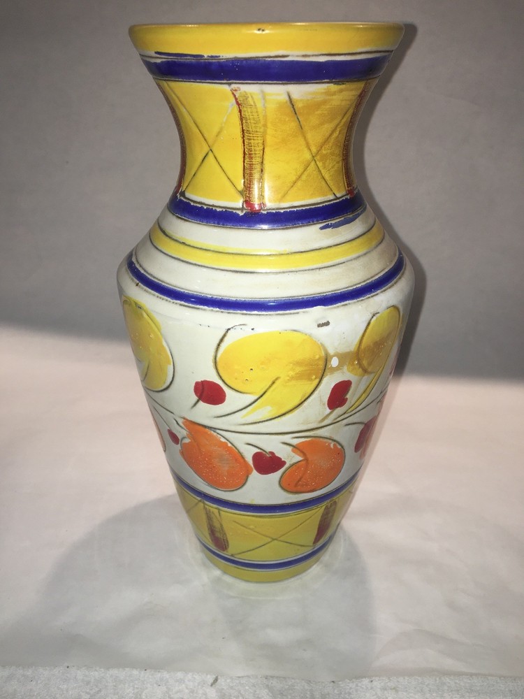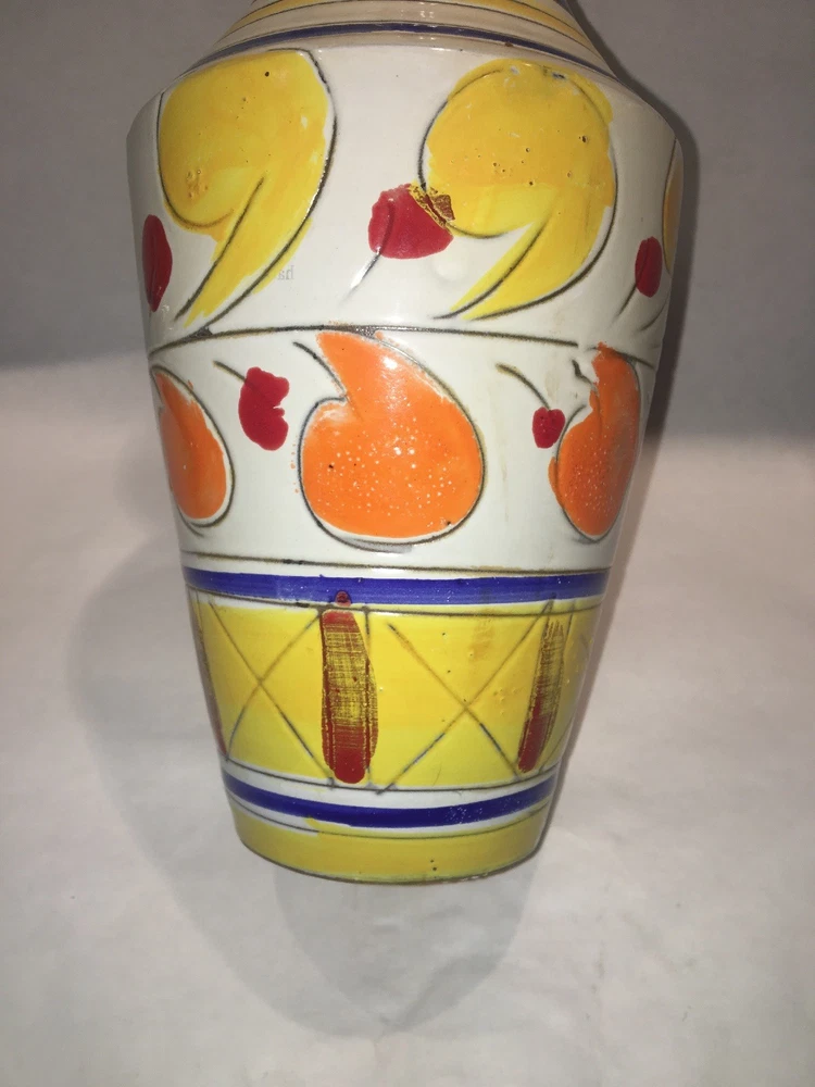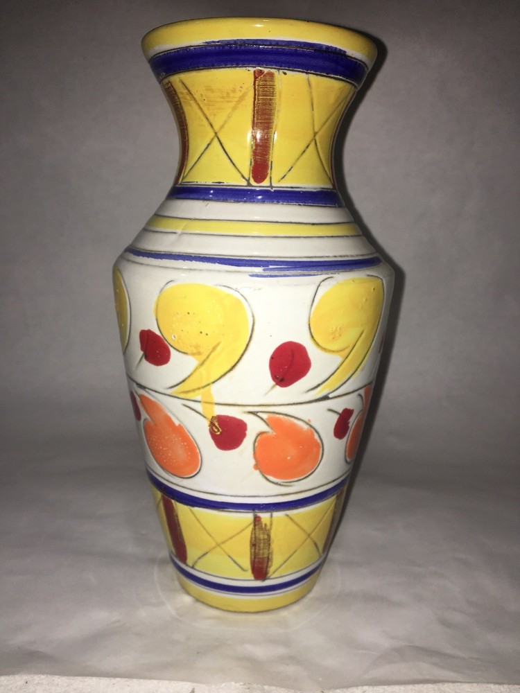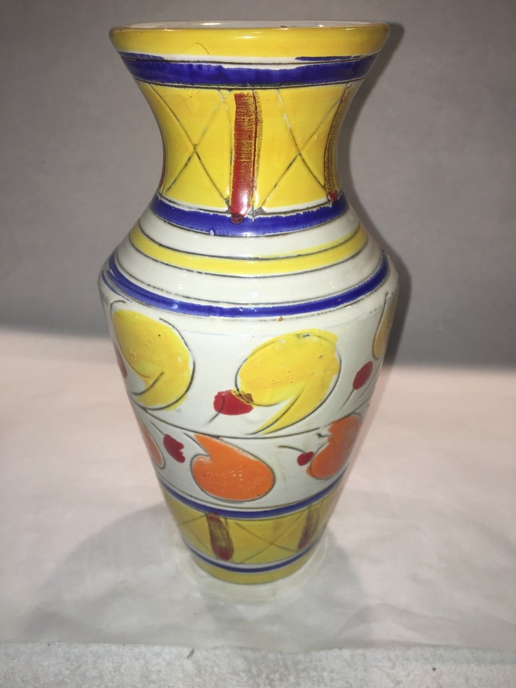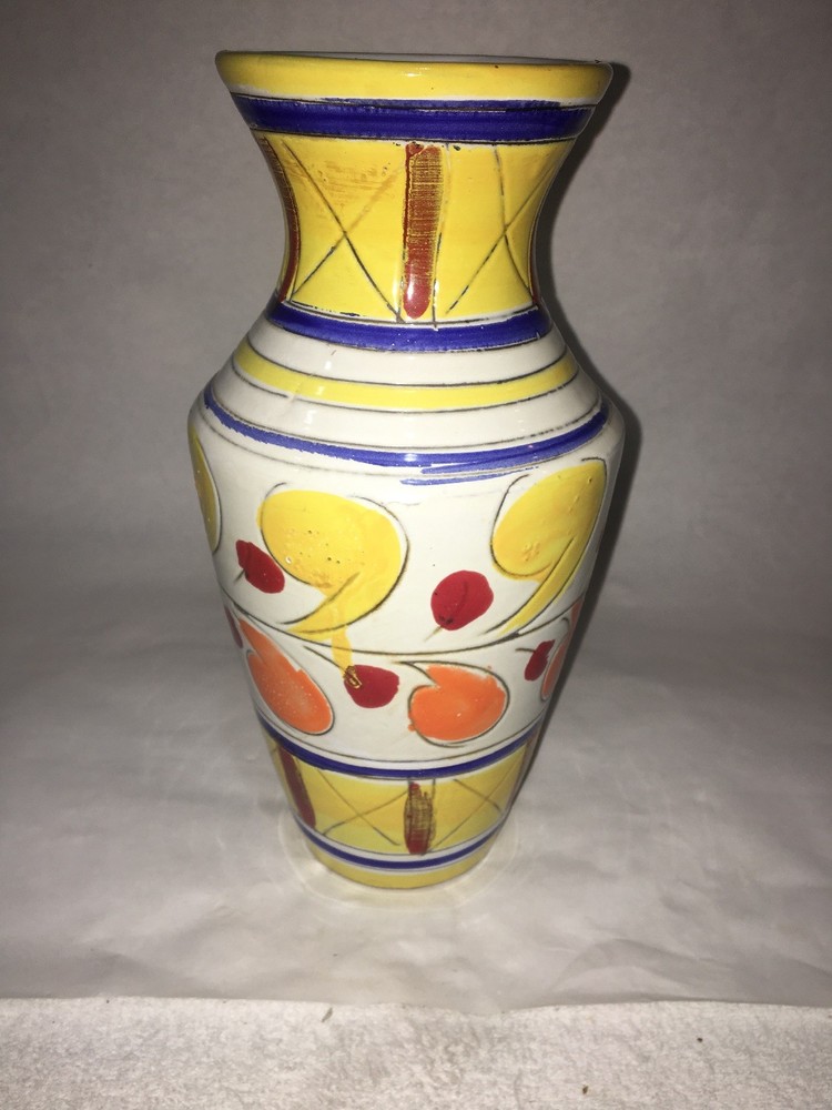 Vintage Orange Yellow Italian Pottery Vase Mid Century Modern Nice vintage colorful Italian pottery vase. Maker unknown. Stands about 9.5” tall and 3.75” diameter at mouth opening x 5” at widest. No cracks or chips or crazing. There are some imperfections to the ceramic typical with these pieces (lots of glaze pops for example). I believe the piece looks very nice despite these minor issues. Please see pics to make your own determination. Stamped “Italy” on the underside so I can't say exactly. It will weigh about 4 lbs packed safely. Thank you!
