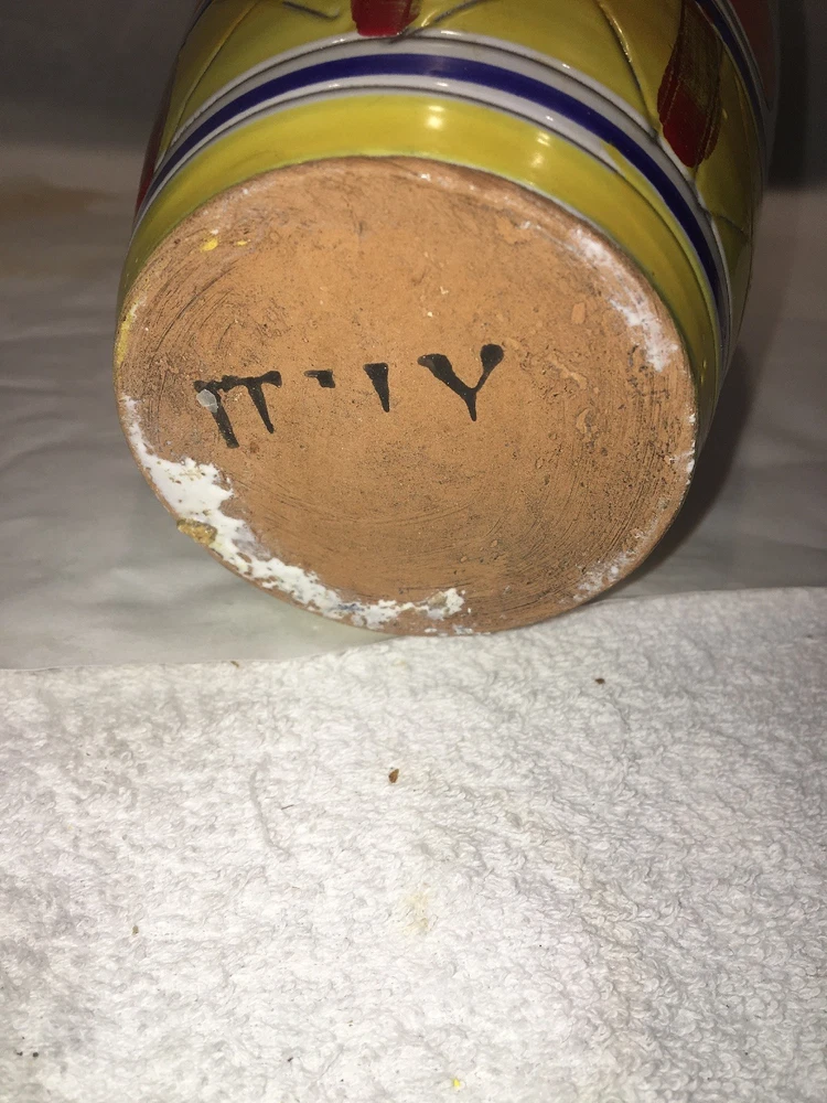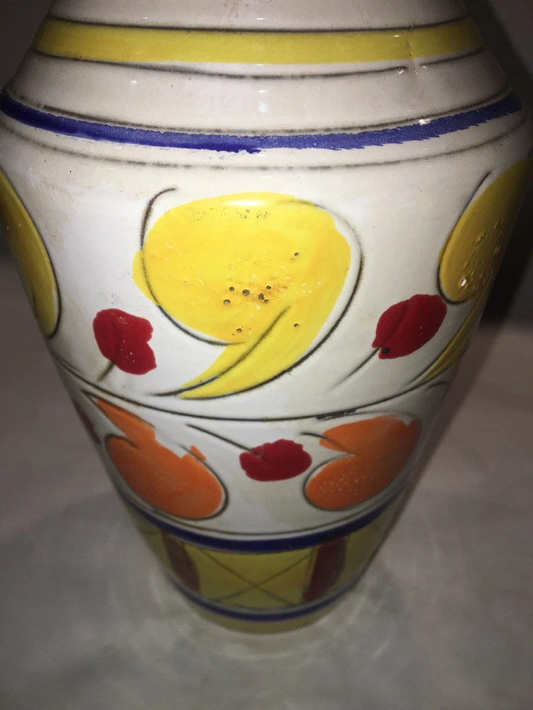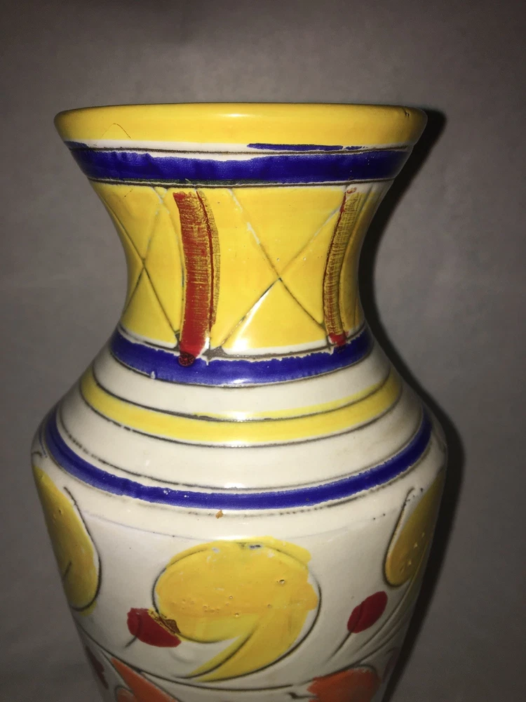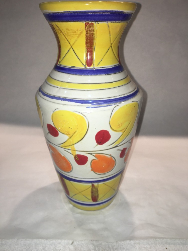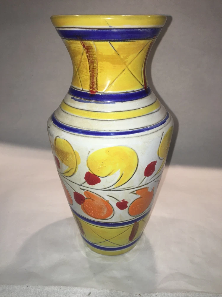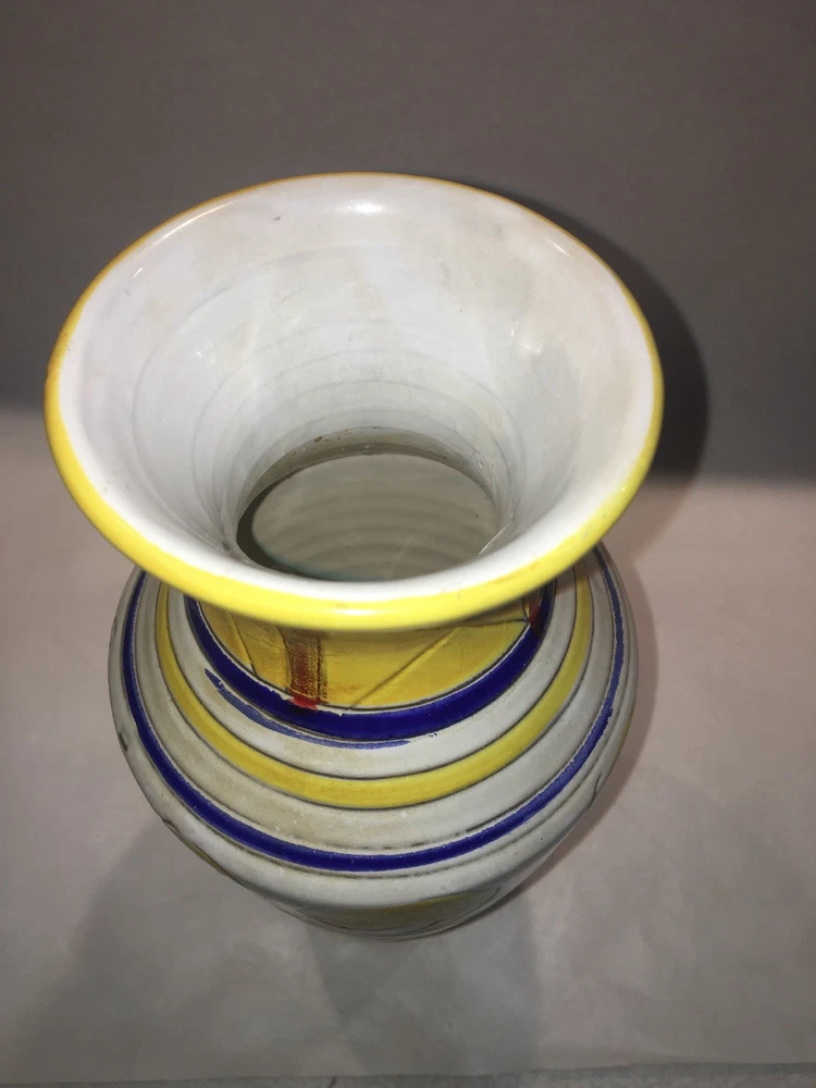 Vintage Orange Yellow Italian Pottery Vase Mid Century Modern Nice vintage colorful Italian pottery vase. Maker unknown. Stands about 9.5” tall and 3.75” diameter at mouth opening x 5” at widest. No cracks or chips or crazing. There are some imperfections to the ceramic typical with these pieces (lots of glaze pops for example). I believe the piece looks very nice despite these minor issues. Please see pics to make your own determination. Stamped “Italy” on the underside so I can't say exactly. It will weigh about 4 lbs packed safely. Thank you!