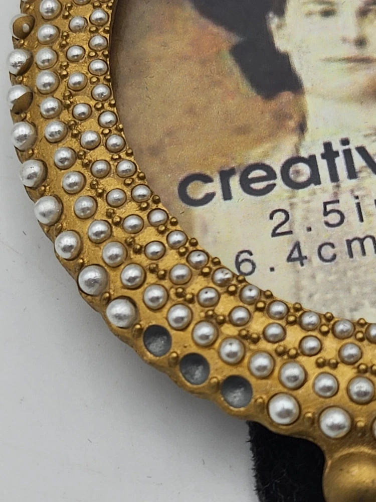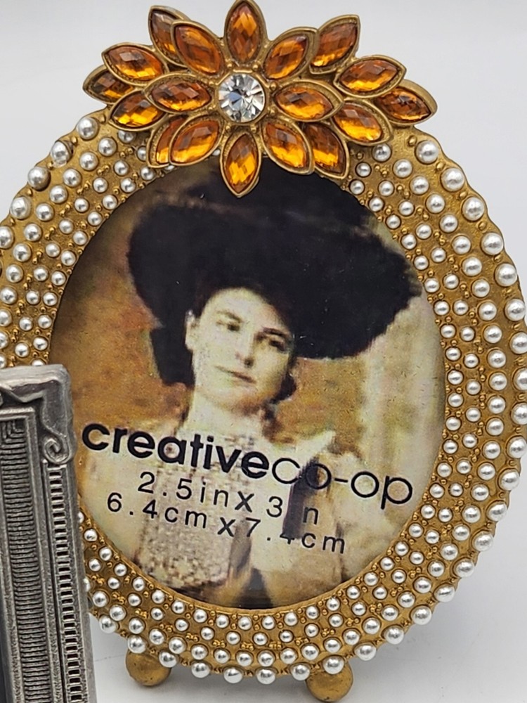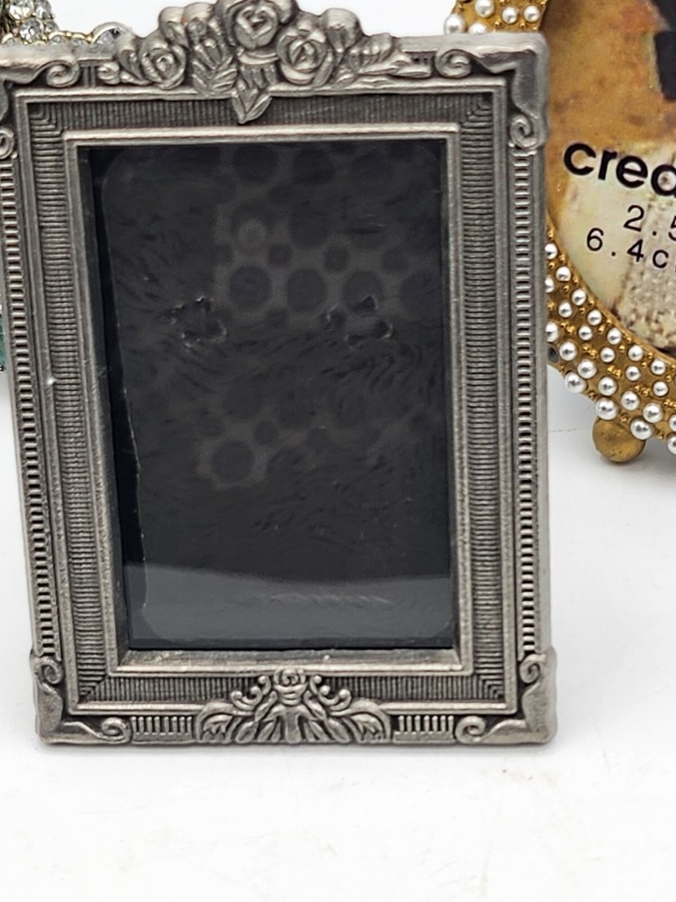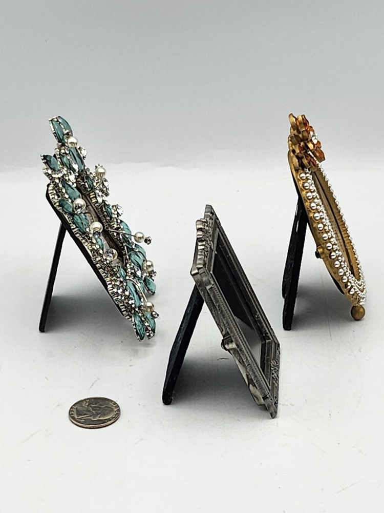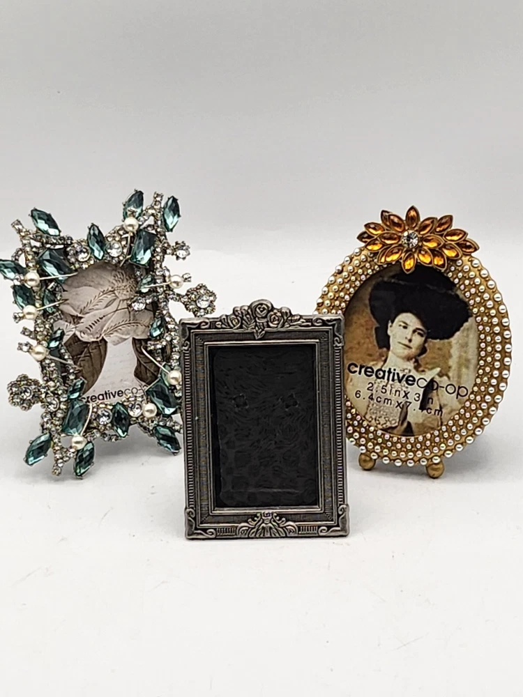 This vintage set of three small photo frames from Creative Co-Op is a beautiful addition to any collection. The frames are ornate and feature a jeweled finish, with a clear glass insert to protect your precious memories. They are designed to be rear-loading and can be easily inserted into any room, thanks to their small size of 3.5 x 5 inches. The frames are made of metal and have a vertical orientation, with a multicolor design that is perfect for all occasions. They are original and come from an unknown country or region of manufacture. The frames are sold as a unit quantity of three, and are perfect for collectors or anyone looking to add some unique decor to their home. 4.25 x 4", 4.4 x 3.25", 3.5 x 2.3". 2 have glass and 1 has plastic. Oval frame is missing 3 tiny pearls. See photos.