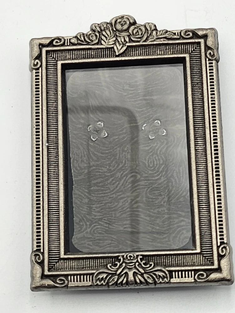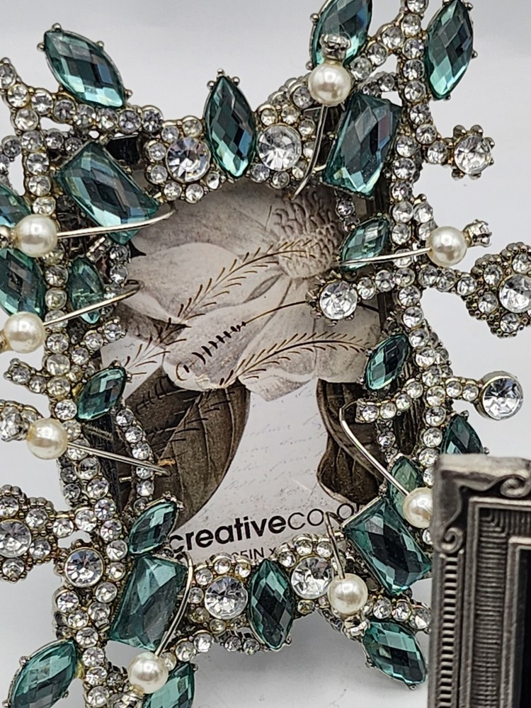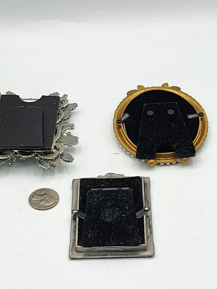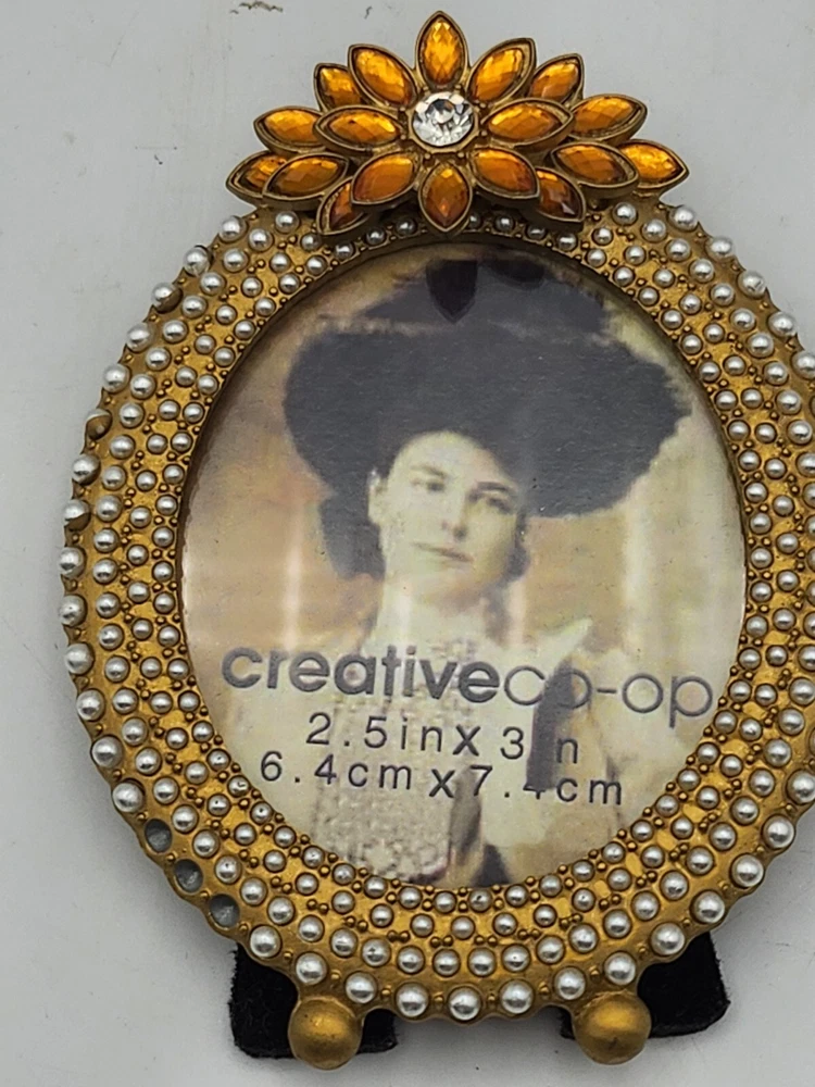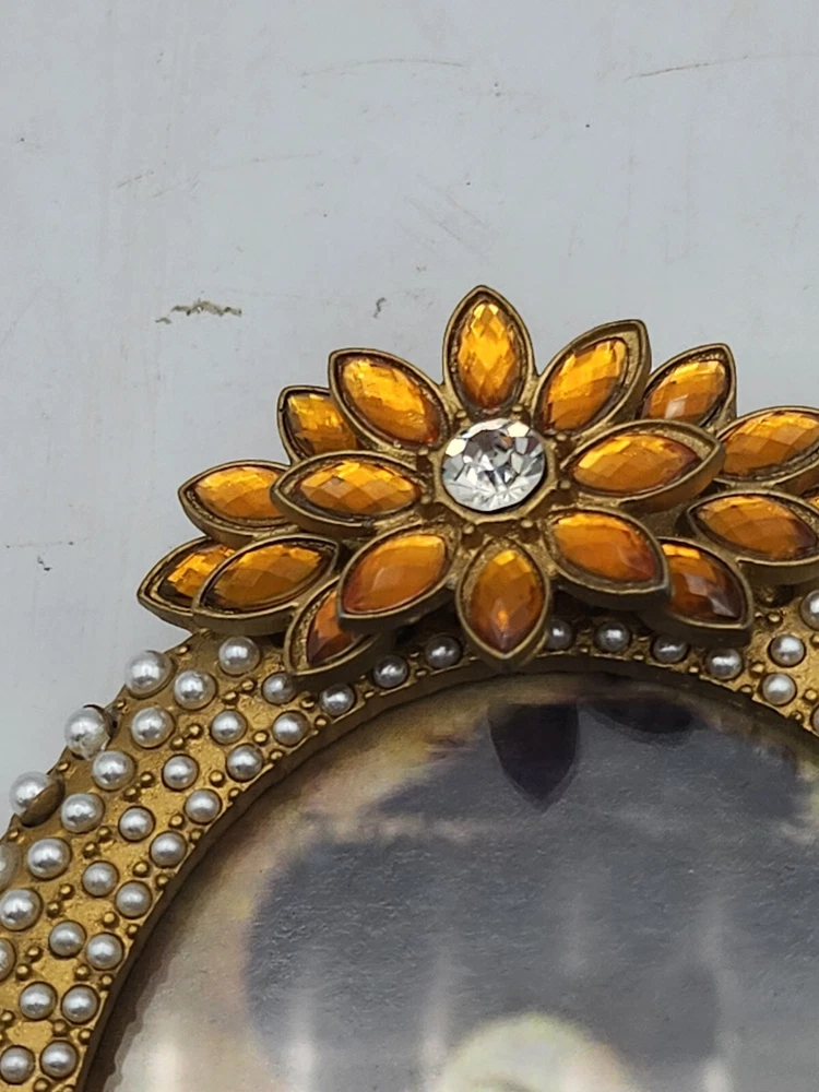 This vintage set of three small photo frames from Creative Co-Op is a beautiful addition to any collection. The frames are ornate and feature a jeweled finish, with a clear glass insert to protect your precious memories. They are designed to be rear-loading and can be easily inserted into any room, thanks to their small size of 3.5 x 5 inches. The frames are made of metal and have a vertical orientation, with a multicolor design that is perfect for all occasions. They are original and come from an unknown country or region of manufacture. The frames are sold as a unit quantity of three, and are perfect for collectors or anyone looking to add some unique decor to their home. 4.25 x 4", 4.4 x 3.25", 3.5 x 2.3". 2 have glass and 1 has plastic. Oval frame is missing 3 tiny pearls. See photos.